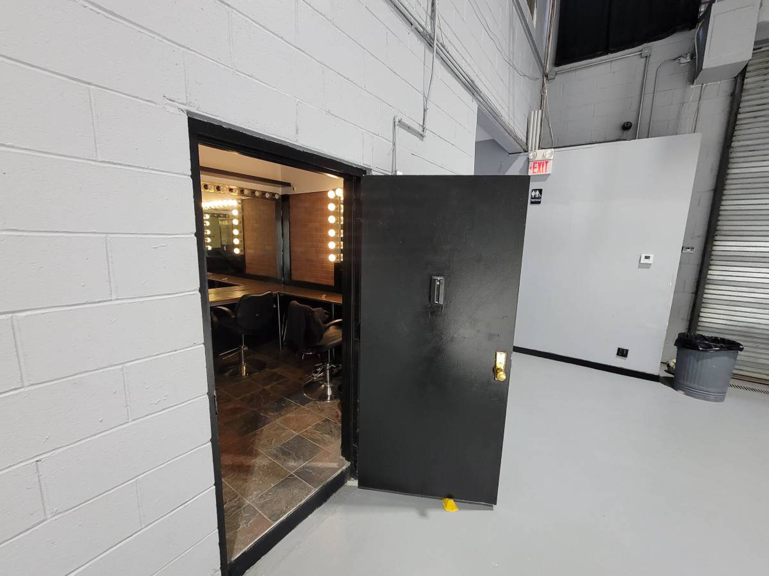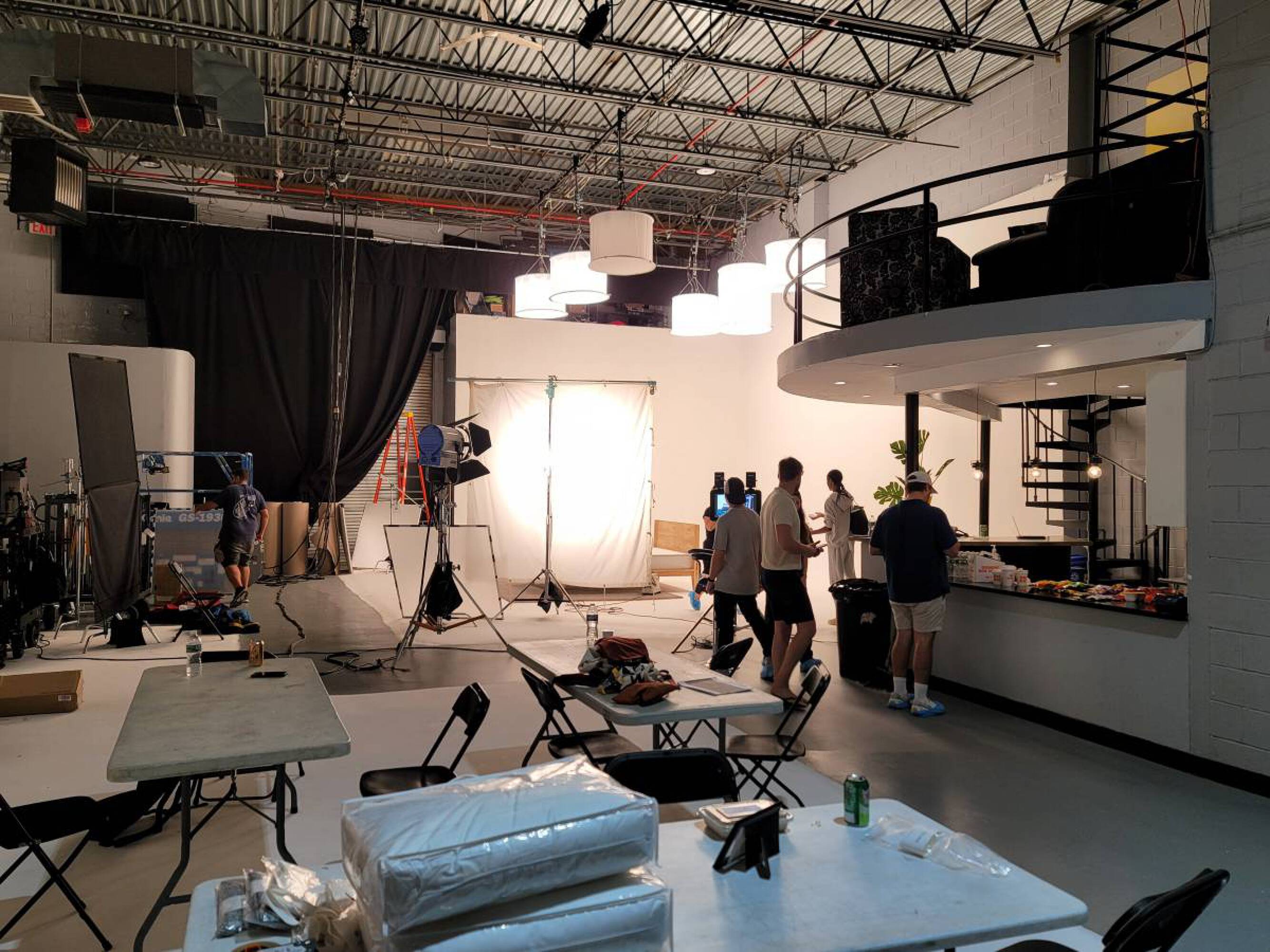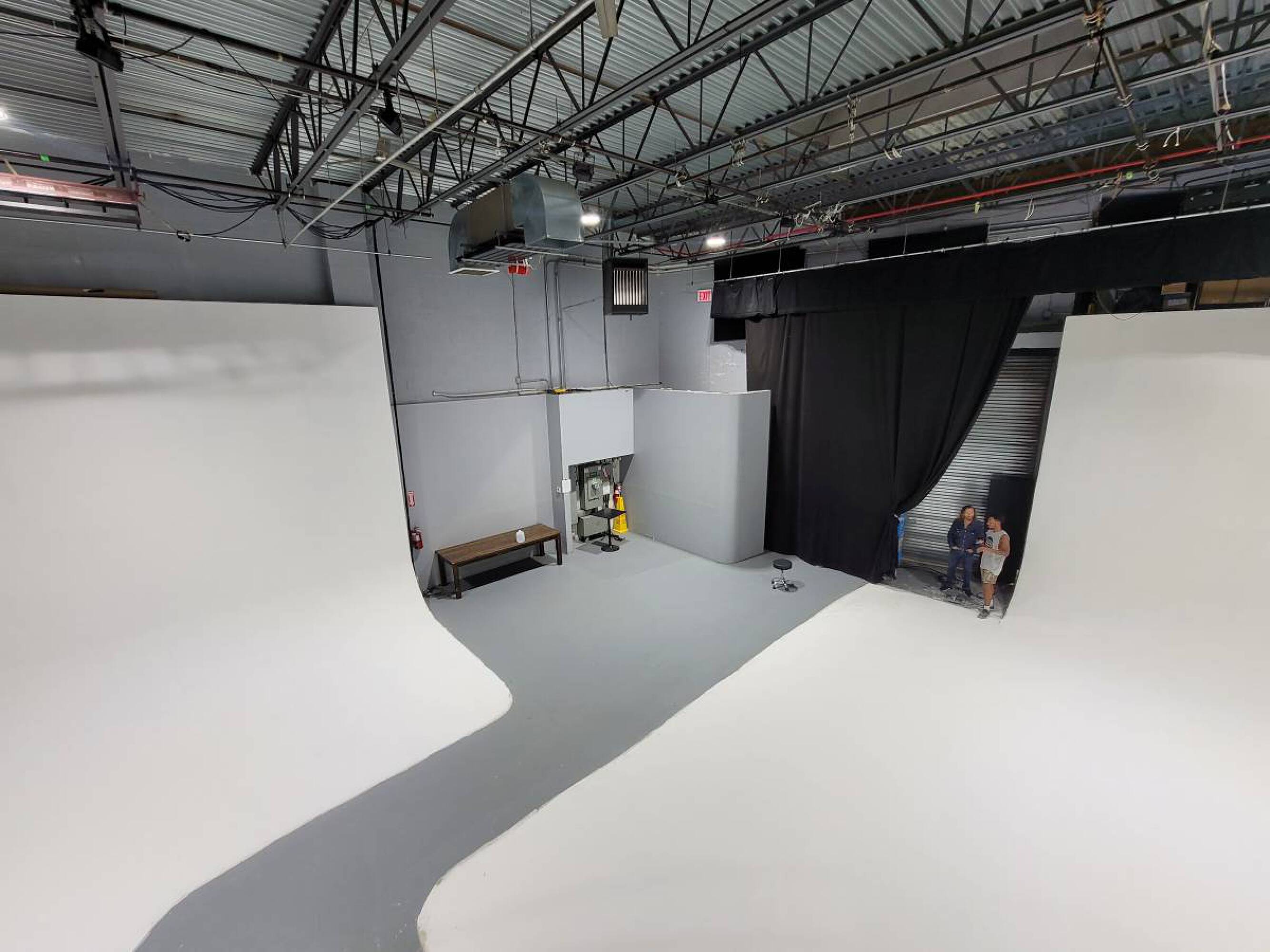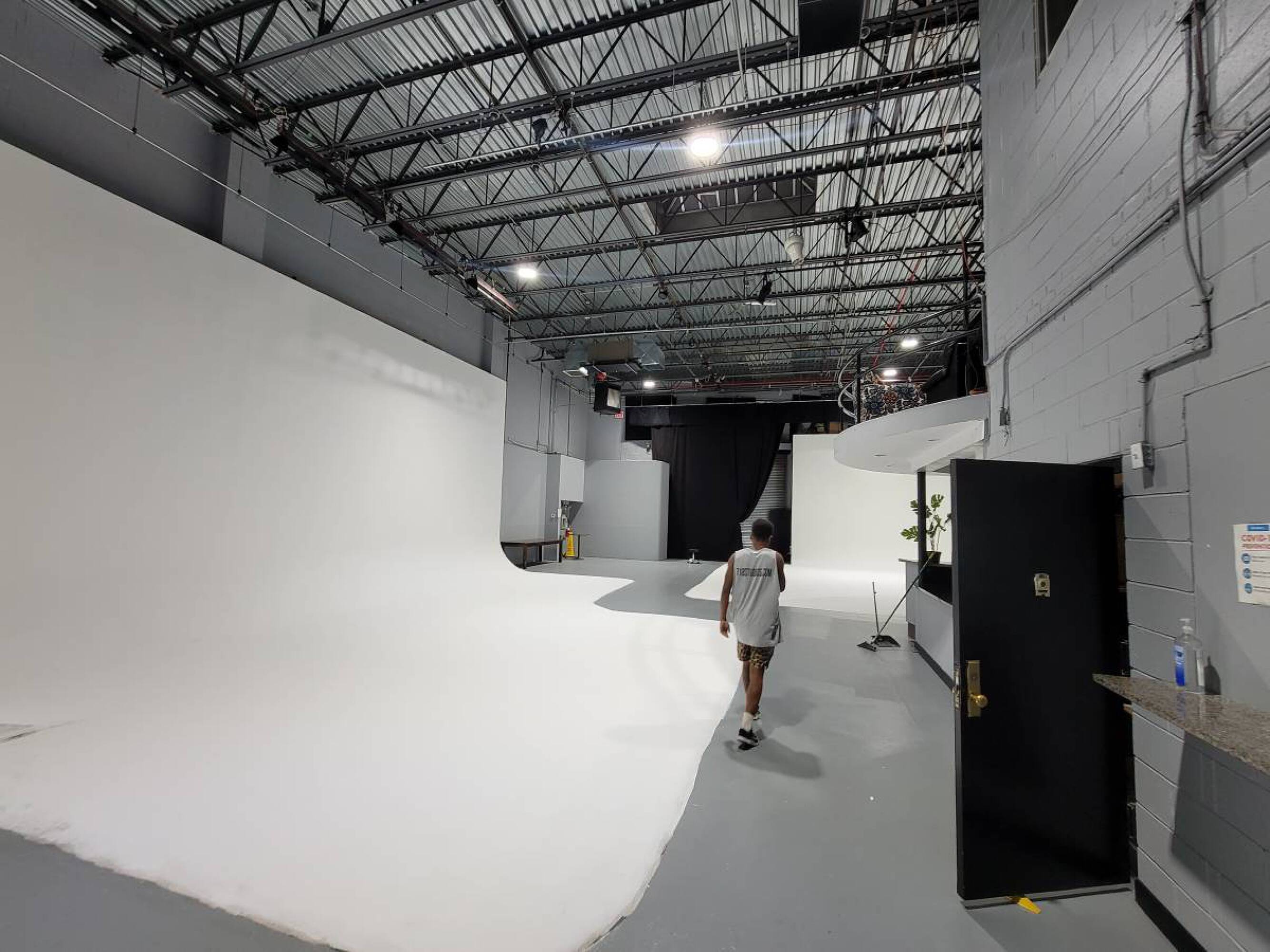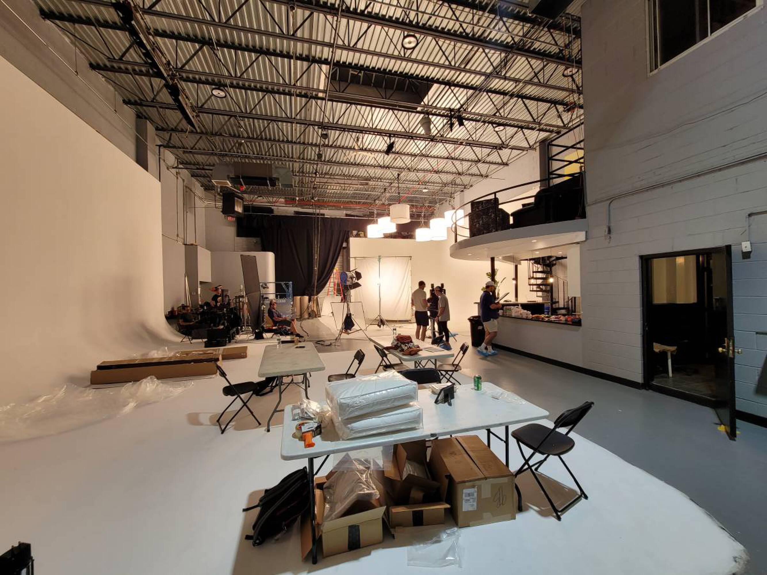 Versatile commercial space with high ceilings, kitchen, and drive-in gates.