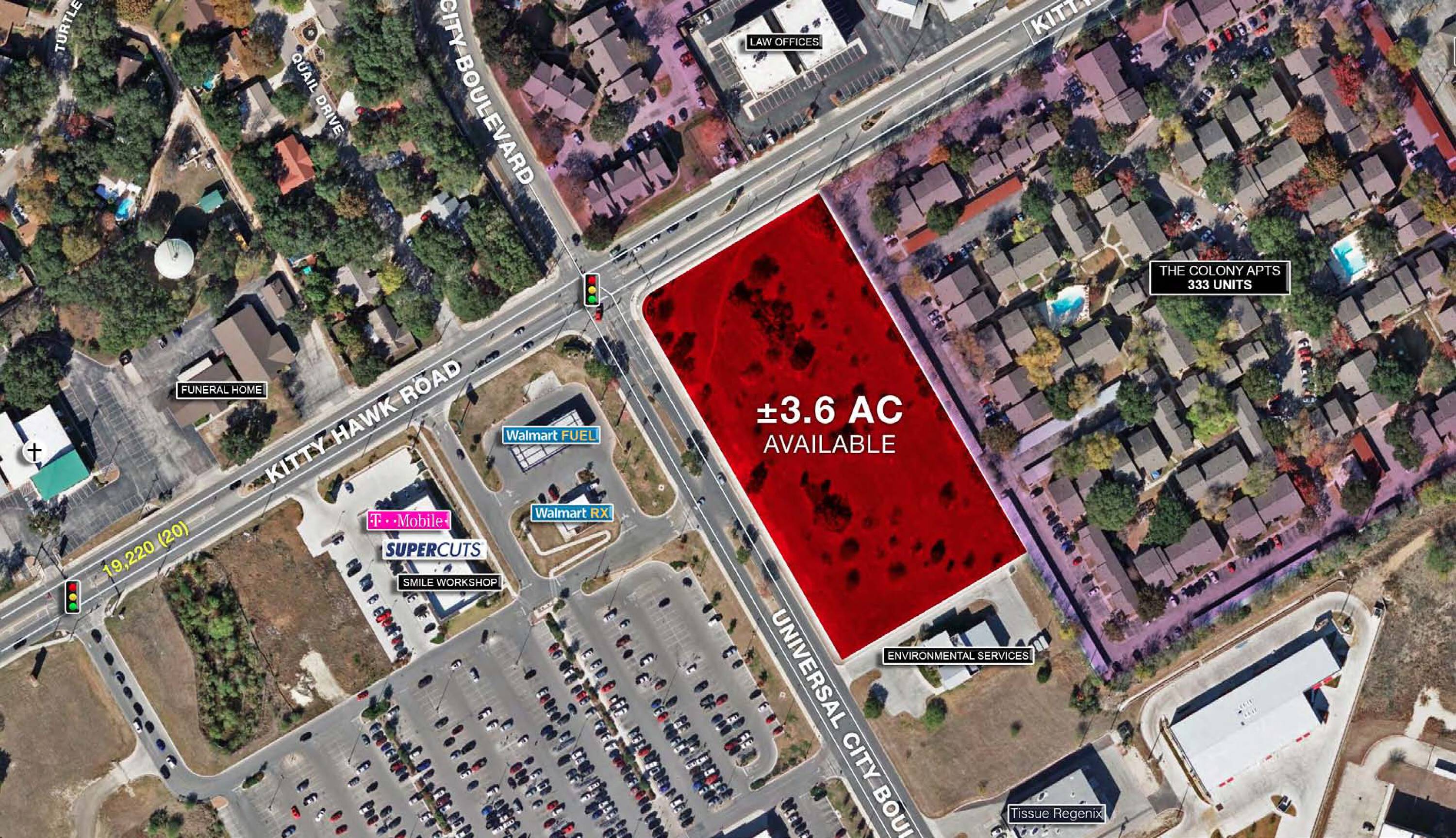 Land is available for sale at the intersection of Kitty Hawk Road and Universal City Boulevard in Universal City, Texas.