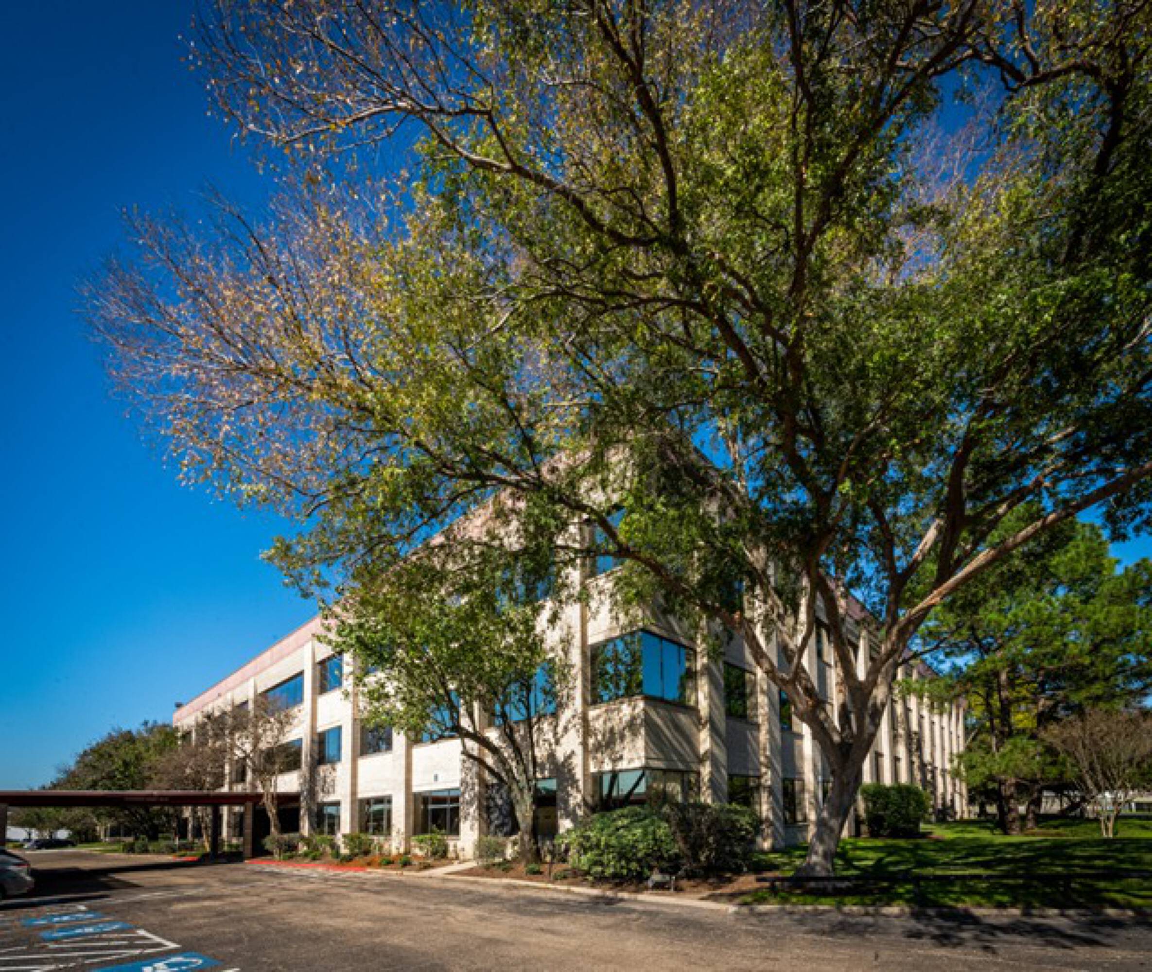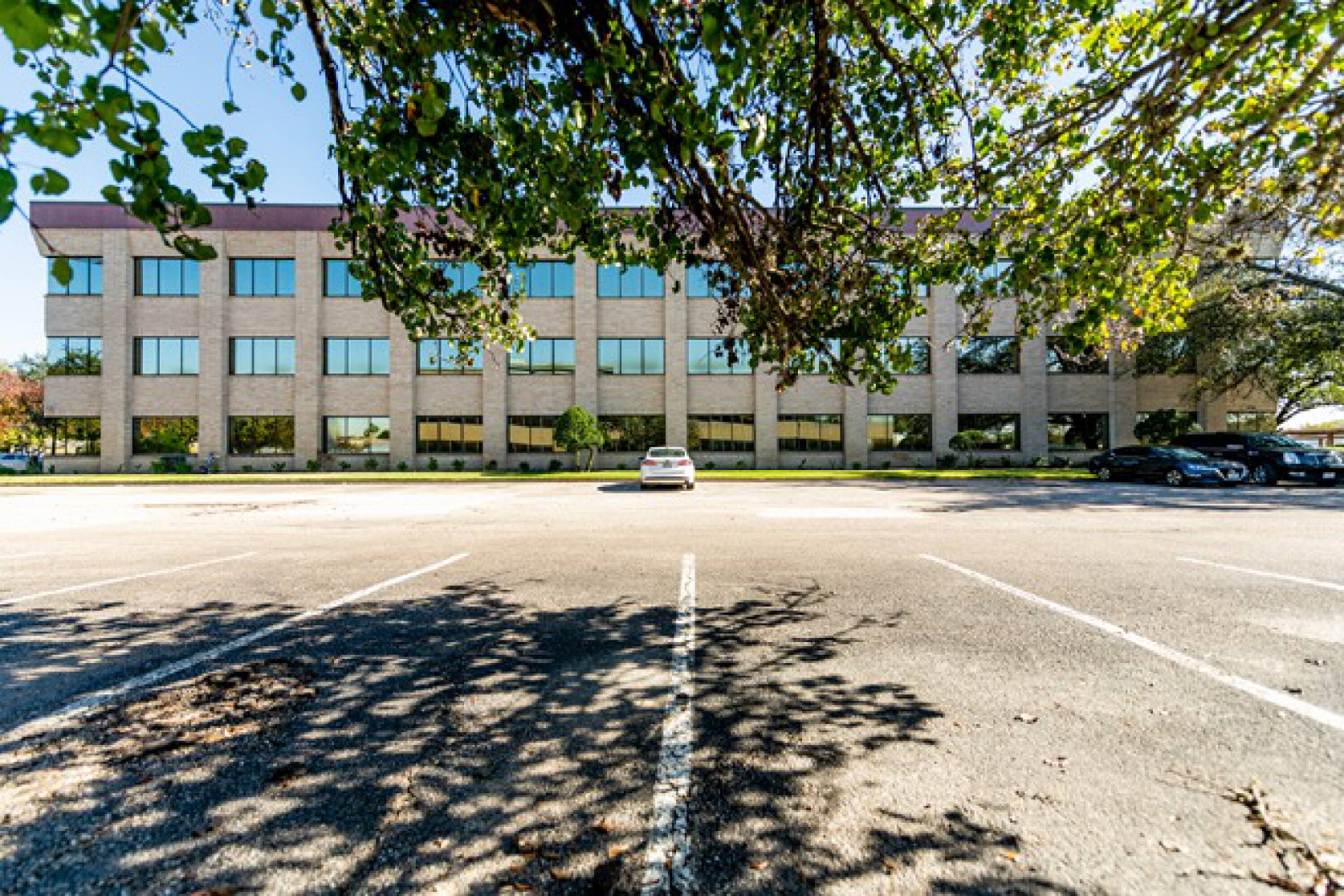 Three-story office building with landscaped lobby and ample parking.