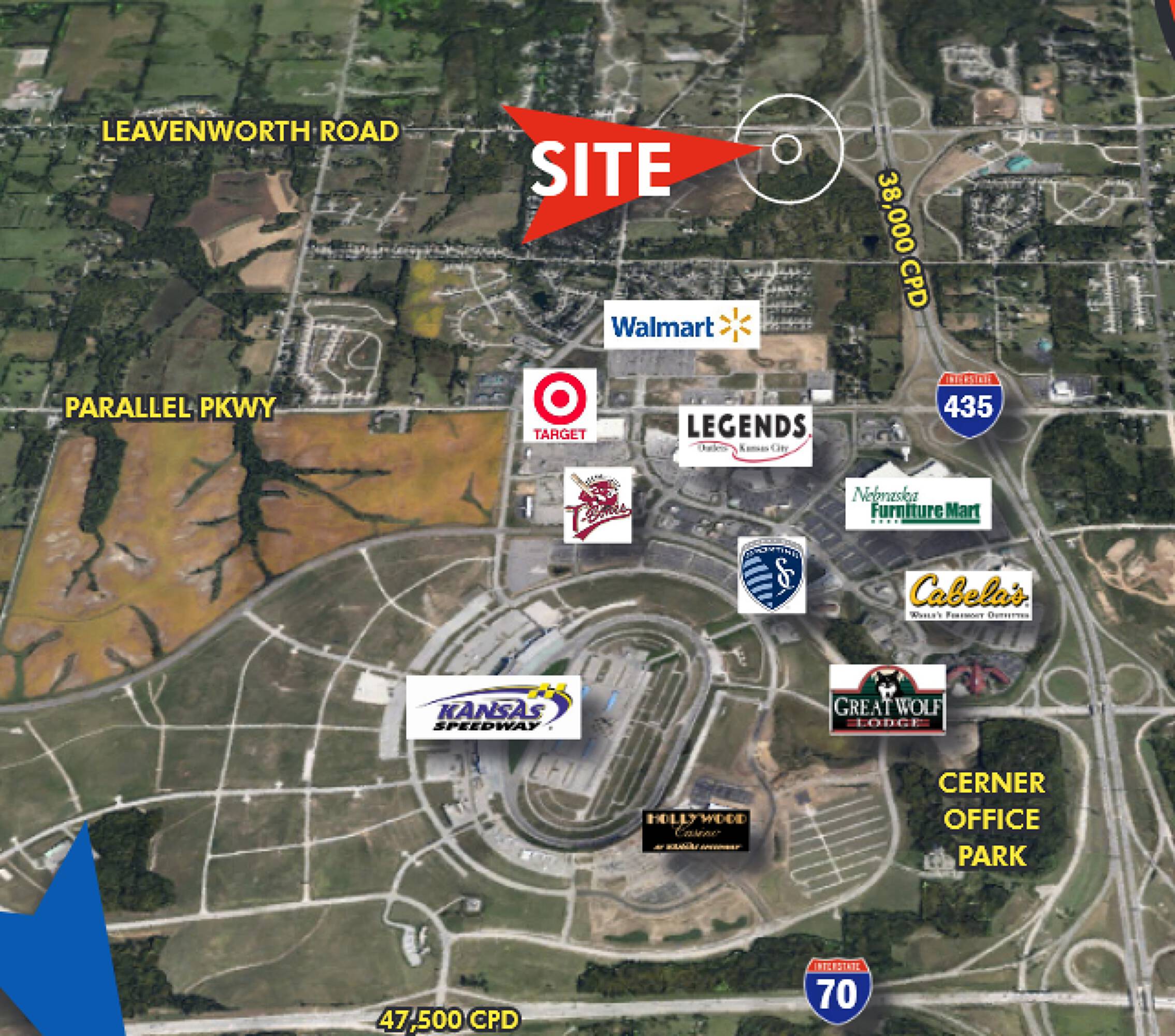 This property features: Excellent visibility and easy access from I‑435.; Located on the southwest corner of I‑435 and Leavenworth Road.; Part of planned 46‑acre mixed‑use project.