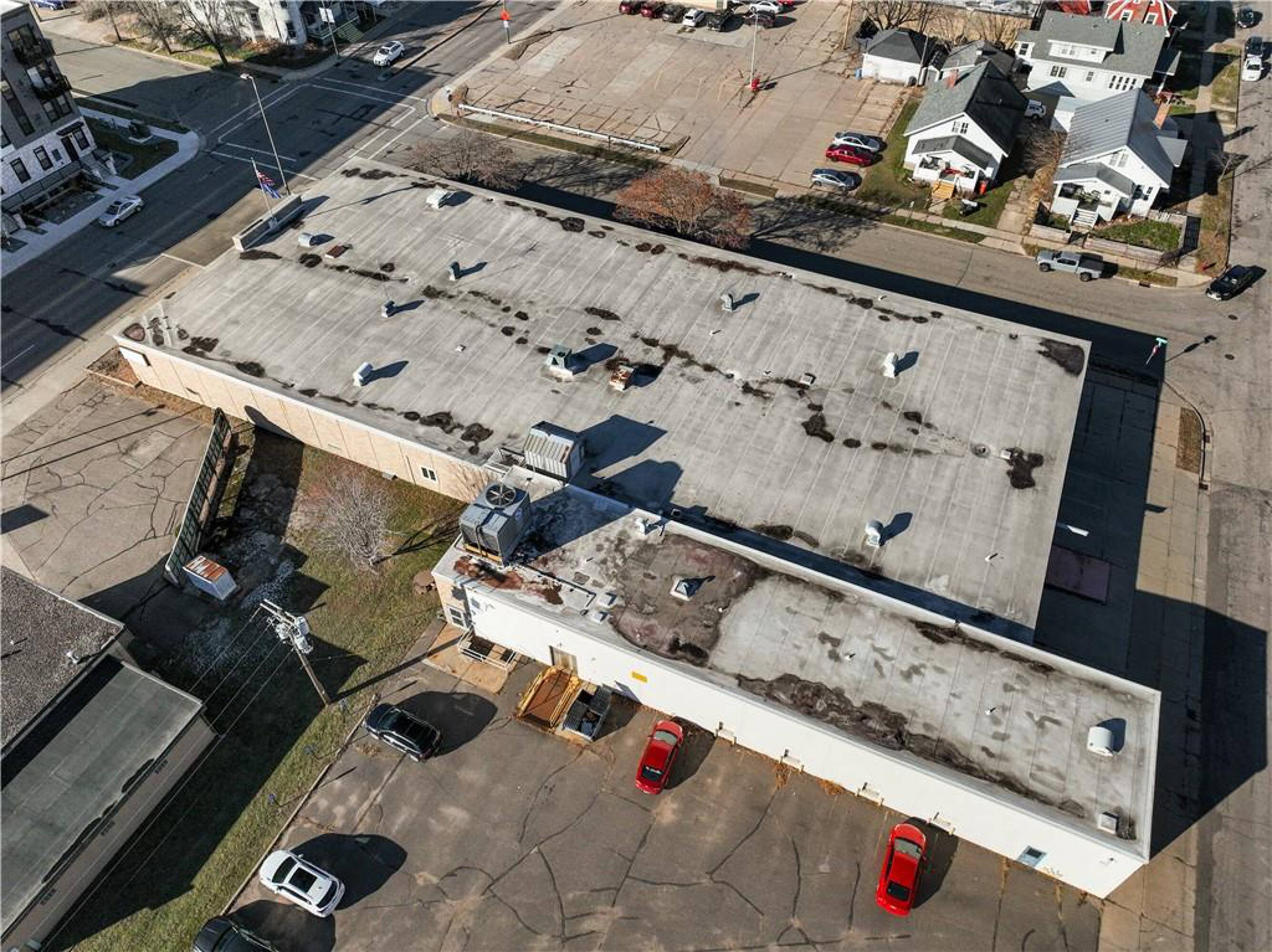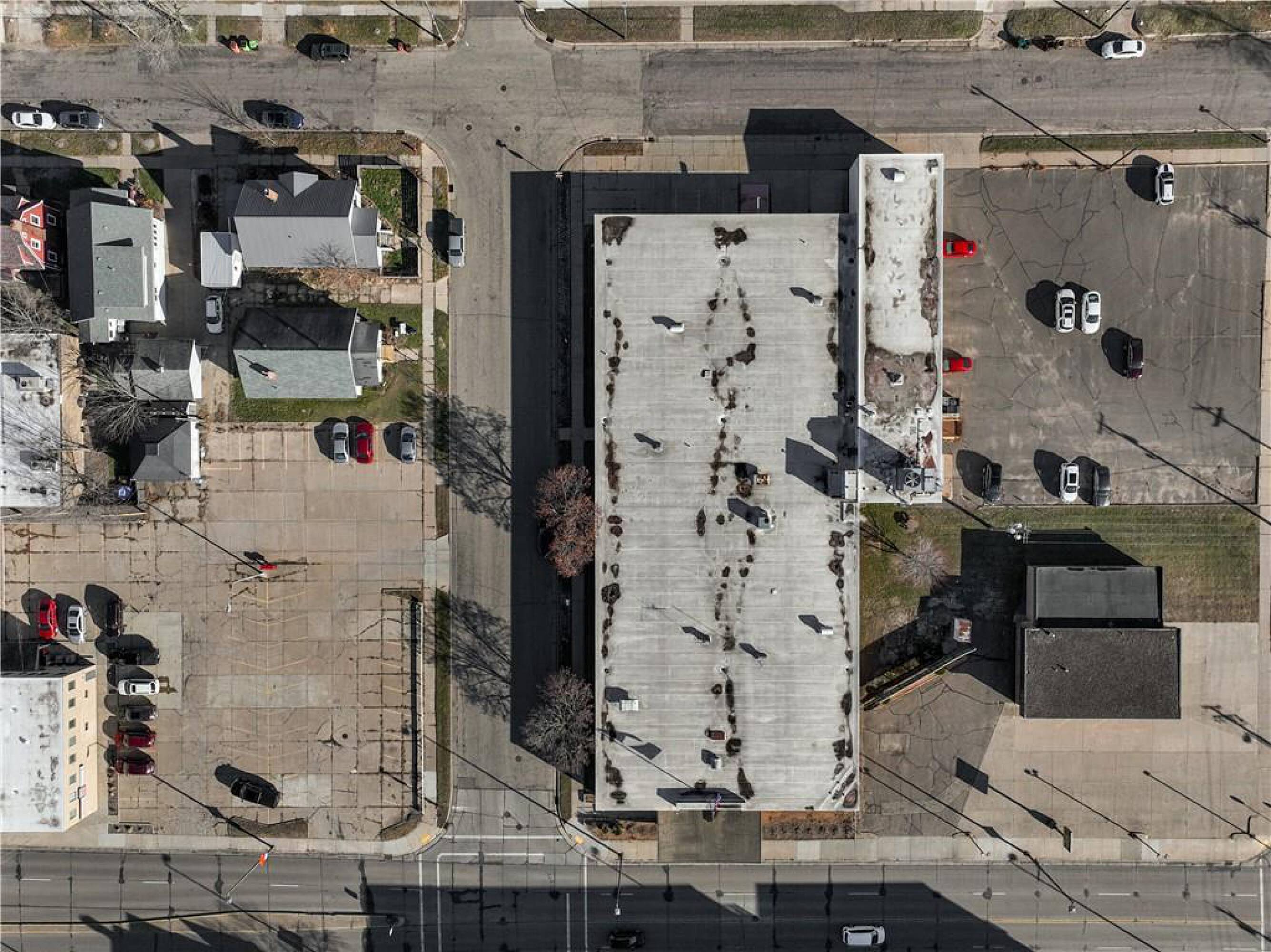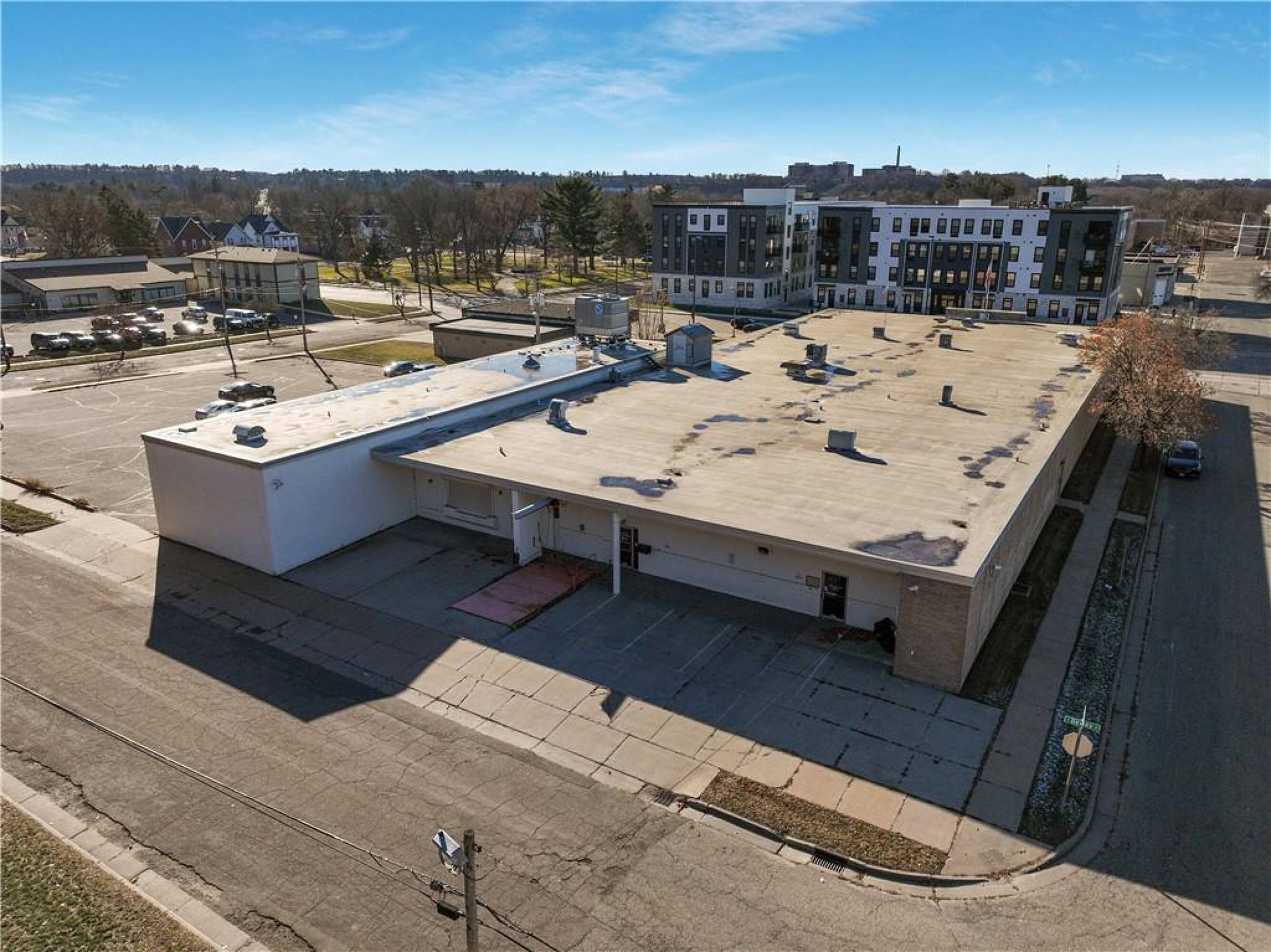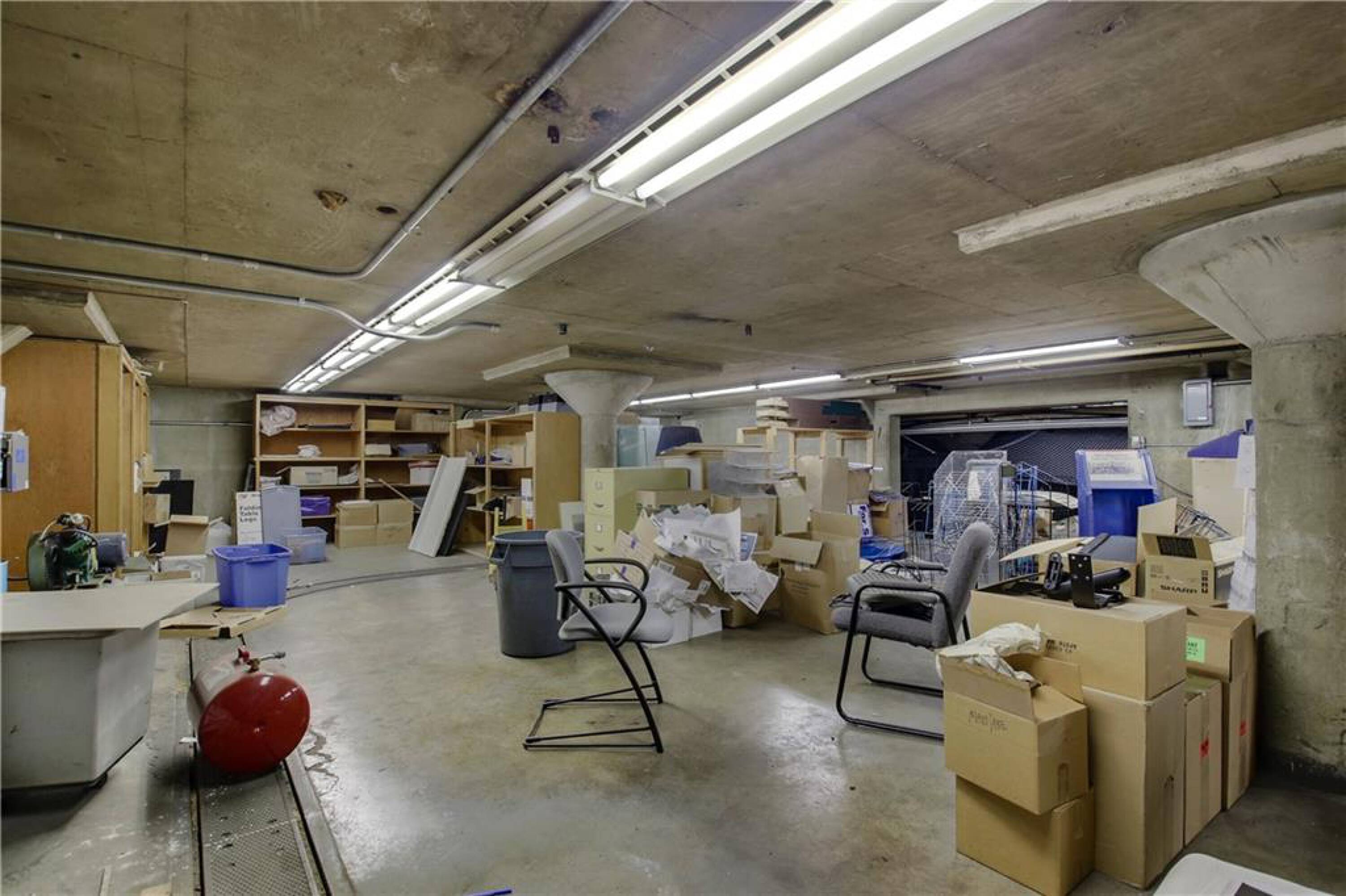 Iconic building with office spaces, storage, and parking lots.