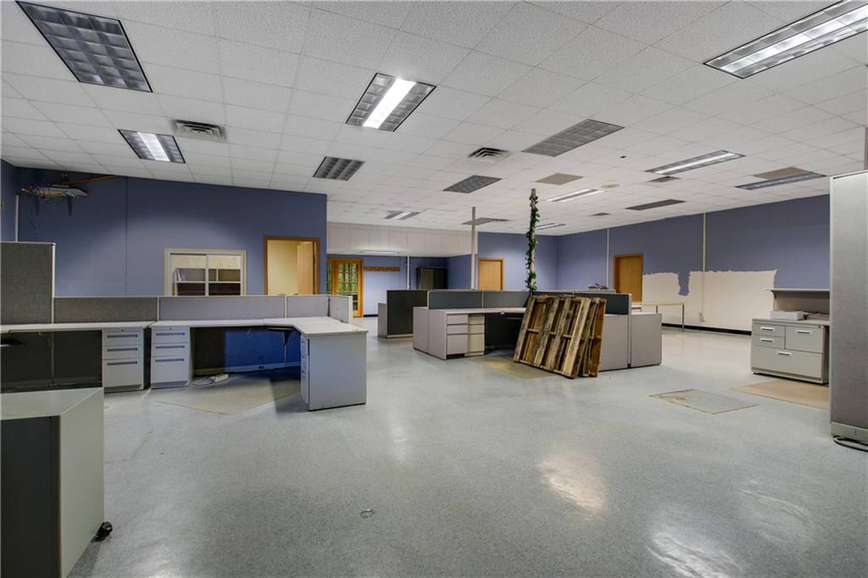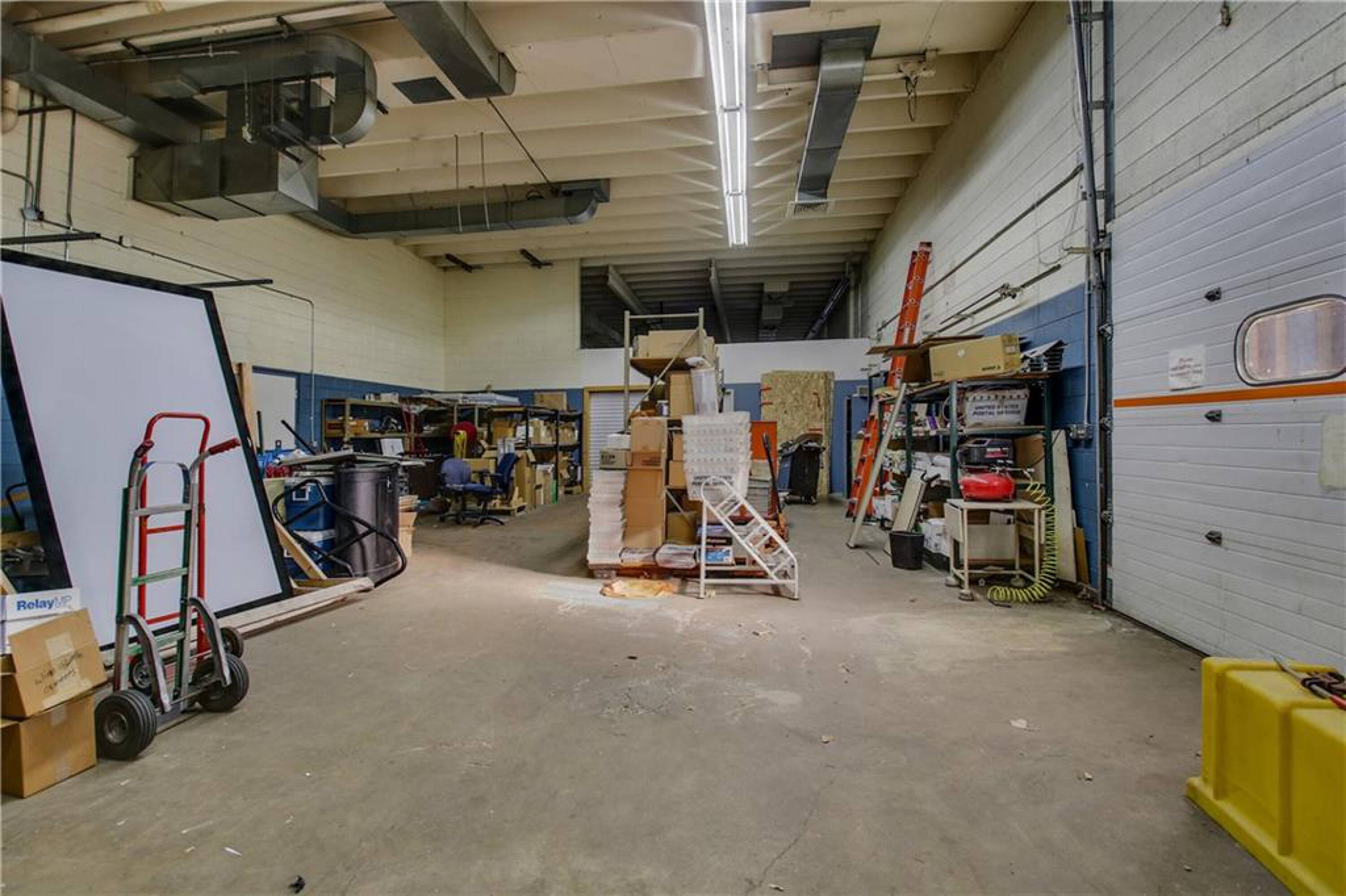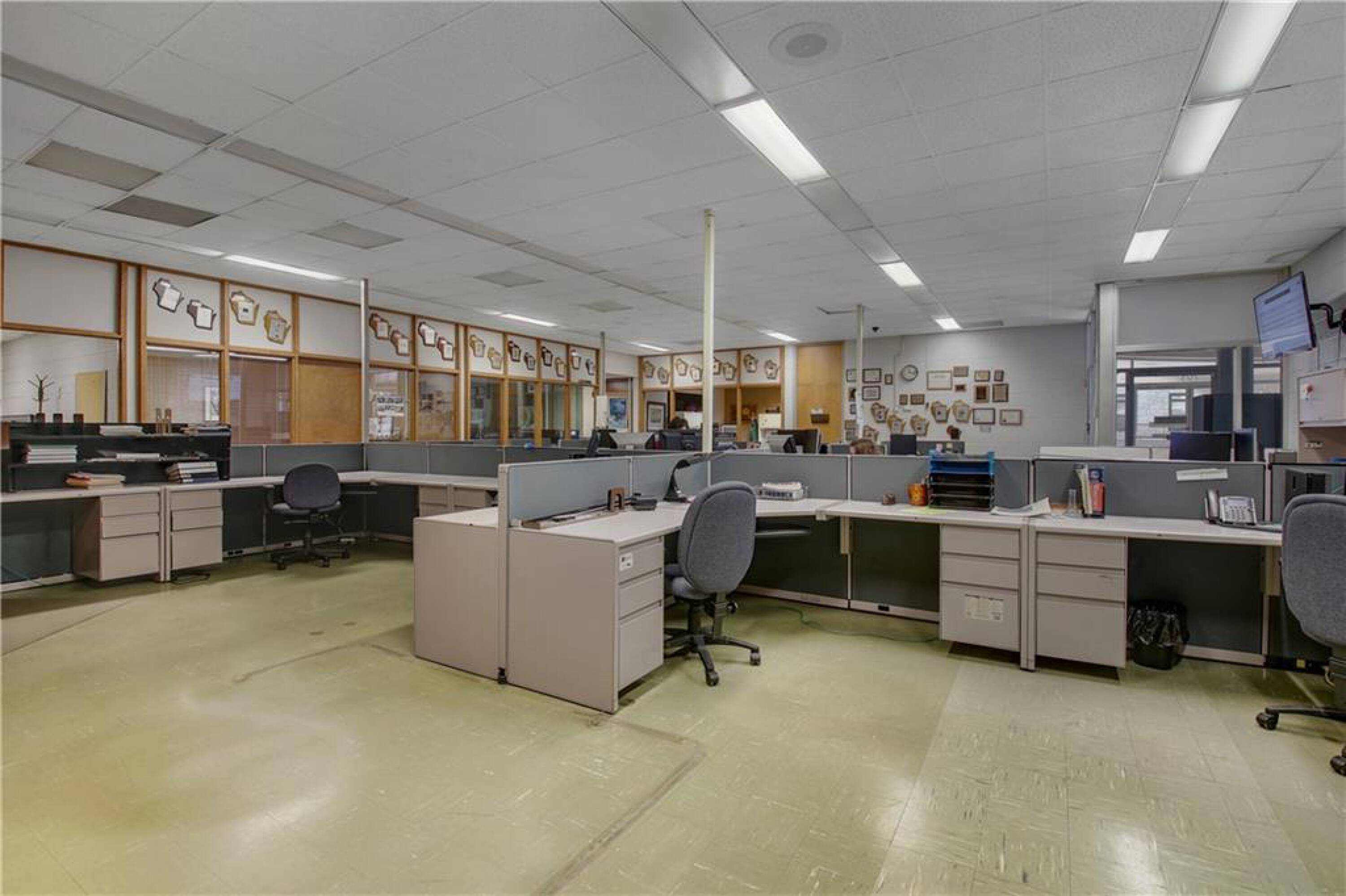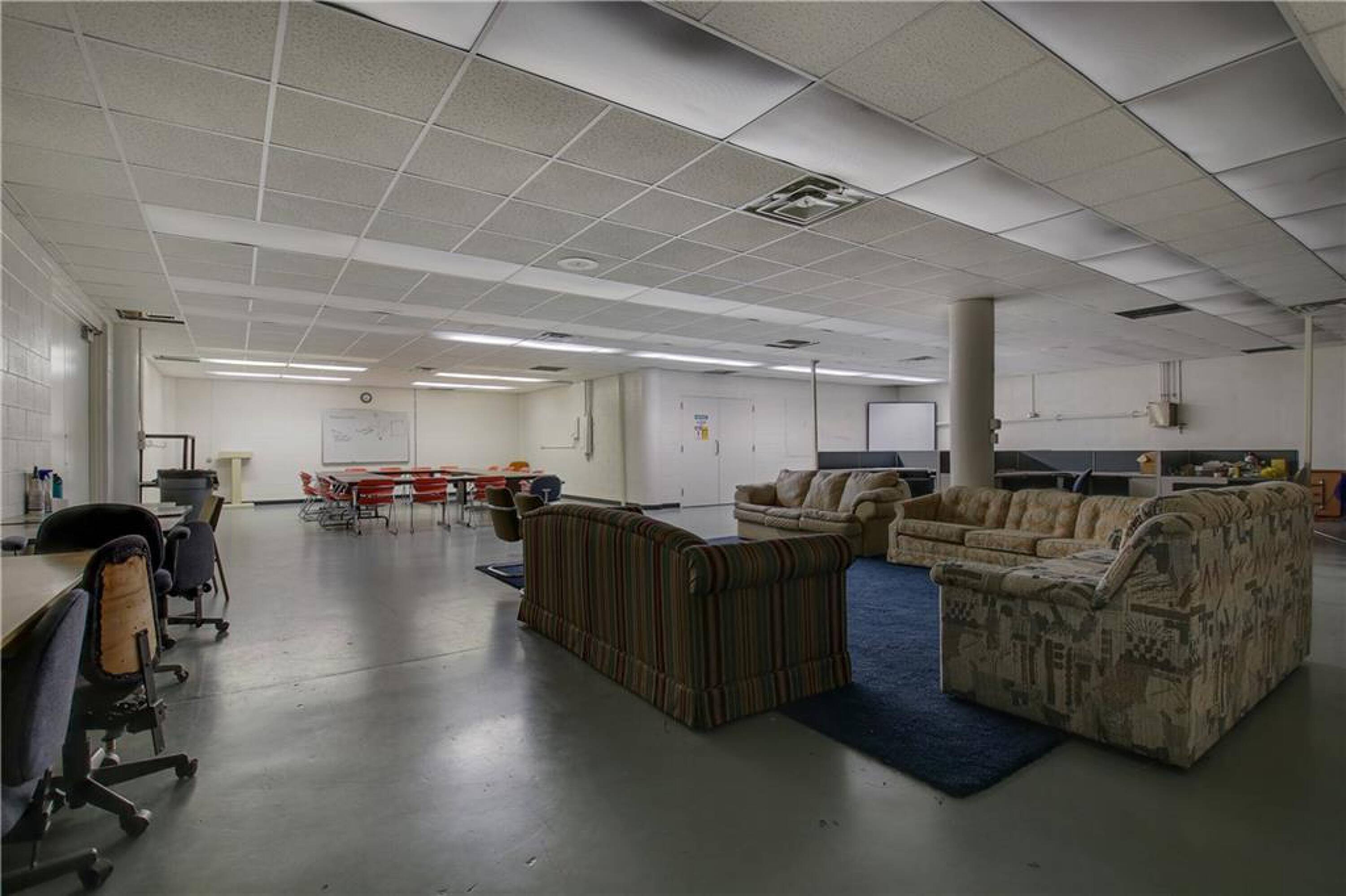 Iconic building with office spaces, storage, and parking lots.