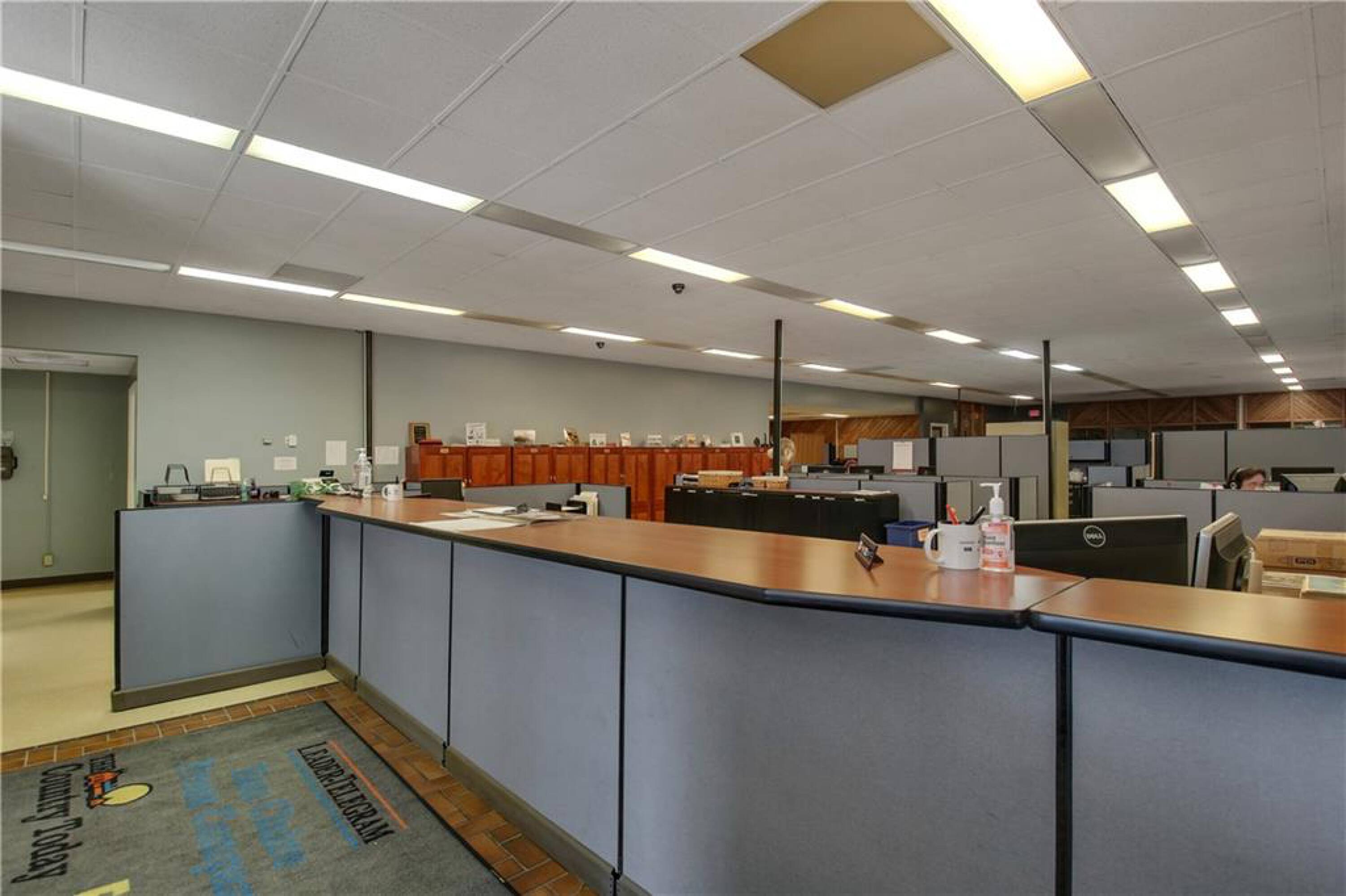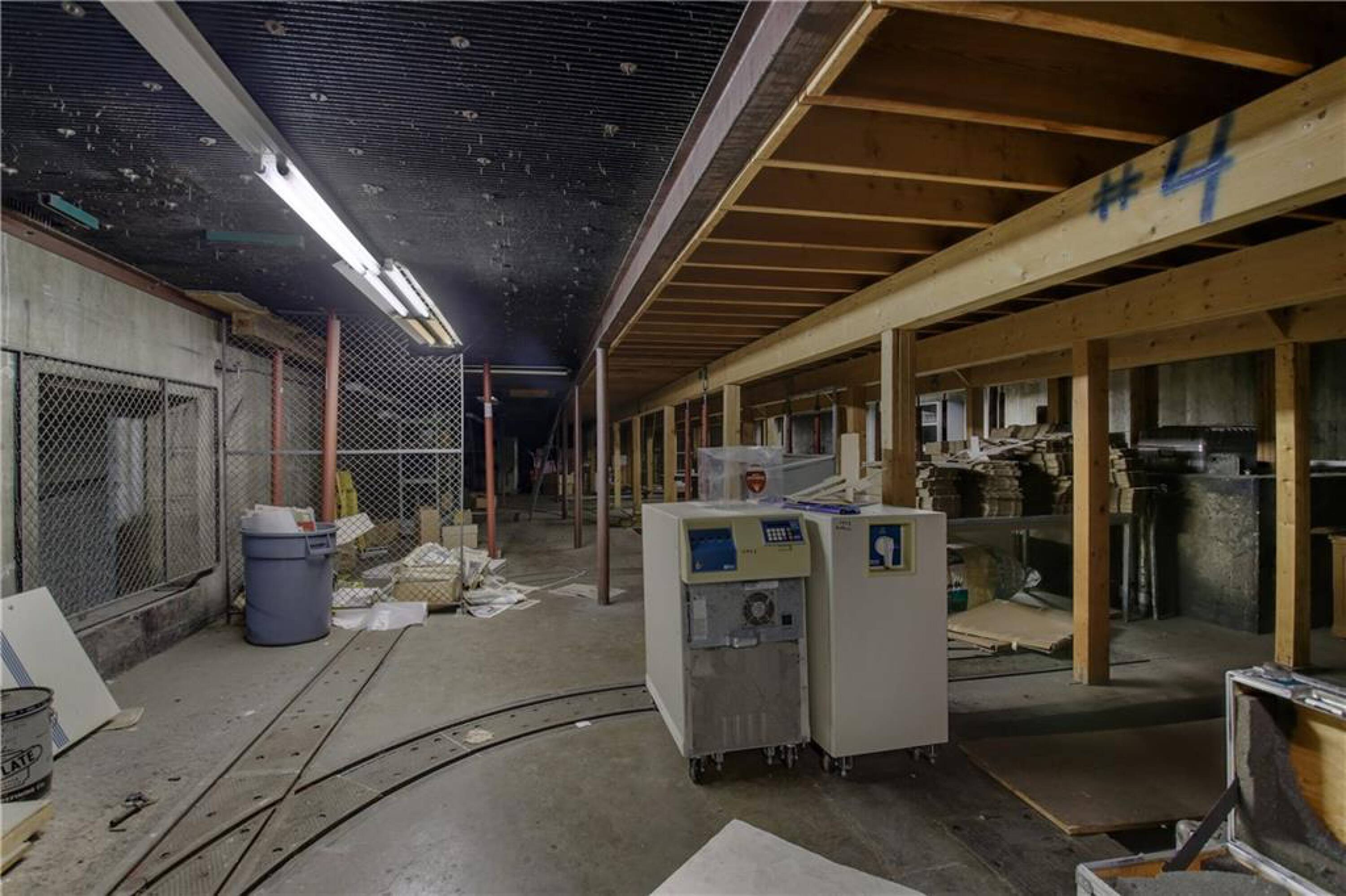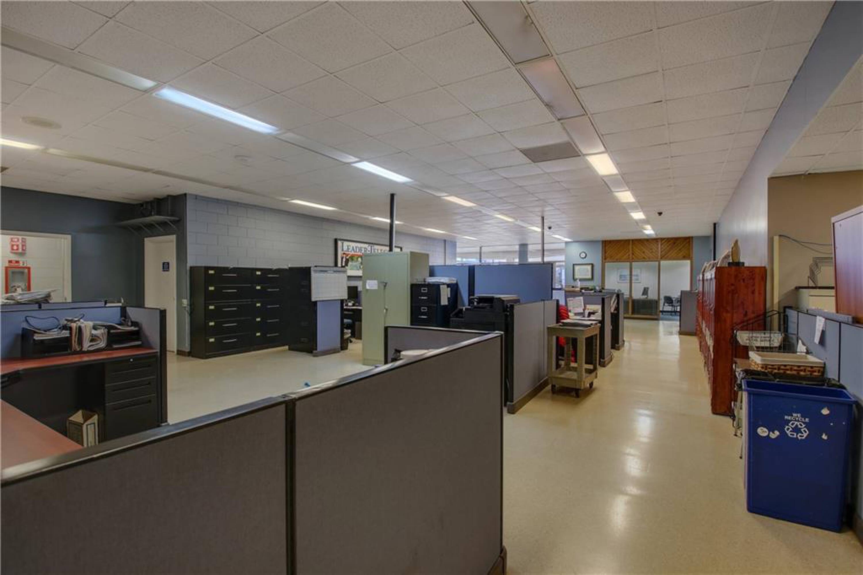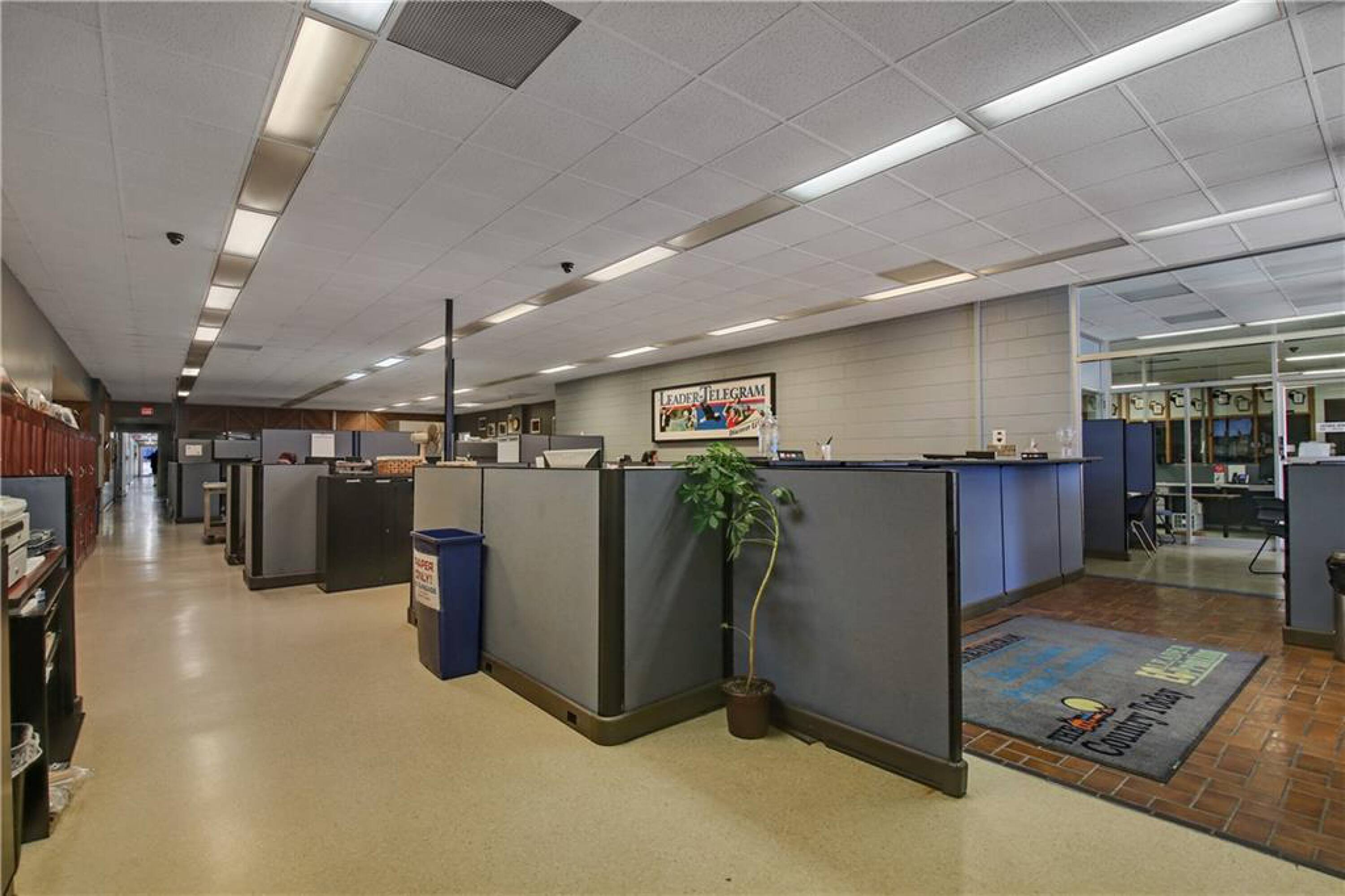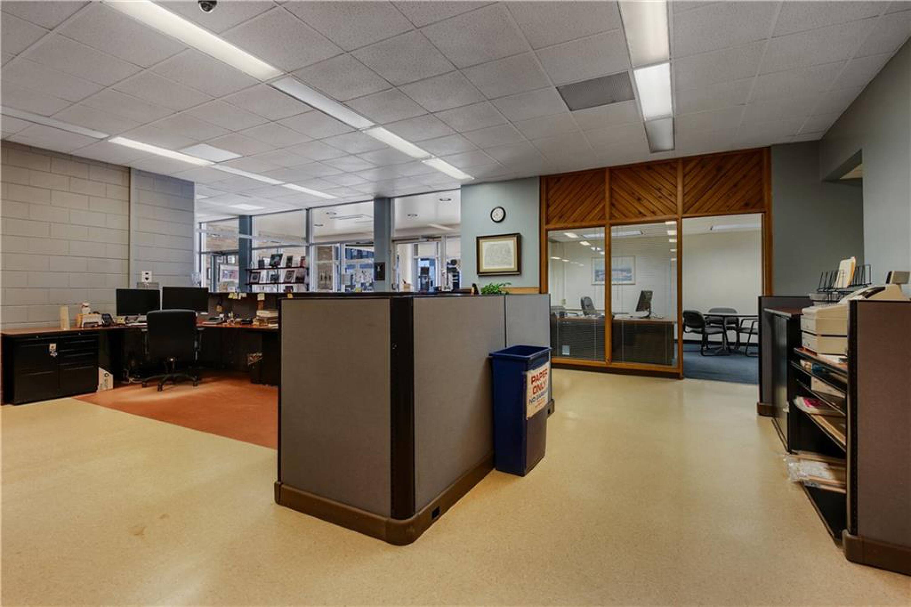 Iconic building with office spaces, storage, and parking lots.