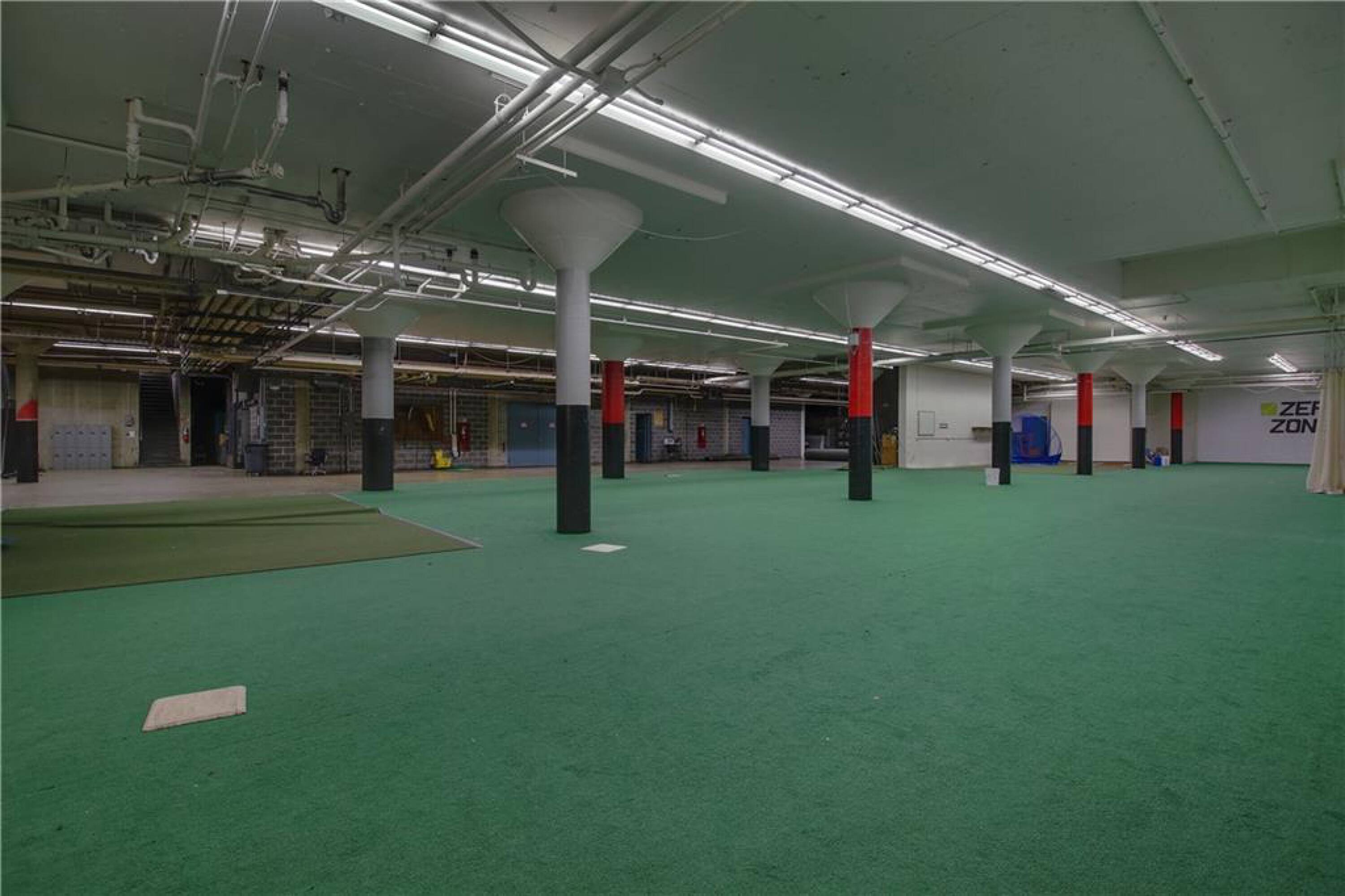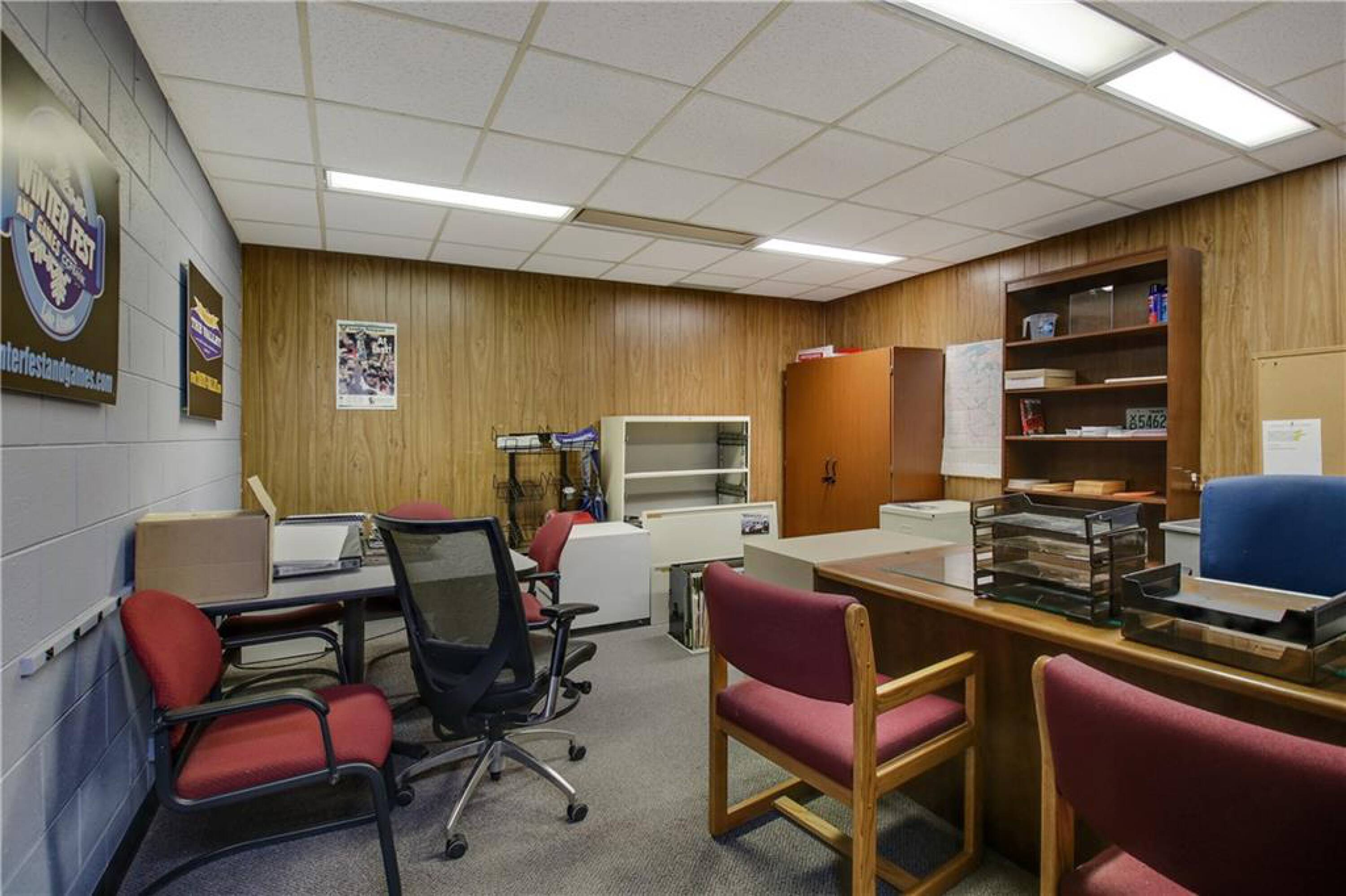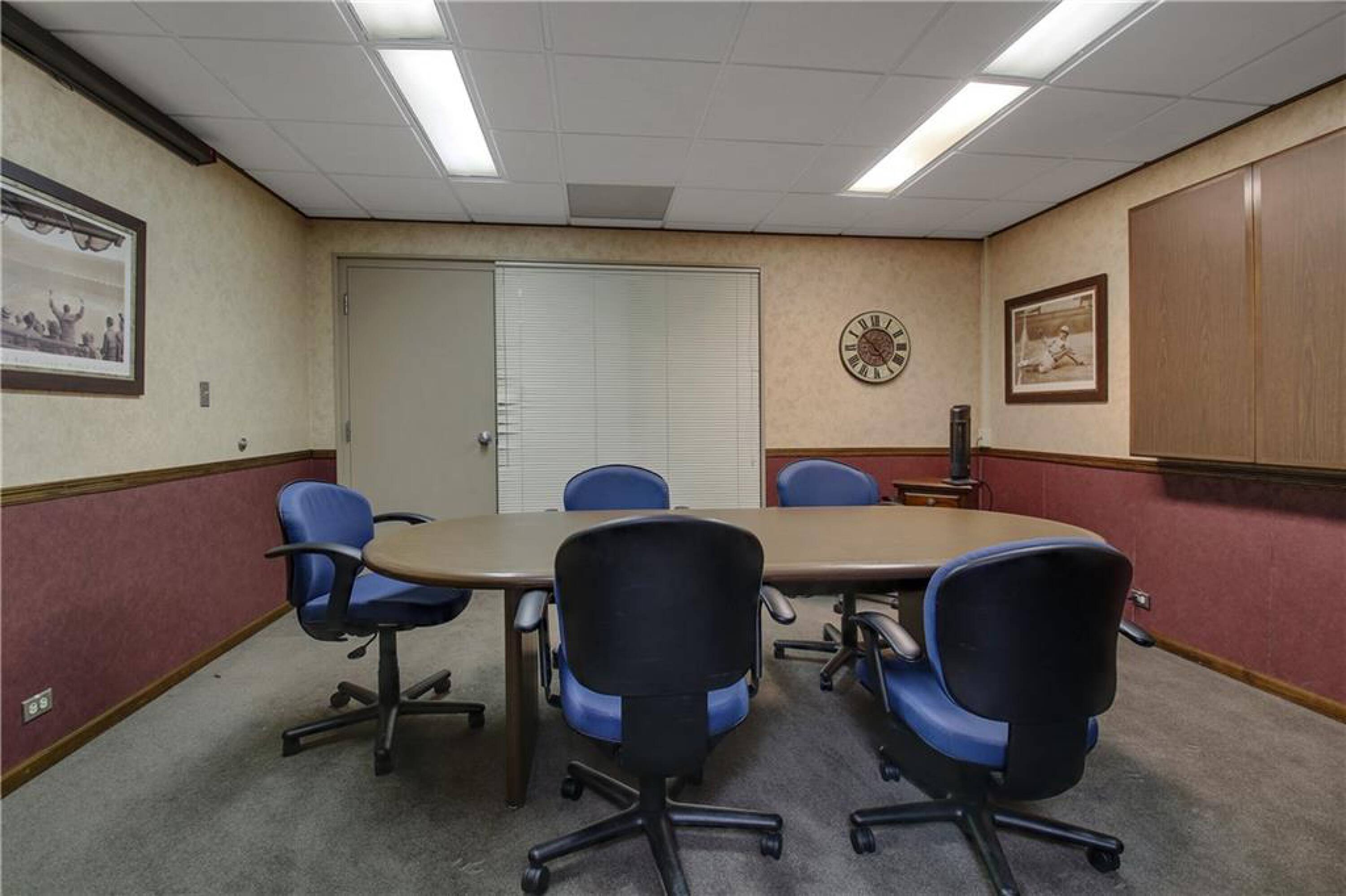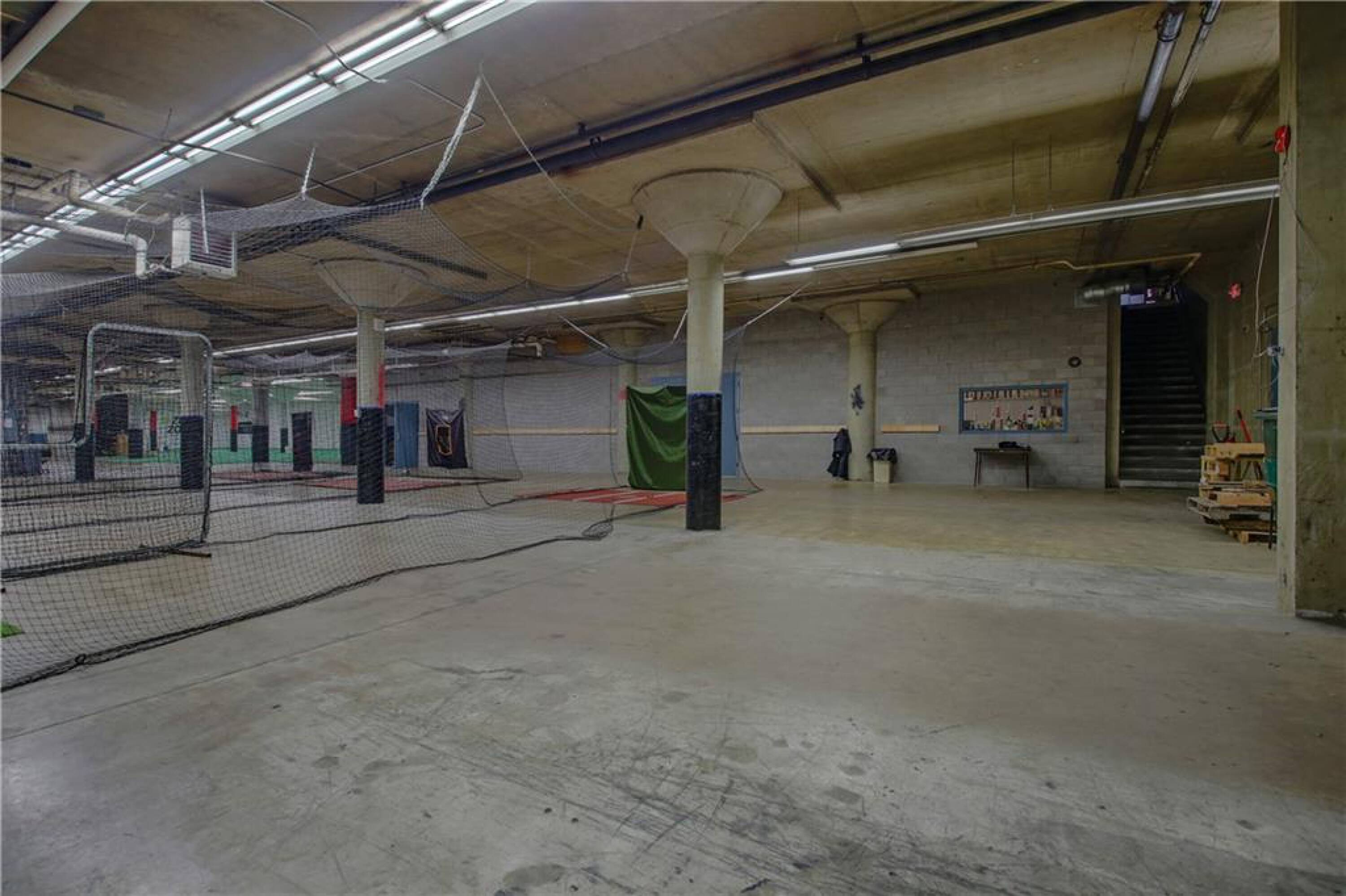 Iconic building with office spaces, storage, and parking lots.