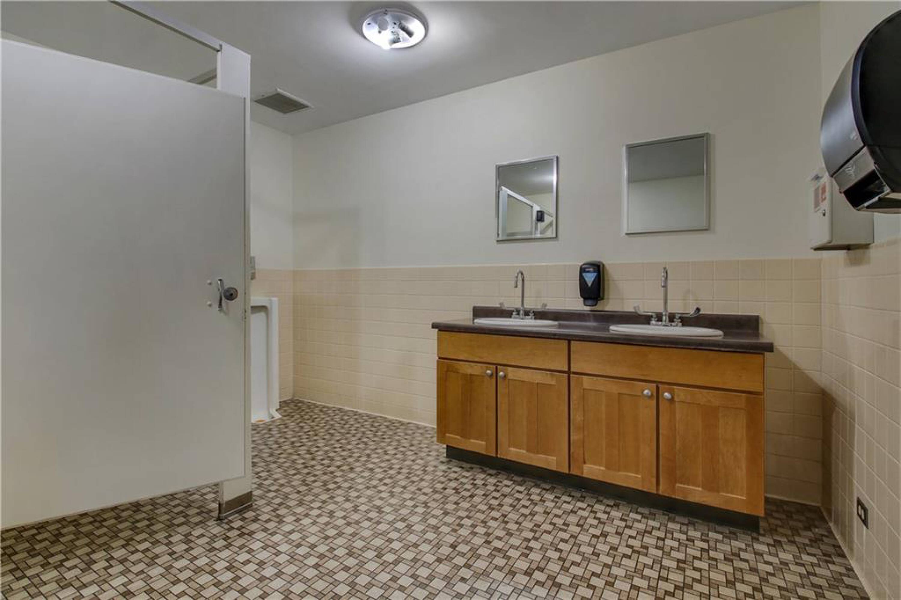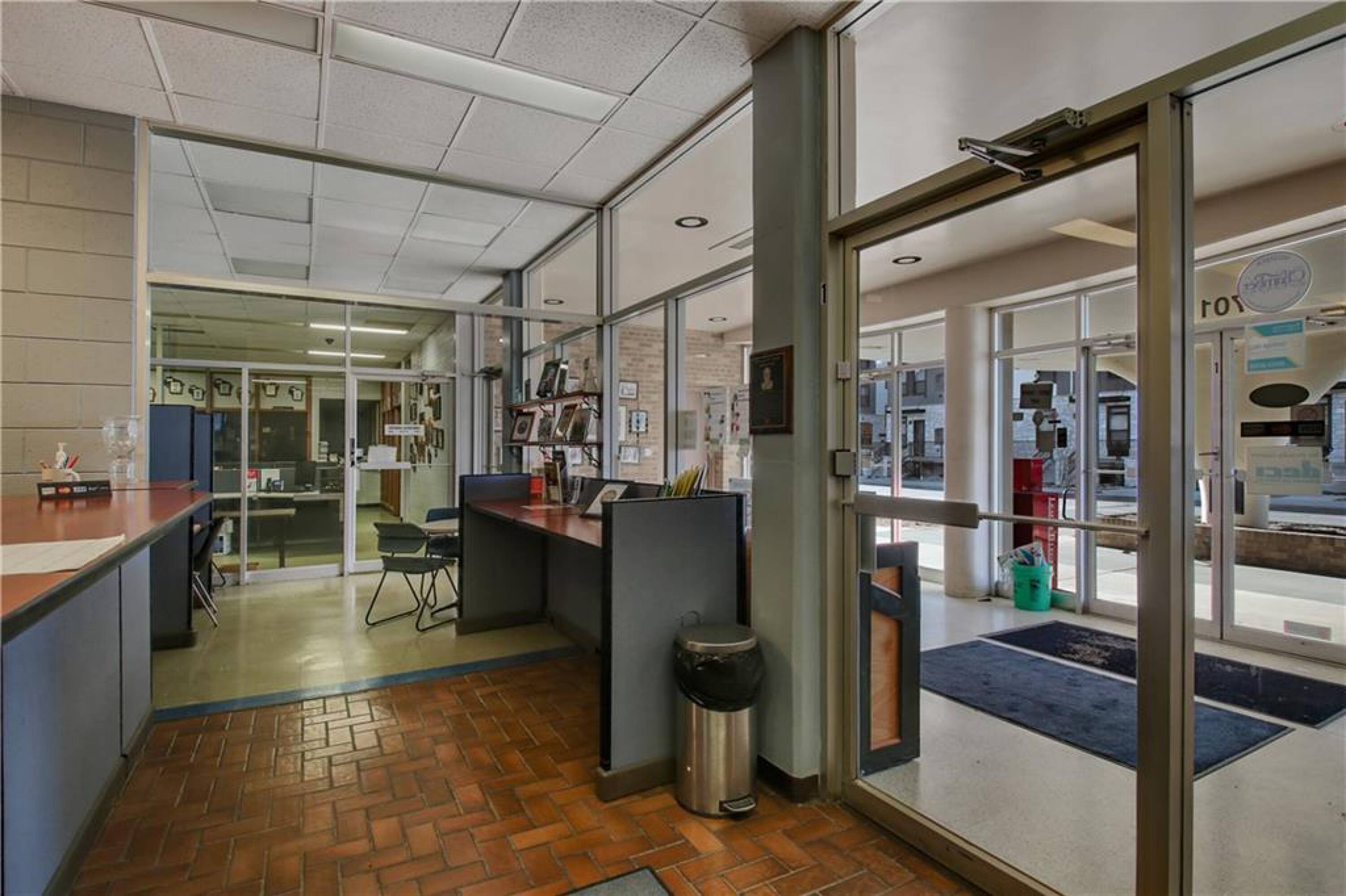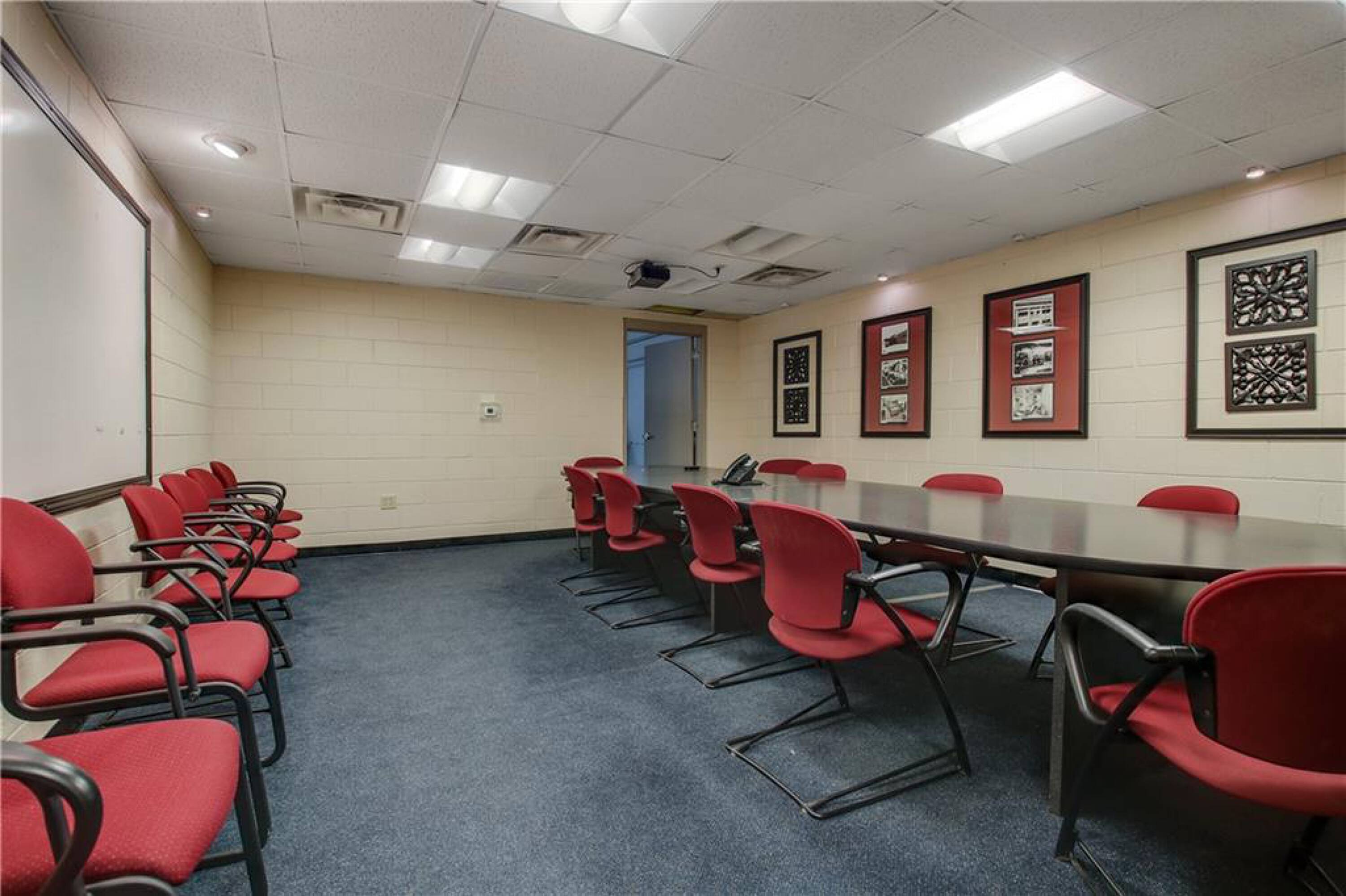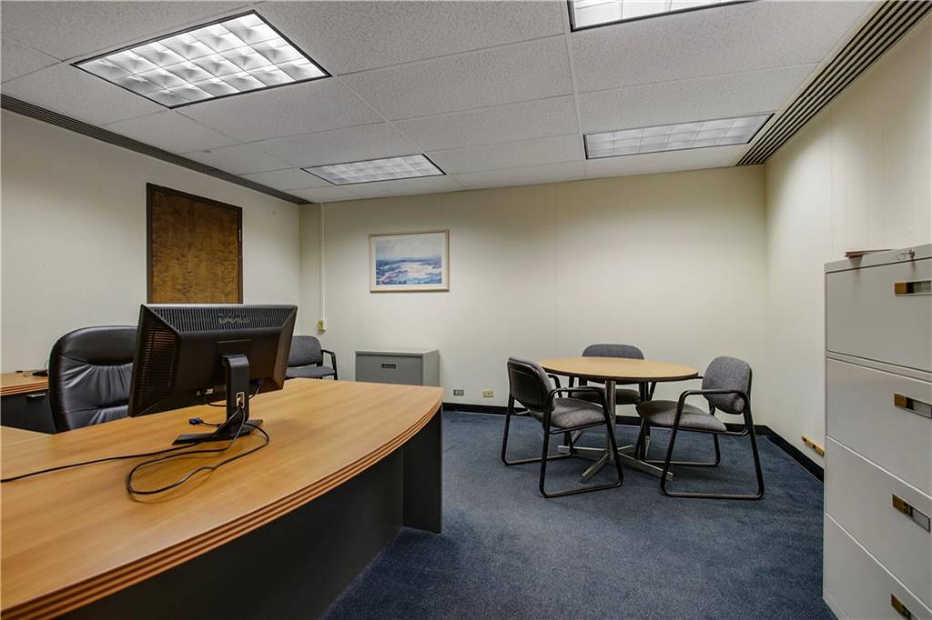 Iconic building with office spaces, storage, and parking lots.
