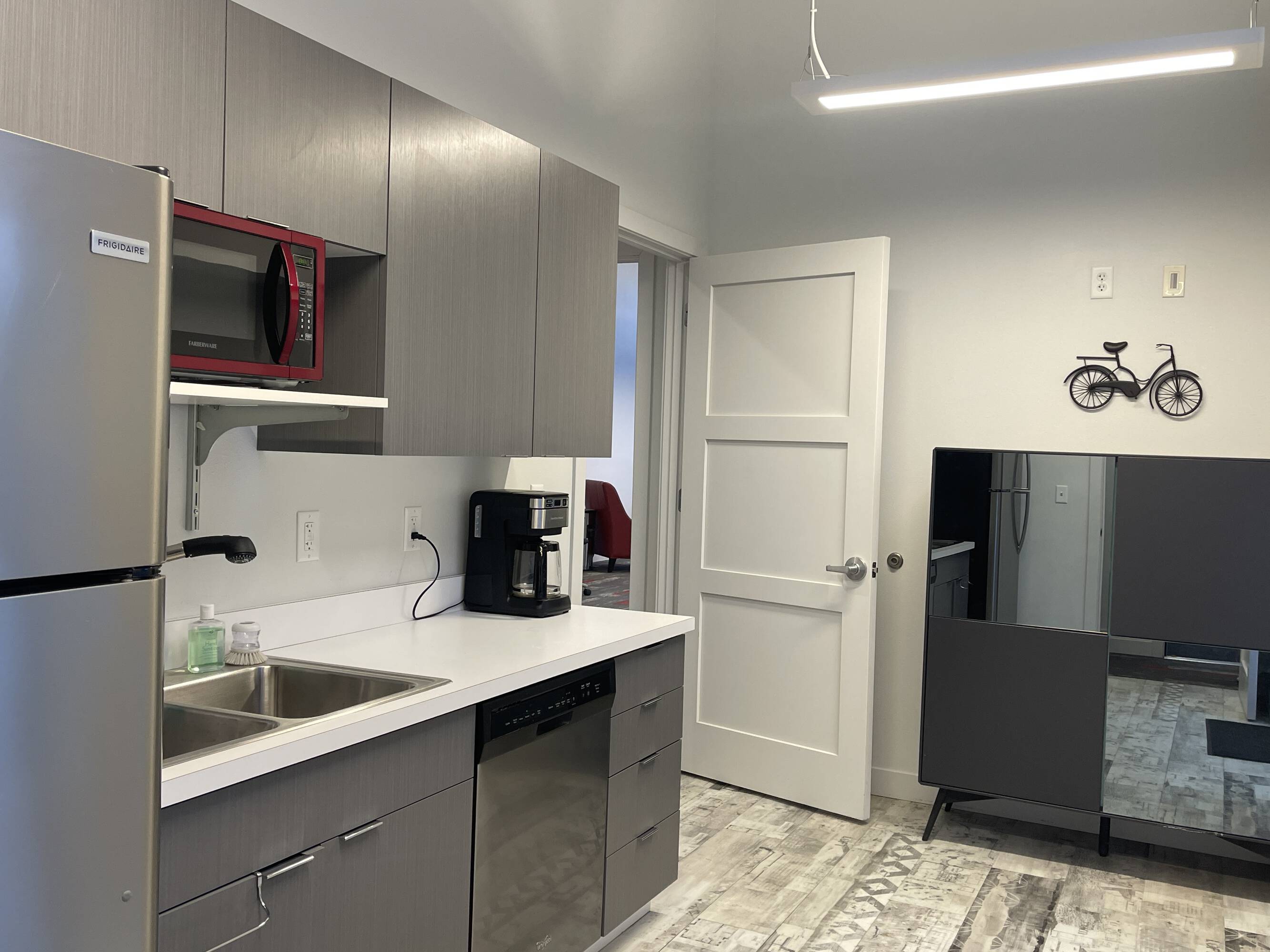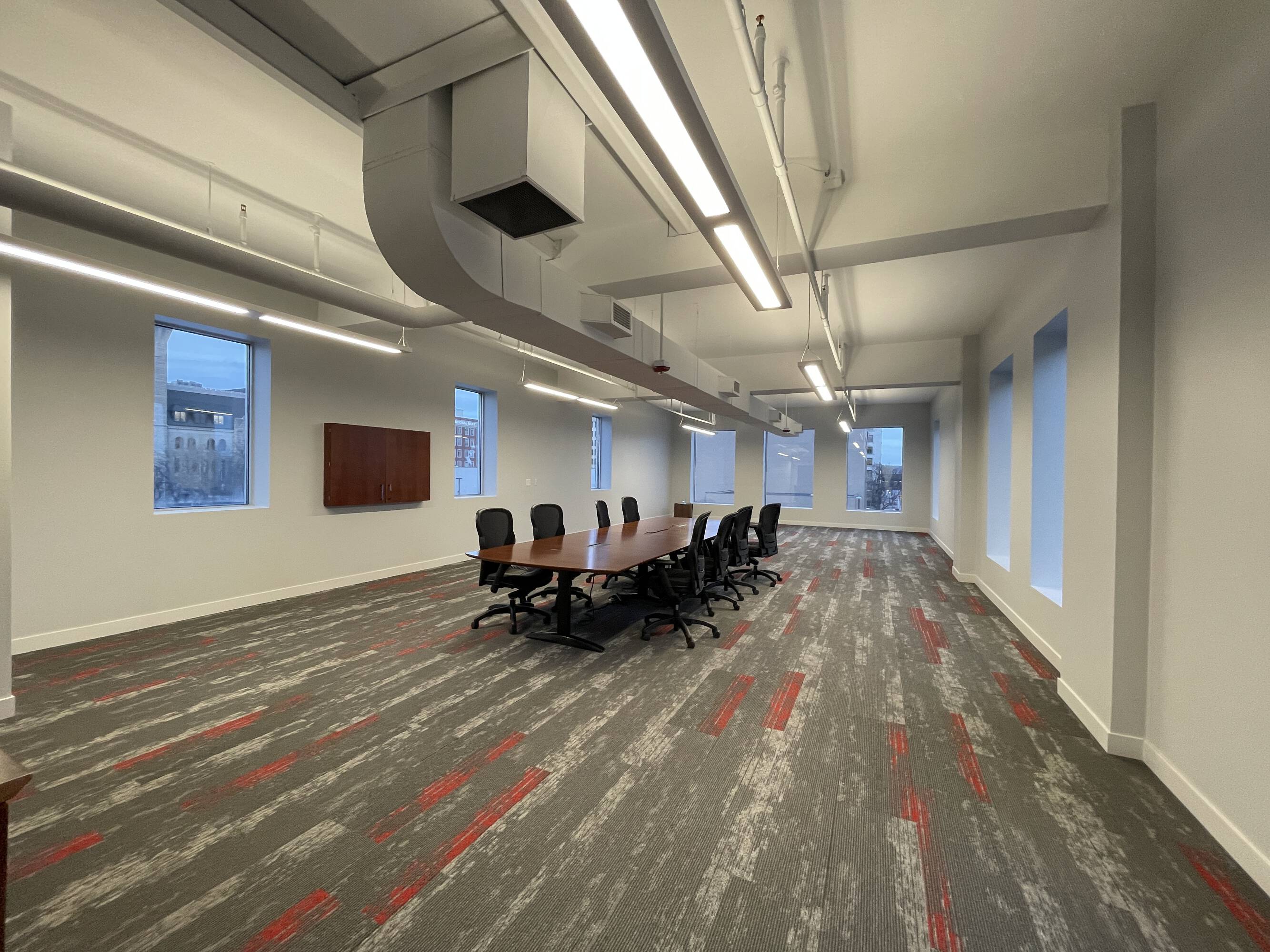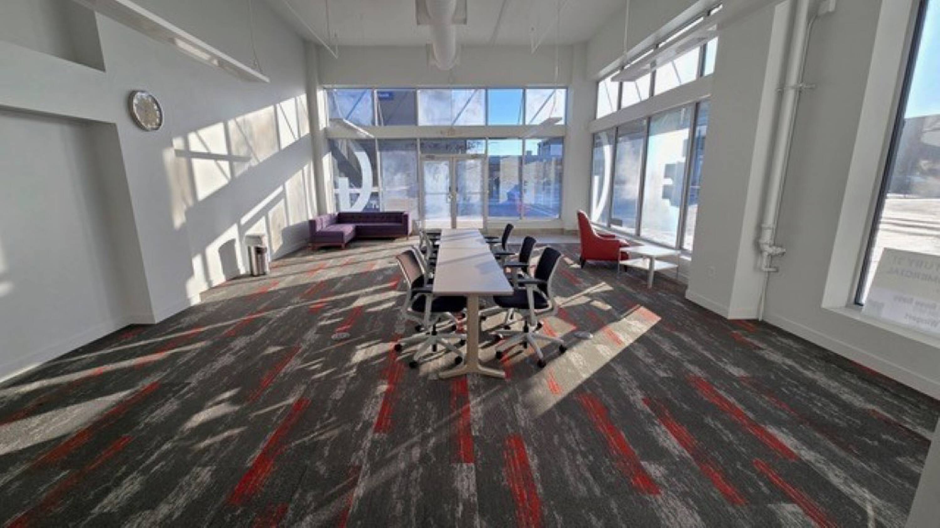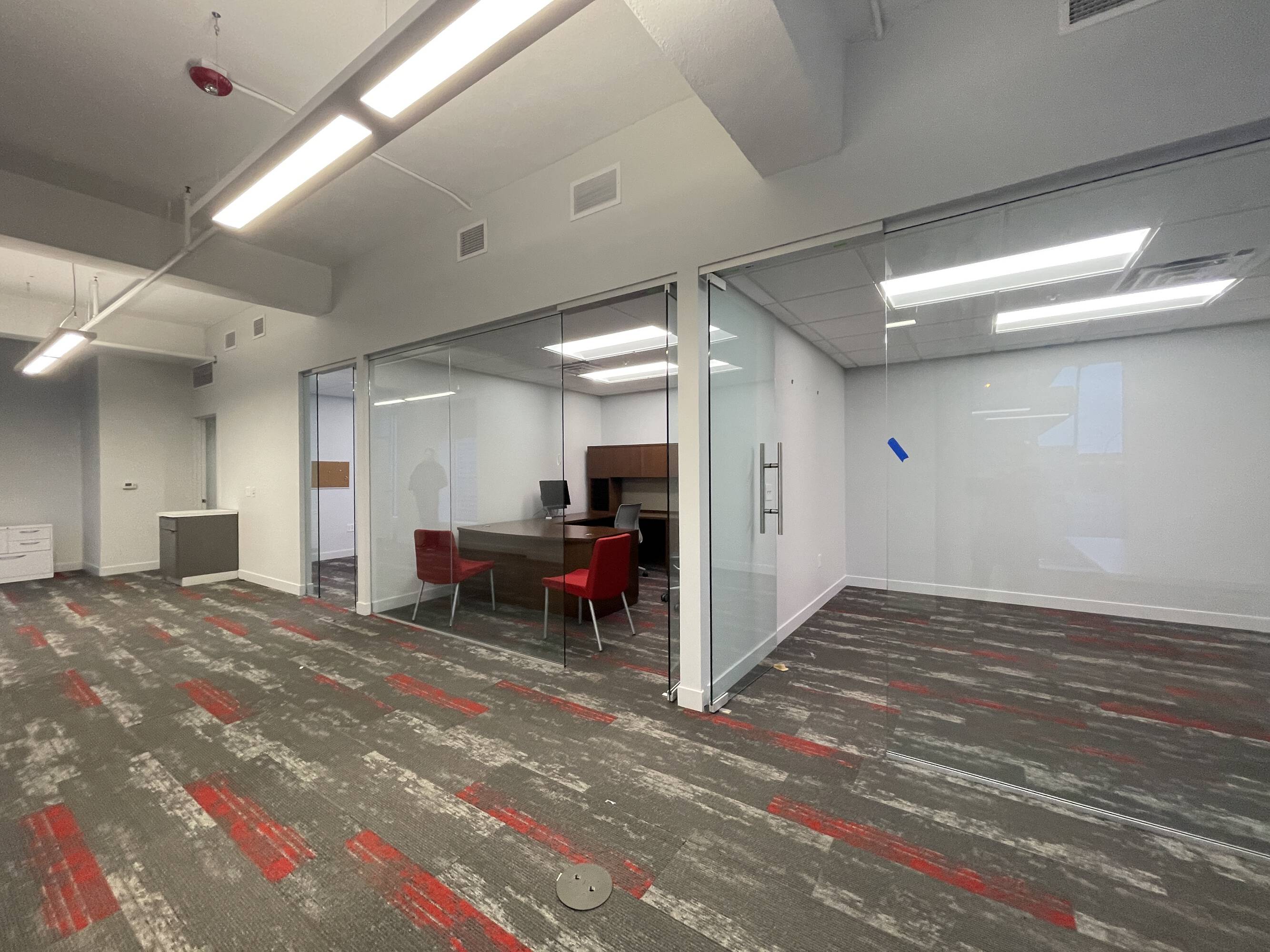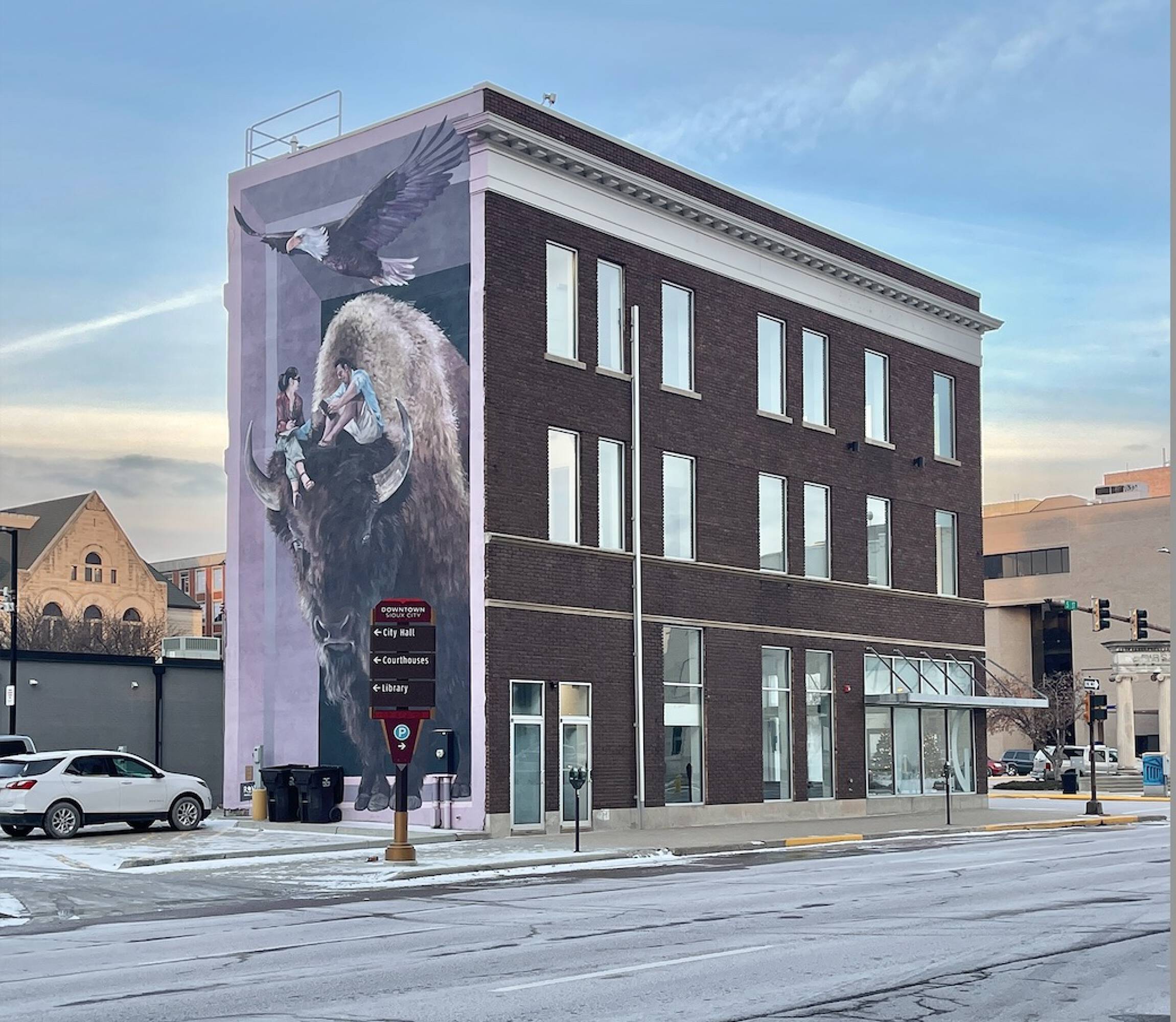Three-story office building featuring a prominent mural and recent renovations.