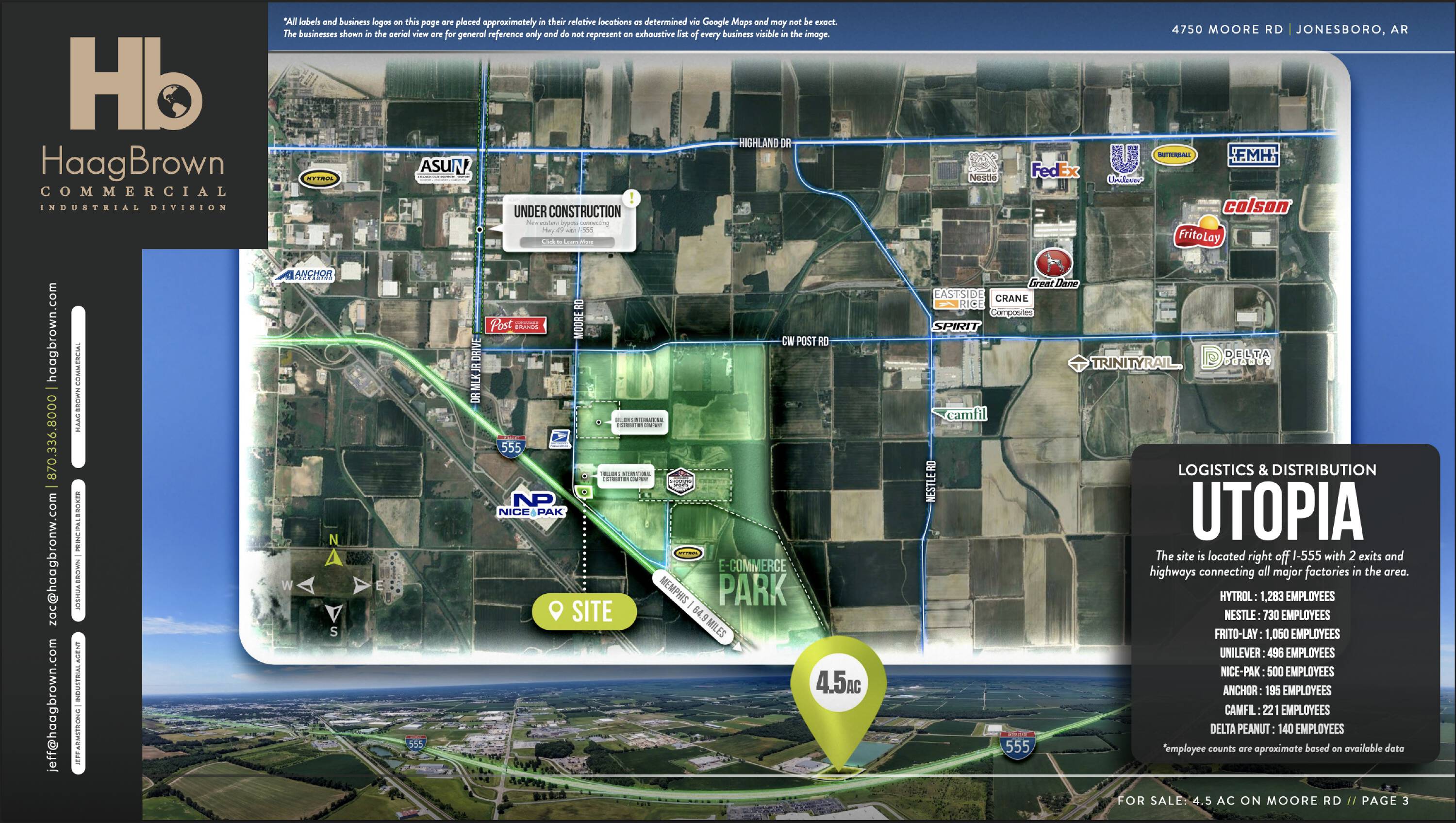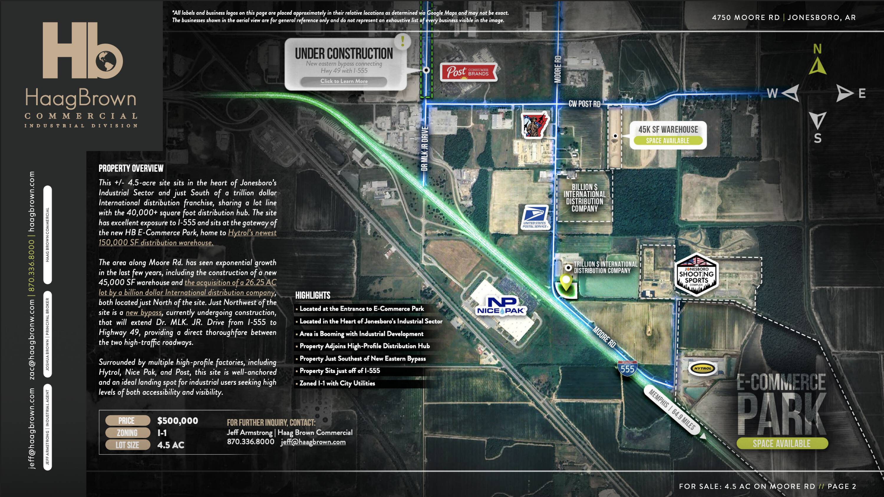 This approximately 4.5-acre site is located in the heart of Jonesboro’s industrial sector. It is situated just south of an international distribution franchise and shares a lot line with a distribution hub exceeding 40,000 square feet. The site offers exposure to I-555 and is positioned at the entrance to the new HB E-Commerce Park, which includes Hytrol’s newest 150,000 square foot distribution warehouse. The Moore Road area has experienced growth in recent years, marked by the construction of a new 45,000 square foot warehouse and the acquisition of a 26.25-acre lot by an international distribution company, both located just north of the site. A new bypass, currently under construction, will extend MLK Jr. Drive from I-555 to Highway 49, creating a direct route between the two roadways, located just northwest of the site. Surrounded by factories, including Hytrol, Nice Pak, and Post, this site is suitable for industrial users seeking accessibility and visibility.