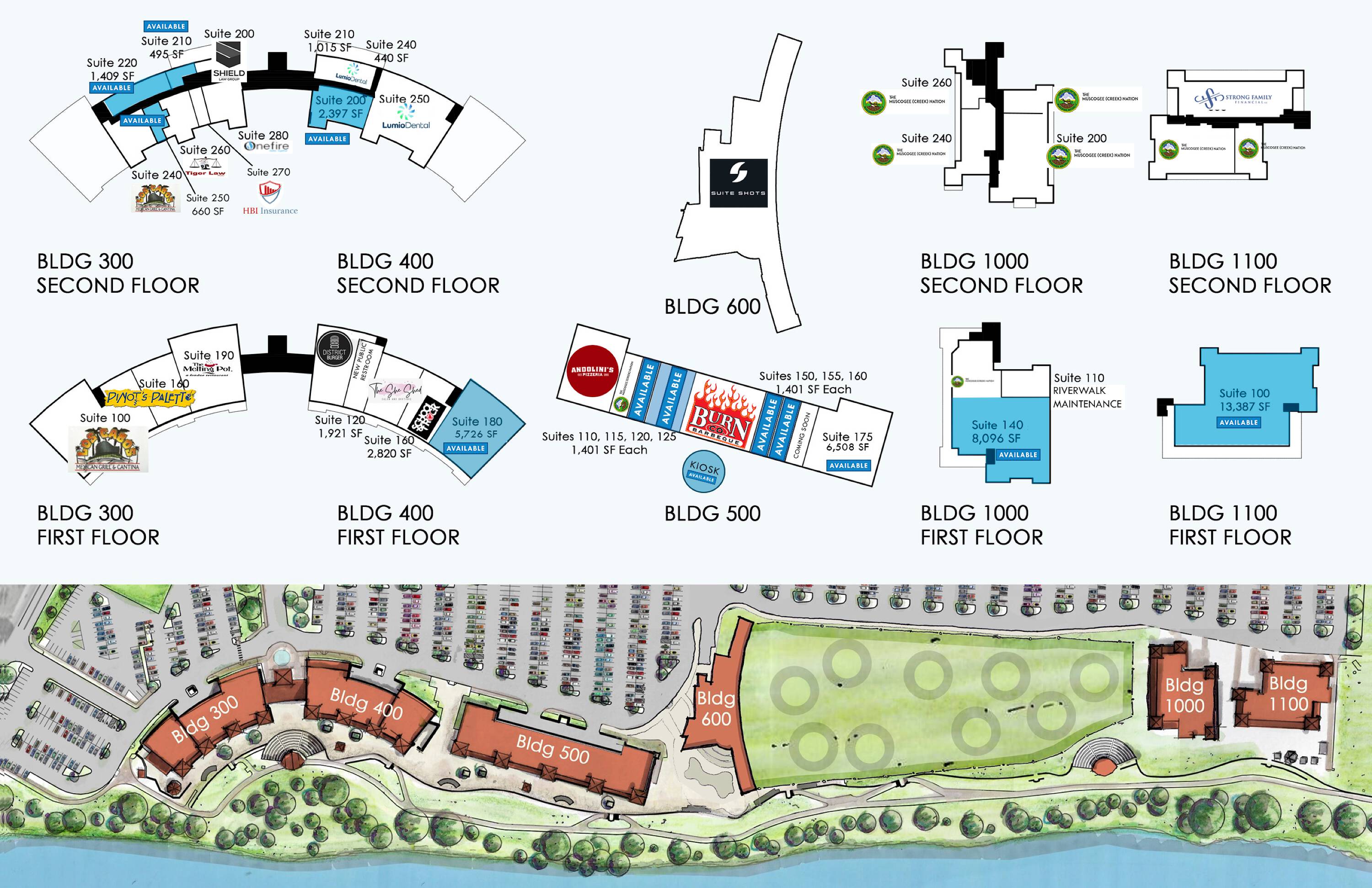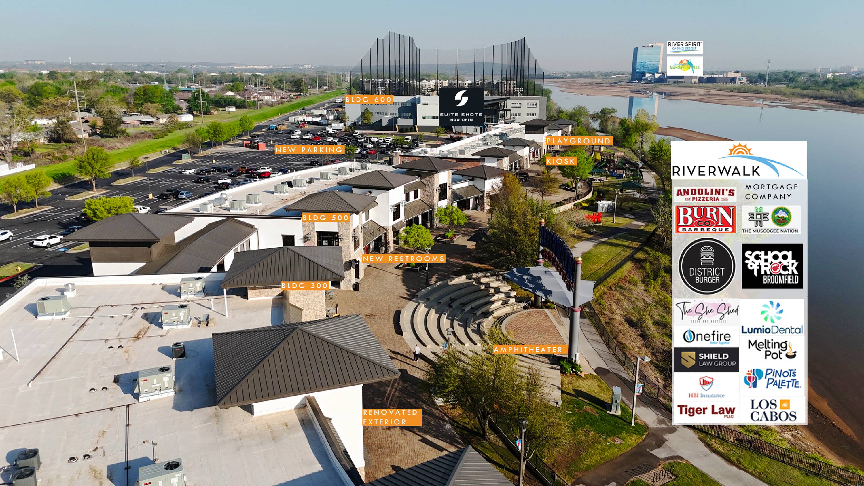 This property features: Prime location along the Arkansas River at Jenks Riverwalk.; Diverse tenant mix including popular restaurants and fitness options.; Ample parking with 1,300 spaces.