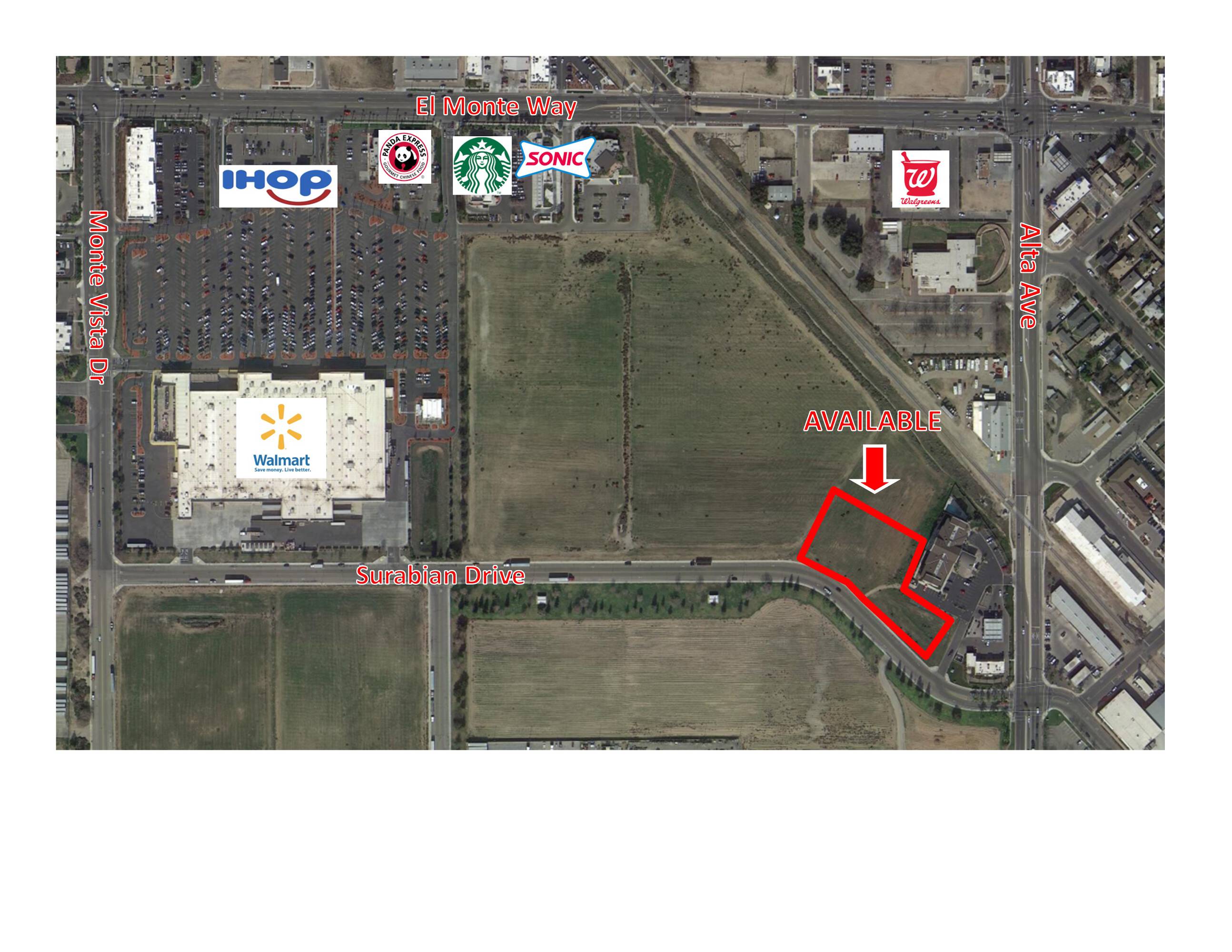 This property features approximately 2.15 acres of commercial retail development land, situated off Alta Avenue, just south of El Monte Way. The location offers high visibility and convenient access from Alta Avenue, with substantial frontage on Surabian Drive. Positioned east of Walmart Supercenter and north of Ruiz Foods, Inc., the parcel benefits from existing access from both Surabian Drive and Alta Avenue. The roads are designed to handle current capacity, aligning with local policies to prevent traffic congestion, making the site shovel-ready. Strategically located south of Dinuba's primary commercial corridor, El Monte Avenue, the site benefits from substantial traffic flow, with approximately 150,493 cars per day on El Monte Avenue. Alta Avenue sees approximately 13,931 cars northbound and 11,036 cars southbound. The flexible commercial zoning allows for various uses, including convenience stores, car washes, hotels, conference centers, quick-service and sit-down restaurants, food markets, retail strip centers, and professional offices. All necessary wet and dry utilities are available at the site.