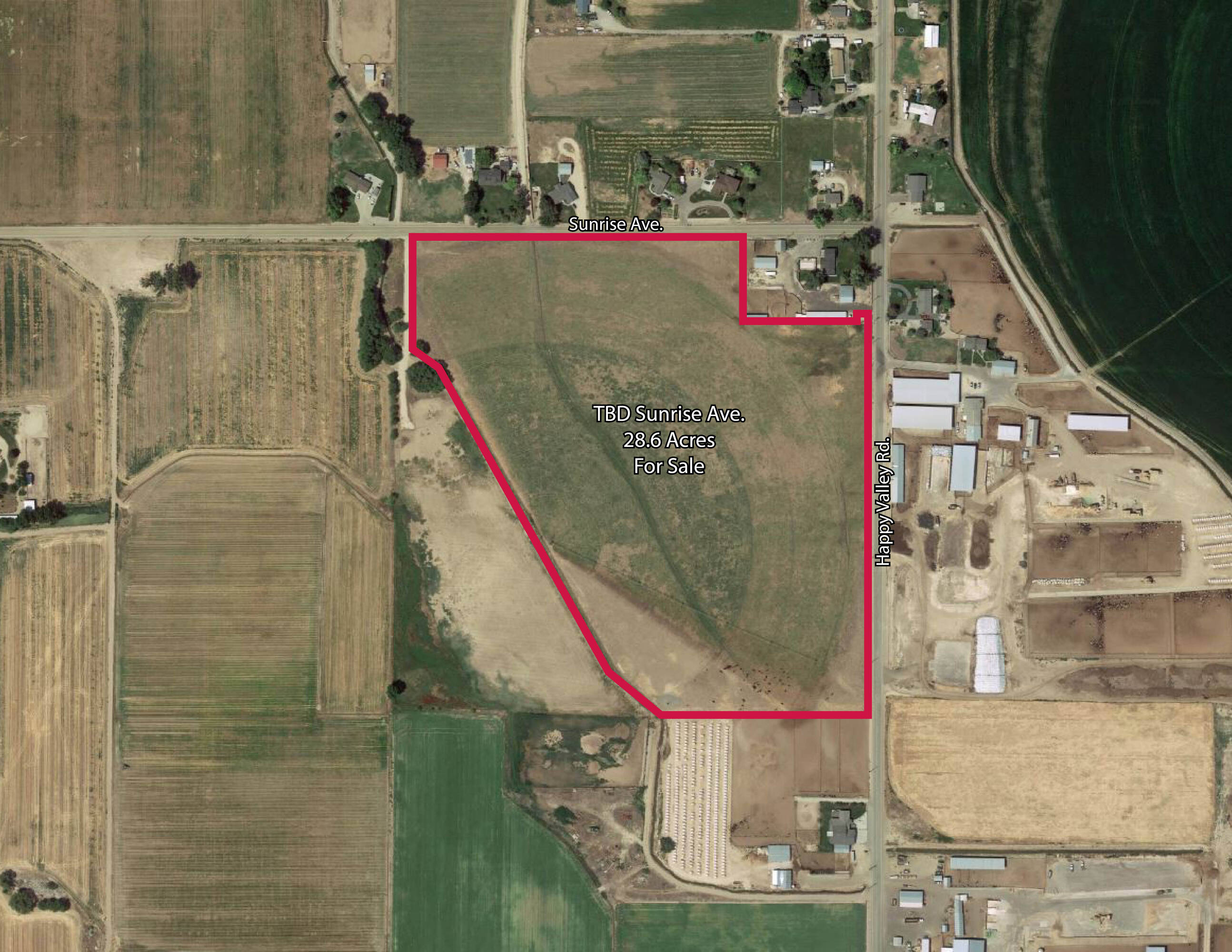 This 28.6-acre property is located at the intersection of Sunrise Ave. and Happy Valley Rd., offering close proximity to the City of Nampa and convenient access to I-84 via the Ten Mile Rd. interchange, which is within 12 miles, facilitating travel to Meridian and Boise. The land features a flat topography, presenting a combination of agricultural, future development, and recreational opportunities. The property includes 25.56 irrigated acres, equipped with a Reinke 6-tower, 1,000 ft pivot and a refurbished Berkeley pump operating at 300 GPM.