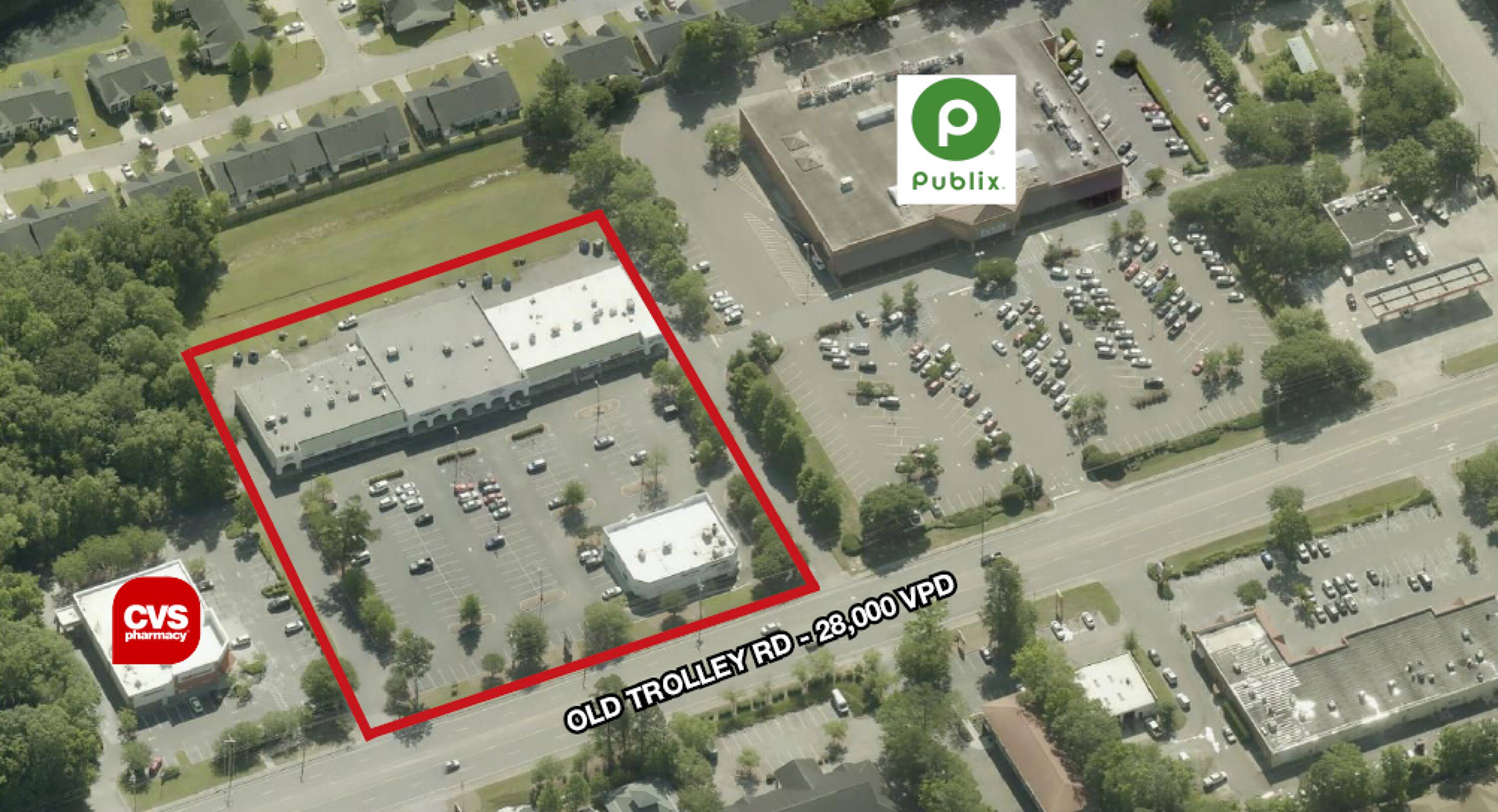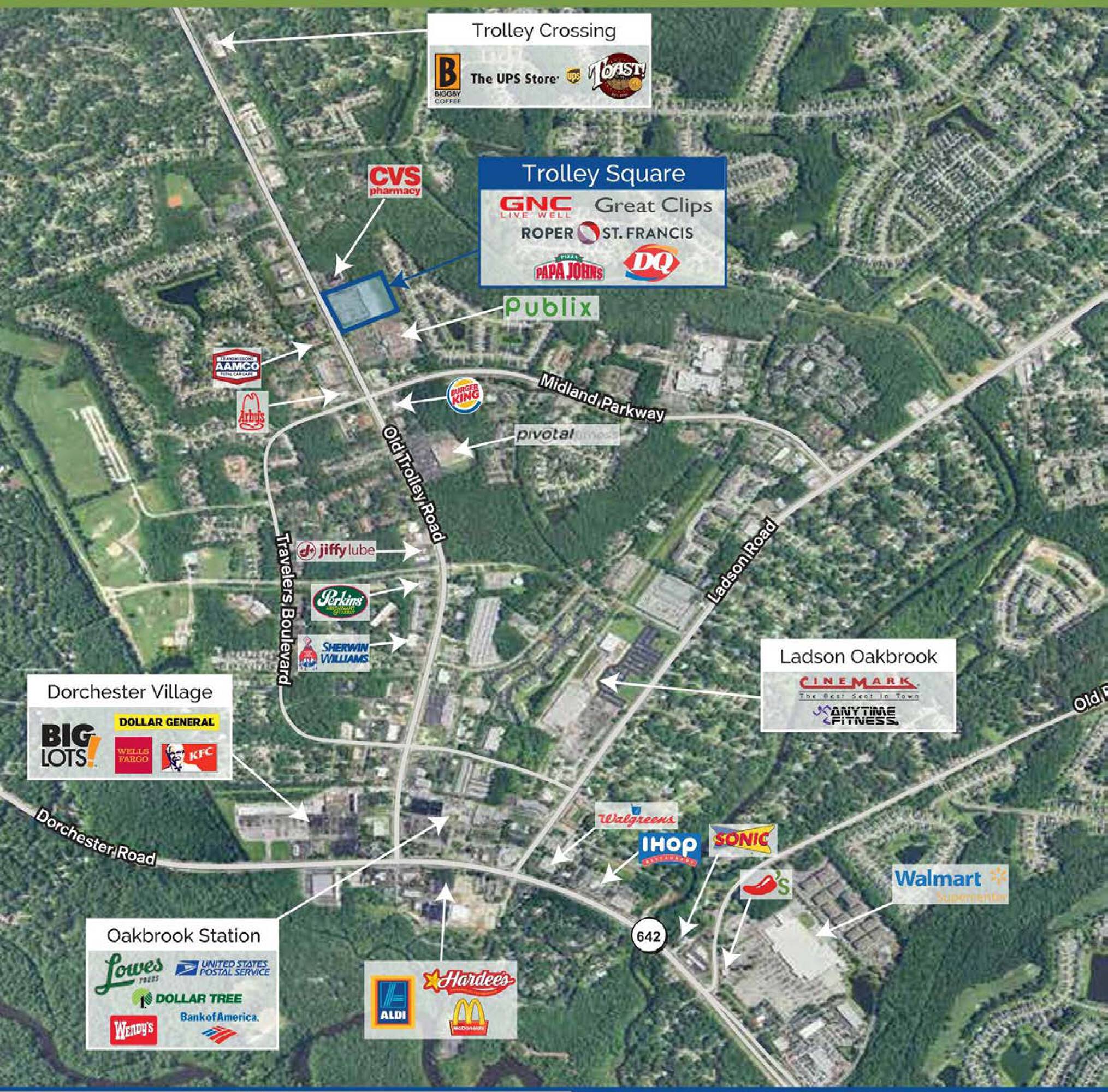 Retail spaces for lease in Trolley Square shopping center.