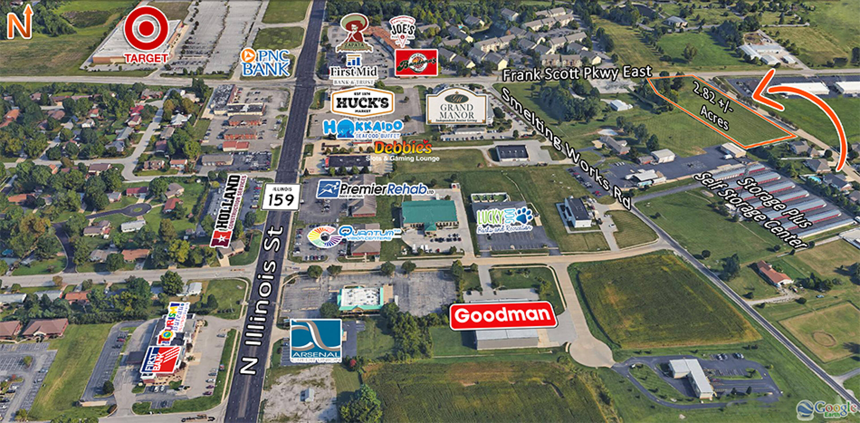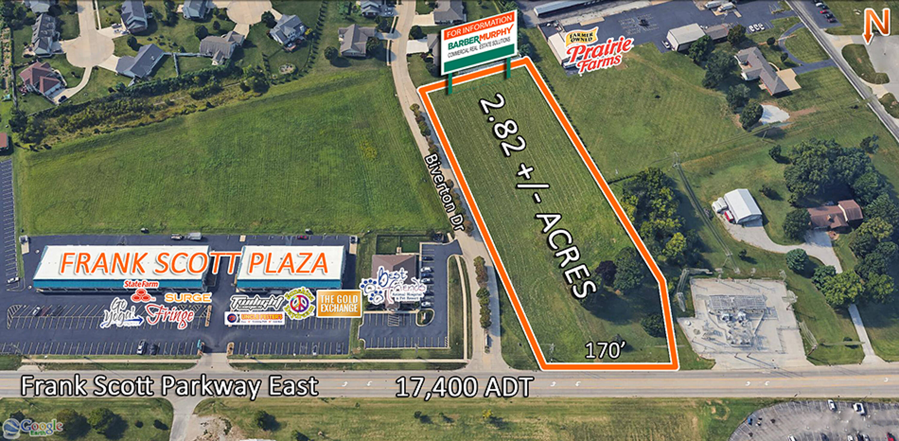 This property features: 2.82+\/- Acre Corner Lot; Located one block East of the Frank Scott Parkway and IL Route 159 Intersection; **170′ of Frontage on Frank Scott Pkwy East with 17,400 ADT**