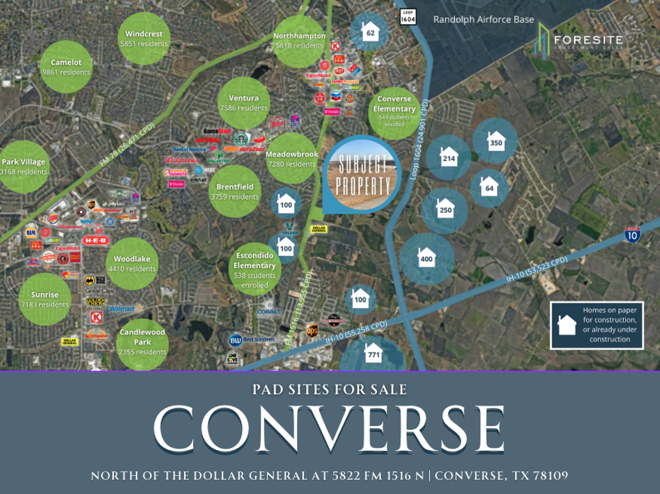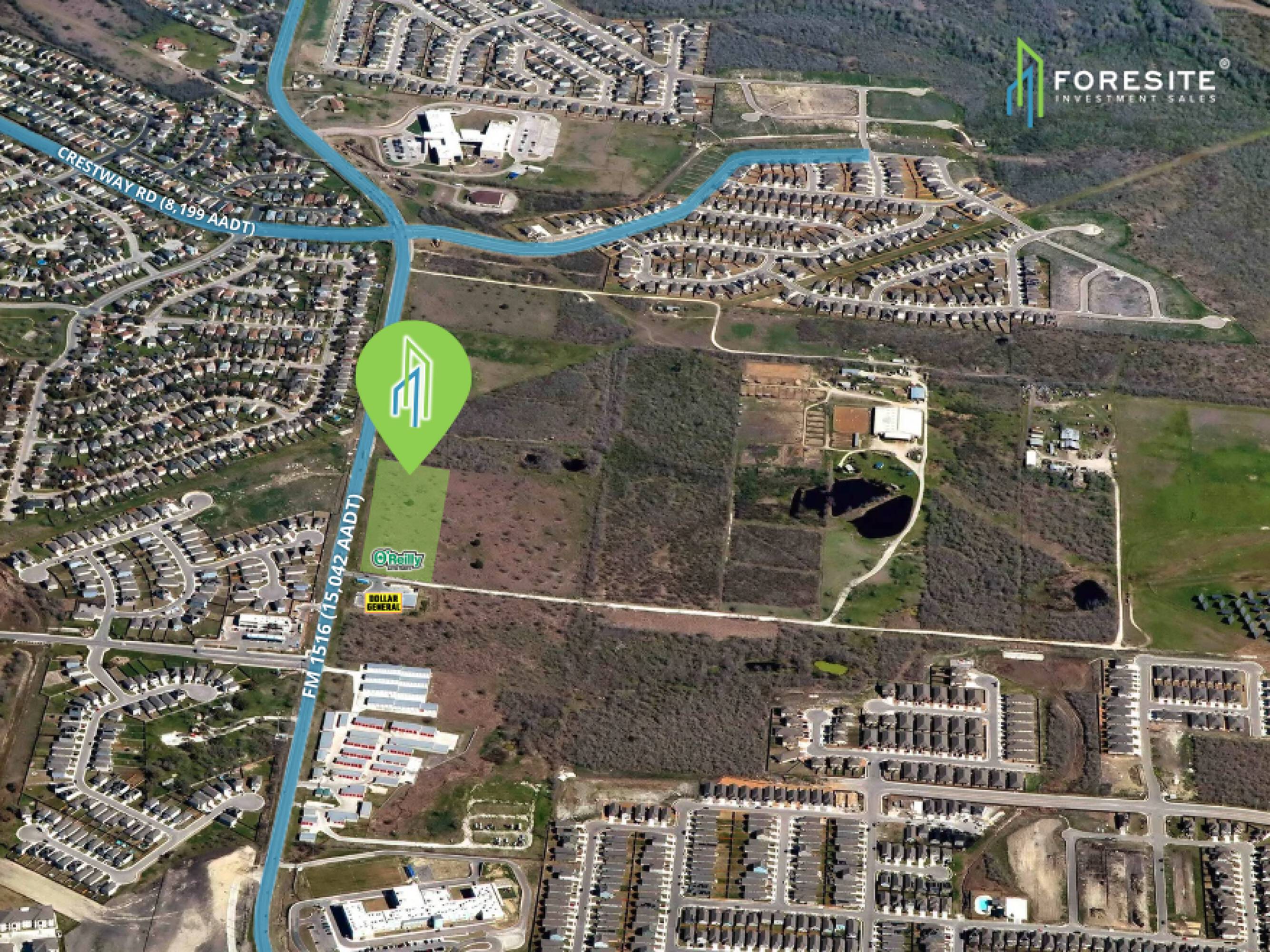 This property features: Located in the center of residential growth in Converse with 3,000 homes planned or under construction.; **Hard corner location** at the entrance of a new multifamily development on FM 1516.; Across the street from a new single‑family home neighborhood.