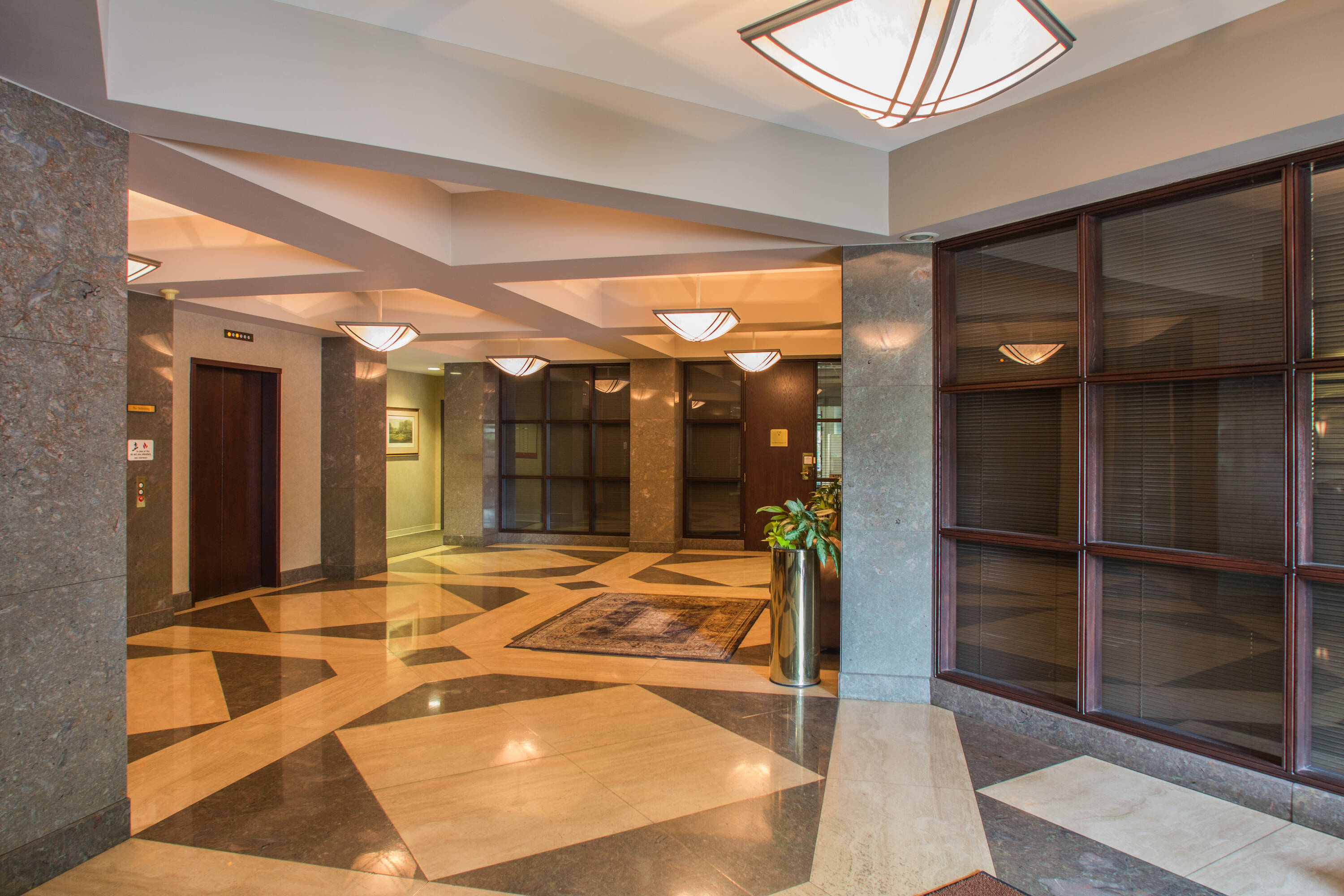 This office space is located in Chesterfield, just off I-64, and offers proximity to banking, shopping, and dining options. The modern building features an attractive lobby with window lines, covered executive parking, an employee lounge, and lower-level storage space.