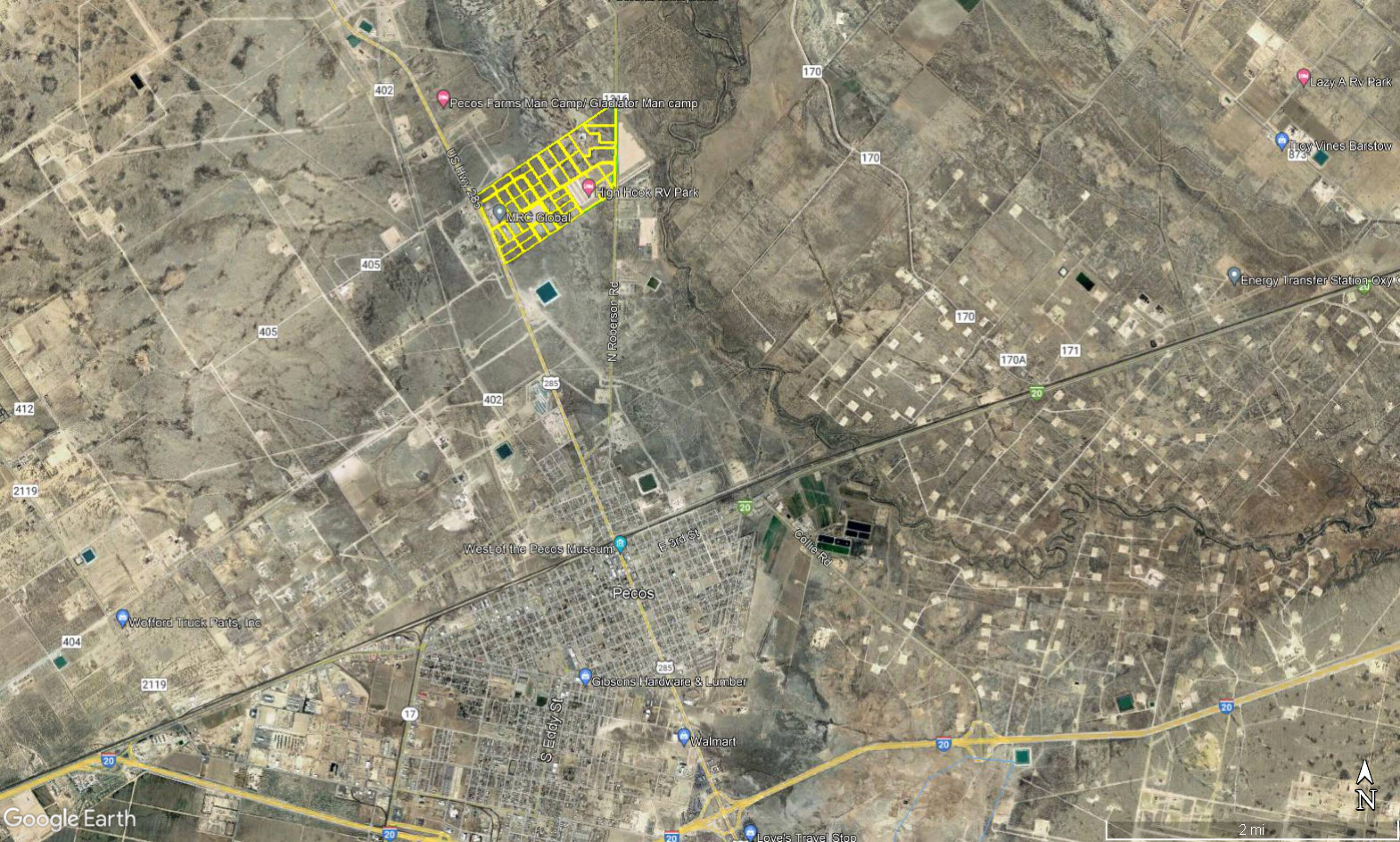 This property features: Prime location near Pecos, Texas, ideal for oilfield or commercial businesses.; Significant income potential from existing leases with Allison Crane & Rigging and High Hook Man Camp through December 2027.; 175 acres of undeveloped land in 29 platted lots available for sale or lease.