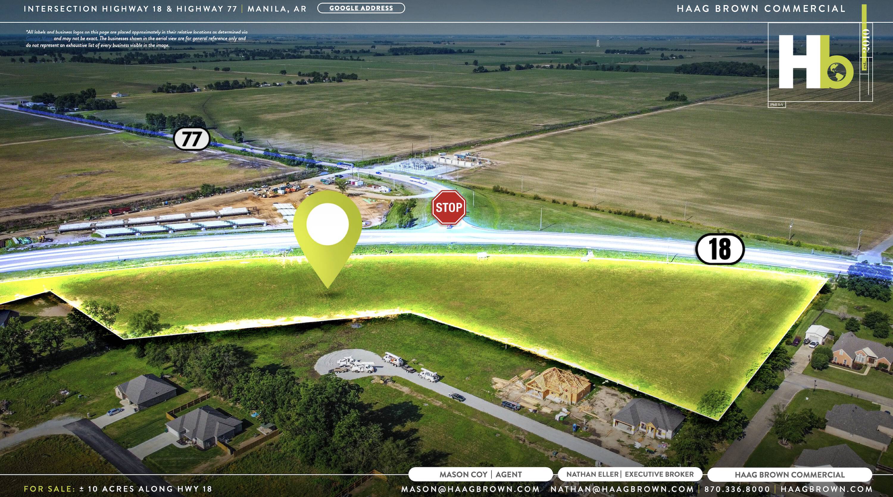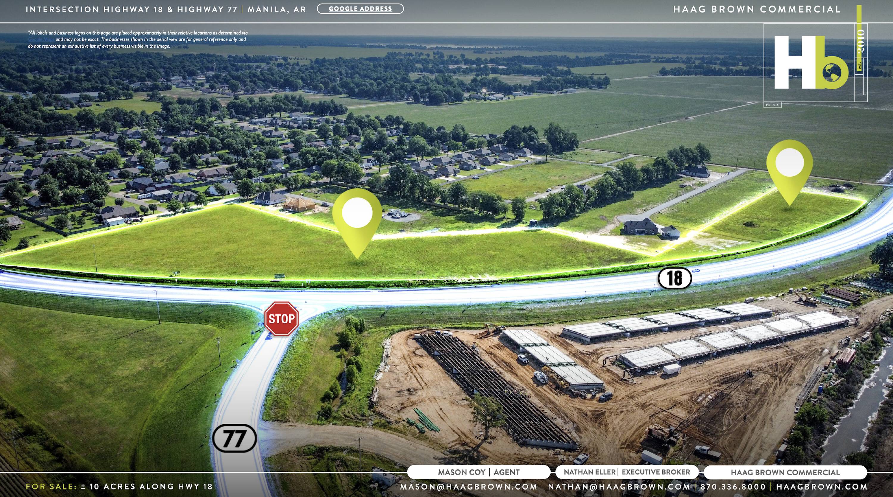 This 10-acre commercial real estate parcel is located at the intersection of Highway 18 and Highway 77 in Manila, Arkansas. The property offers visibility and accessibility, making it suitable for various commercial ventures seeking a location in Northeast Arkansas. Its location, size, and infrastructure make it a choice for investors and developers looking to capitalize on Manila's commercial real estate market. This site is suitable for a new retail center, hospitality facility, or mixed-use complex.