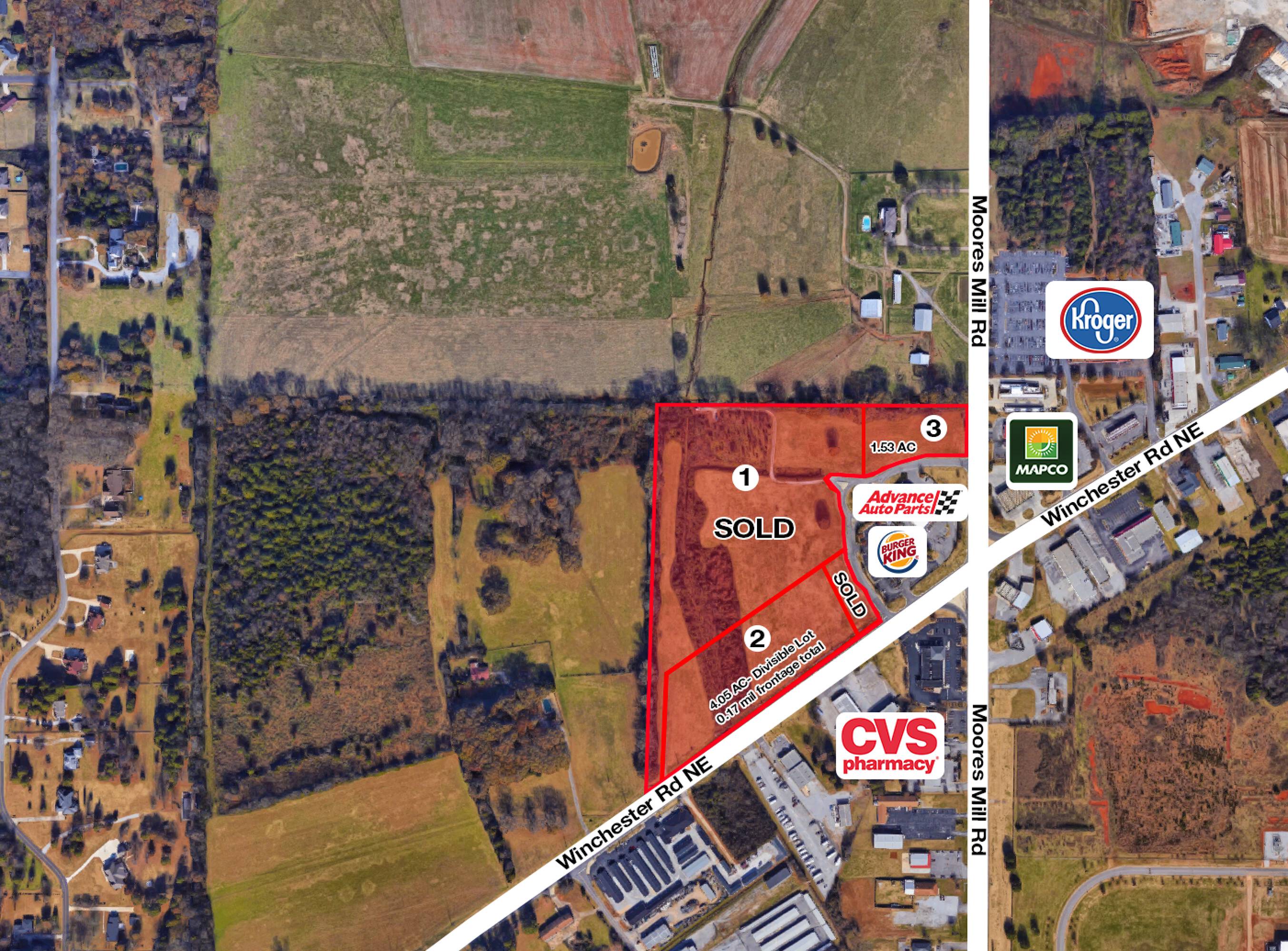 Divisible land parcels available near Moores Mill and Winchester Road.