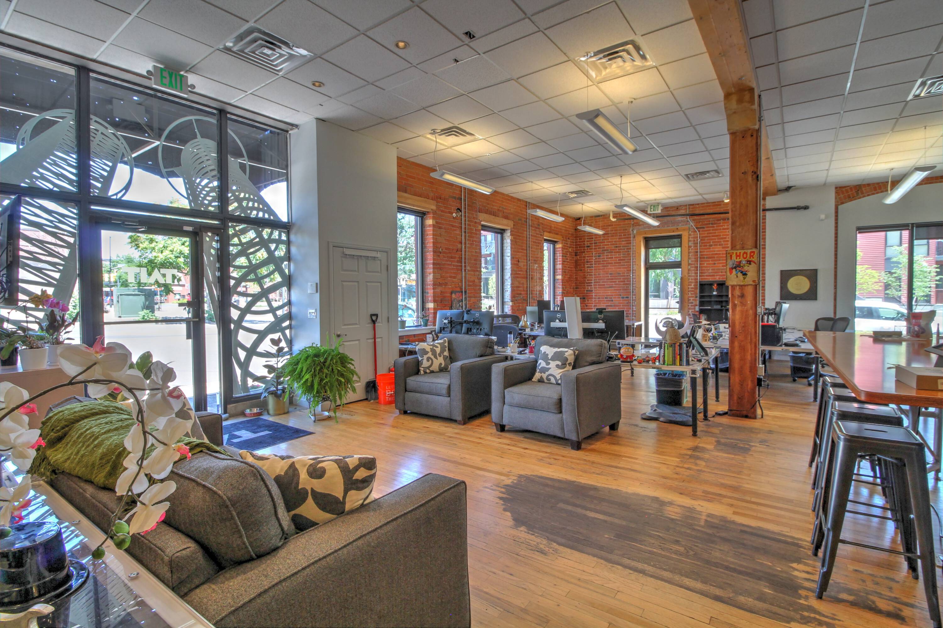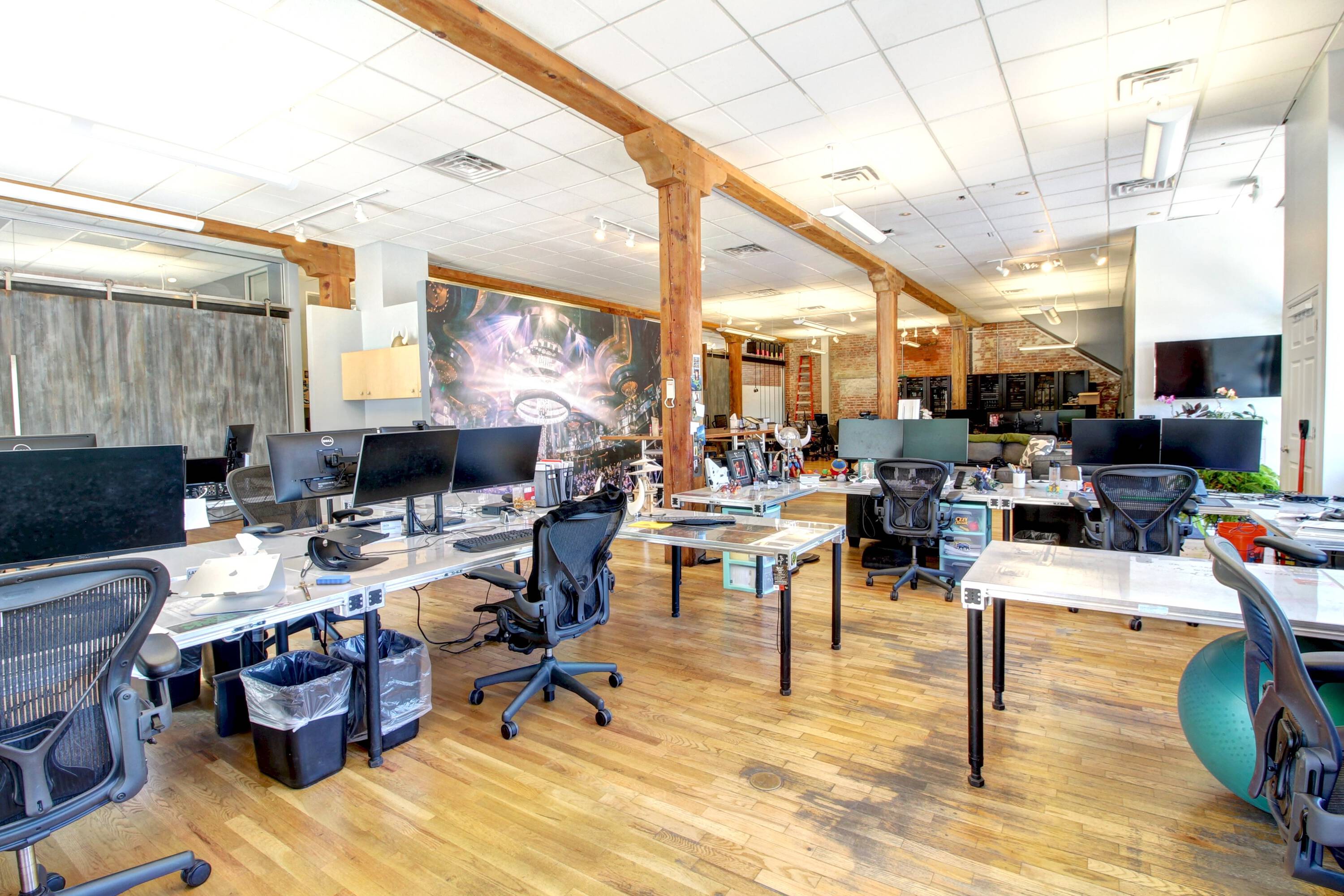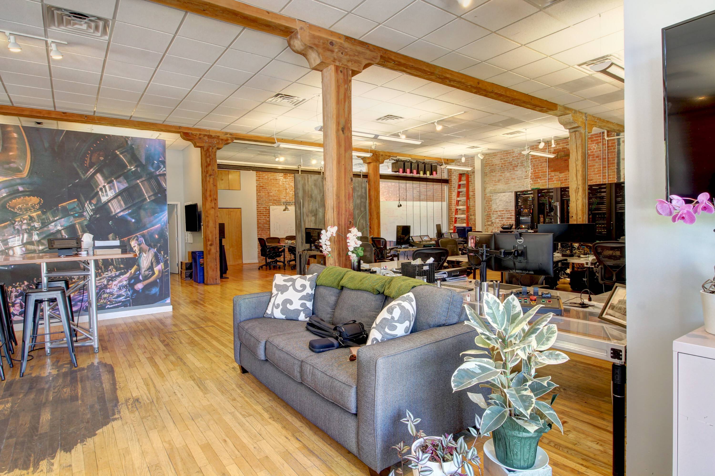 Classic building with exposed brick, wood timbers, and high ceilings.