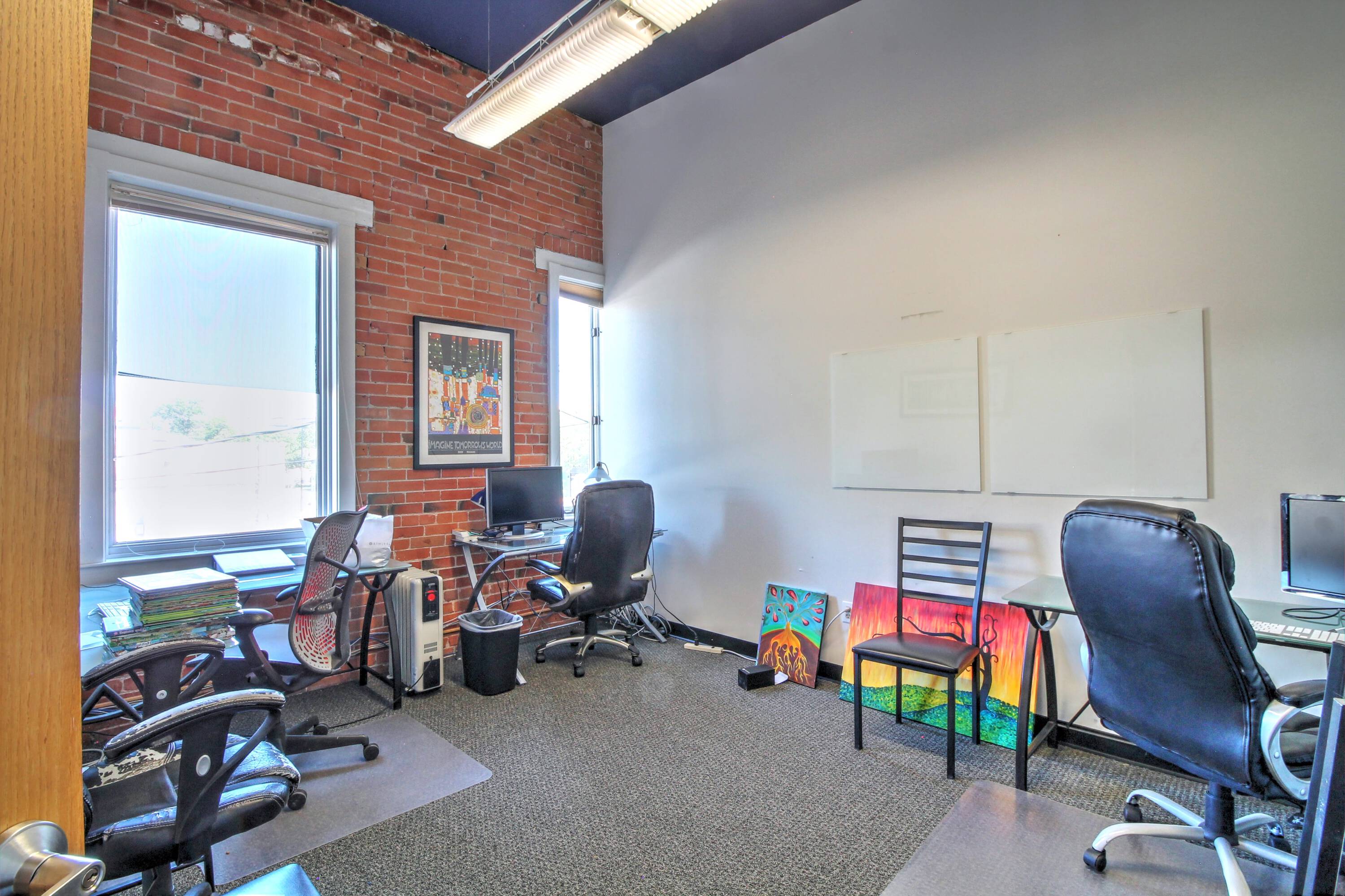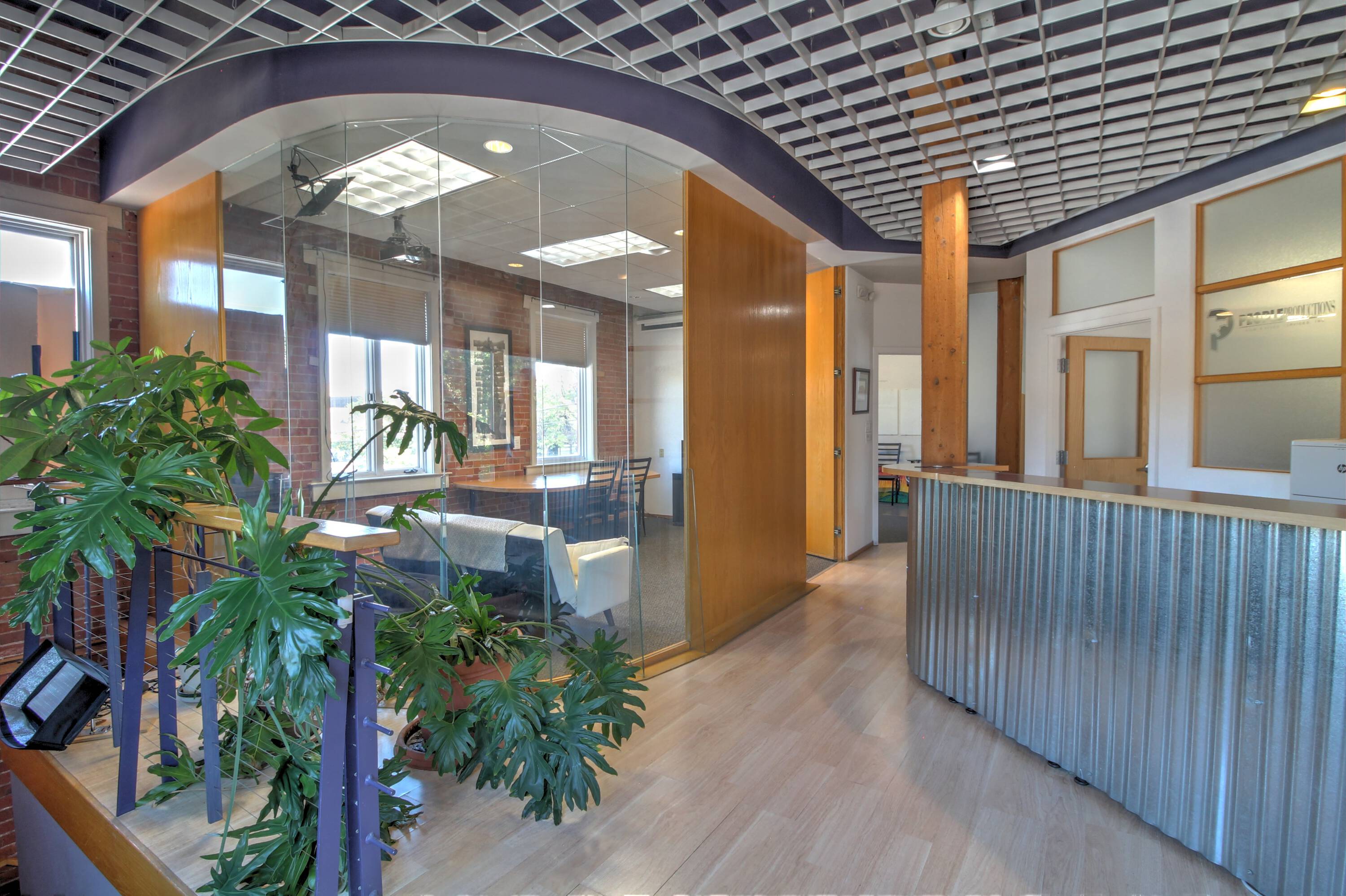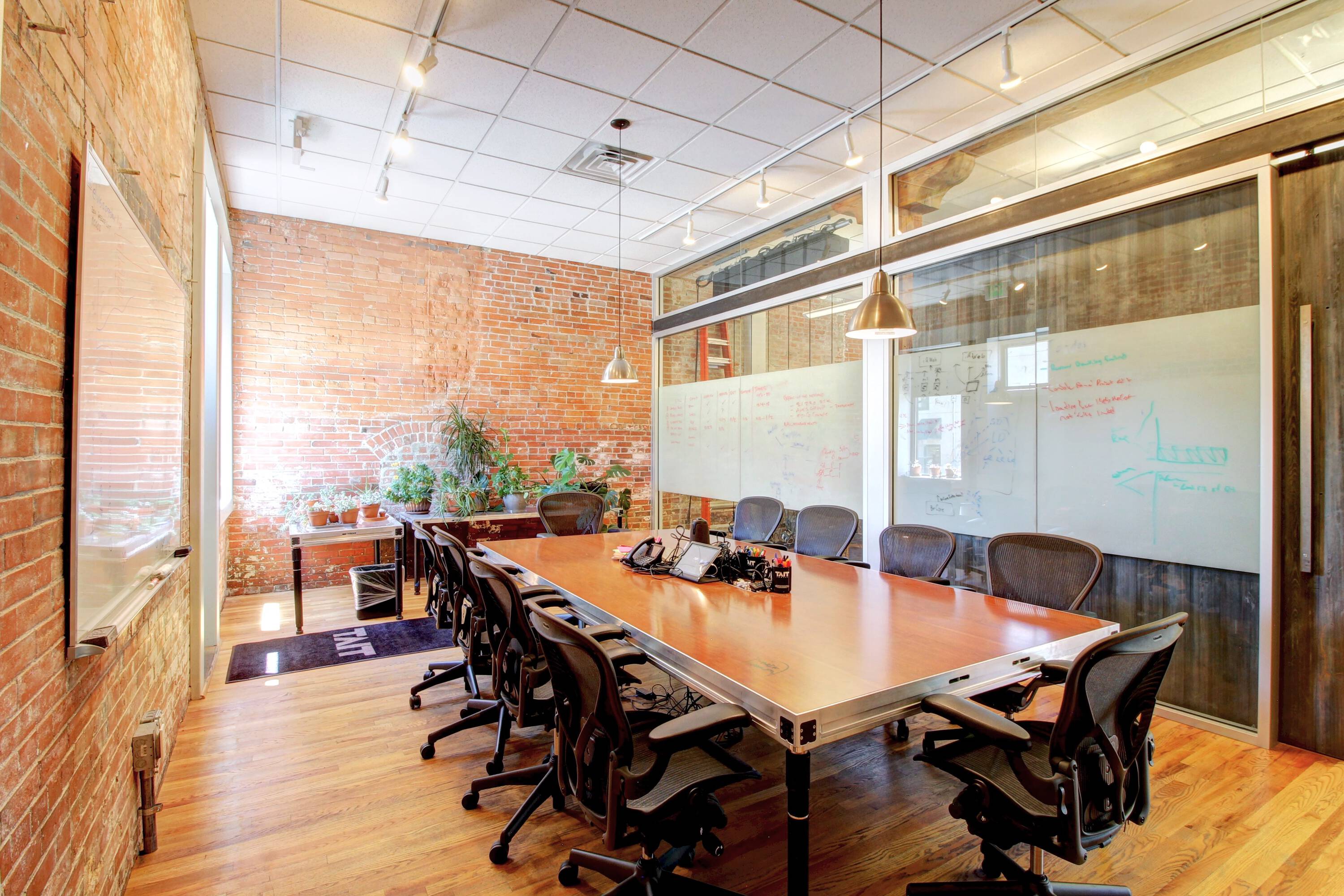 Classic building with exposed brick, wood timbers, and high ceilings.