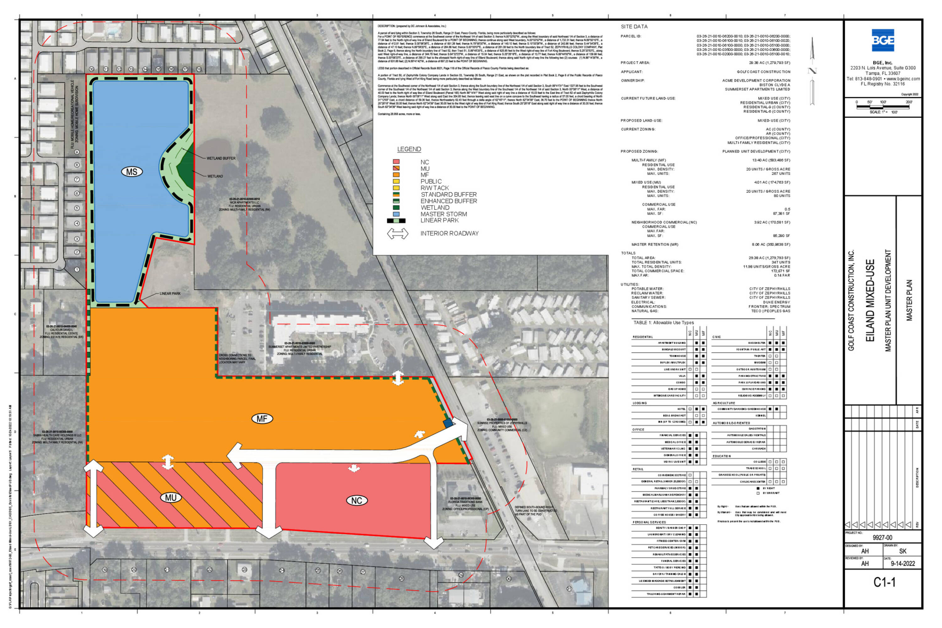 This 3.8-acre site is zoned for office, professional, retail, and hotel development and can be divided as needed. The site is level to sloping, all upland, and contiguous to a 354-unit multifamily residential complex under development to the north and west. The new VA Center construction is completed on the east side of the site, presenting an opportunity for a medical office building. All utilities are available to the site, with a roadway on the south side (Eiland Blvd) and to the east, connecting to Ft King Road. A water retention area is covered in the 25 acres being developed for the multifamily development, contiguous to the north. The property is located on the northwest corner of Eiland Blvd and Ft King Road, 1350 feet west of US 301 Gall Blvd, the major commercial corridor running to Tampa to the south and to Dade City to the north. It is located within the city of Zephyrhills, the largest city in Pasco County, Florida, on the north side of the Tampa Bay region. The zoning is "Neighborhood Commercial". Permitted uses include office, retail, services, restaurant, small hotel, medical, and park type uses. A bank is contiguous to the east, and a VA hospital is on the east side of Ft King Road.