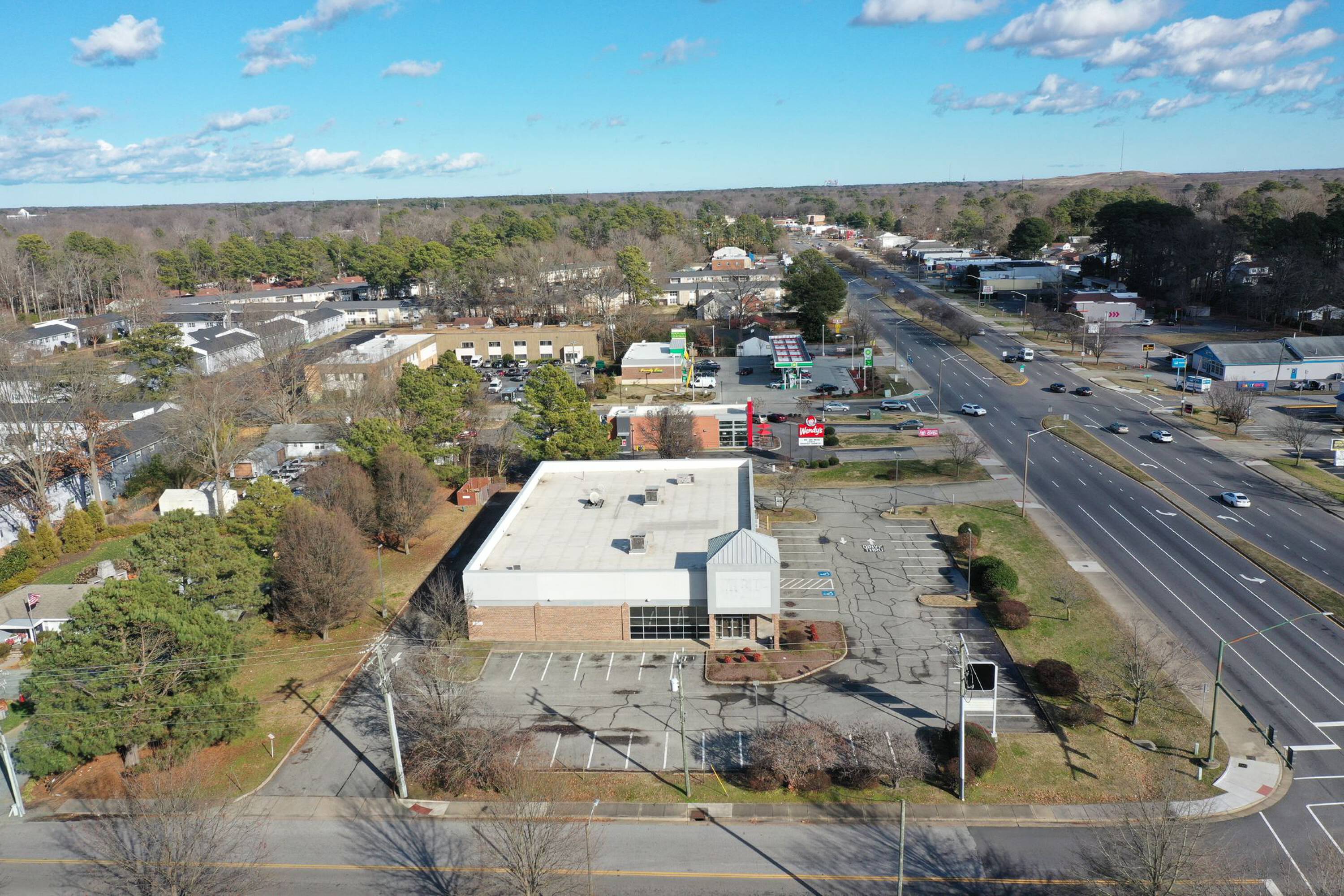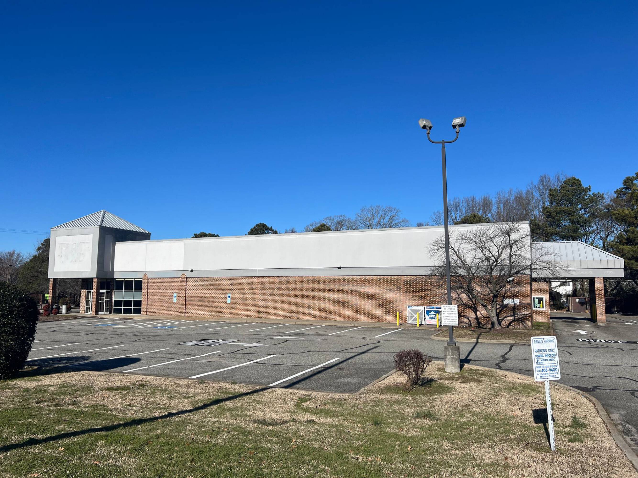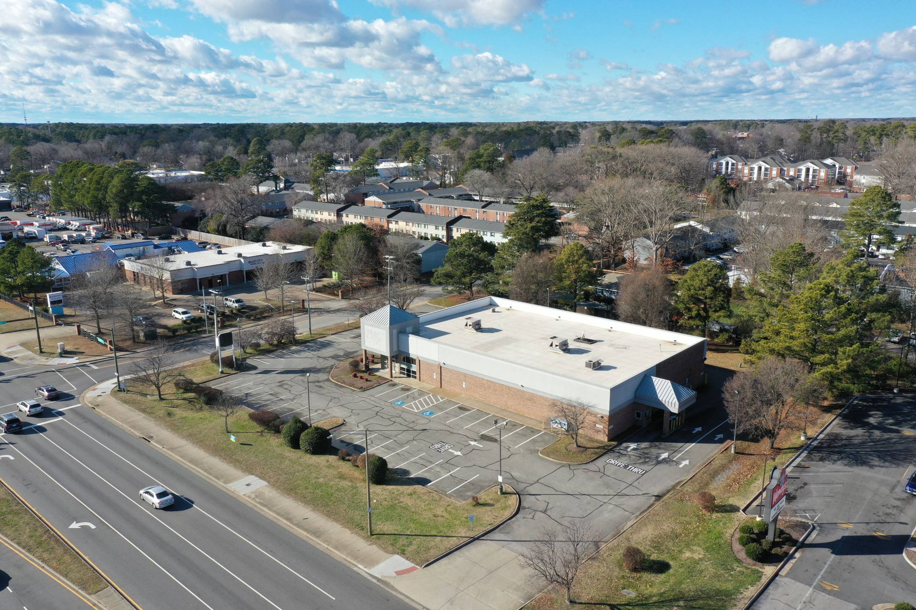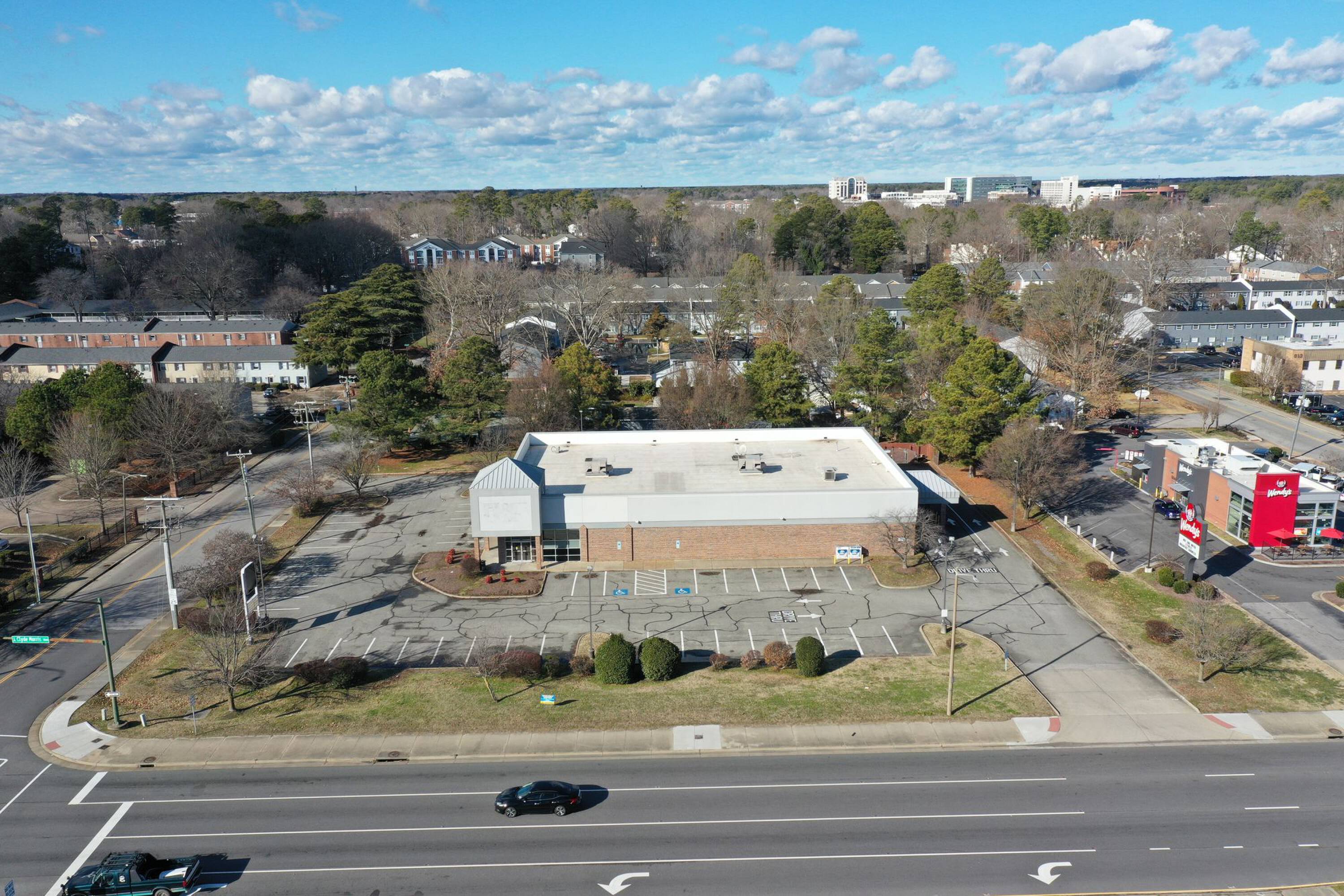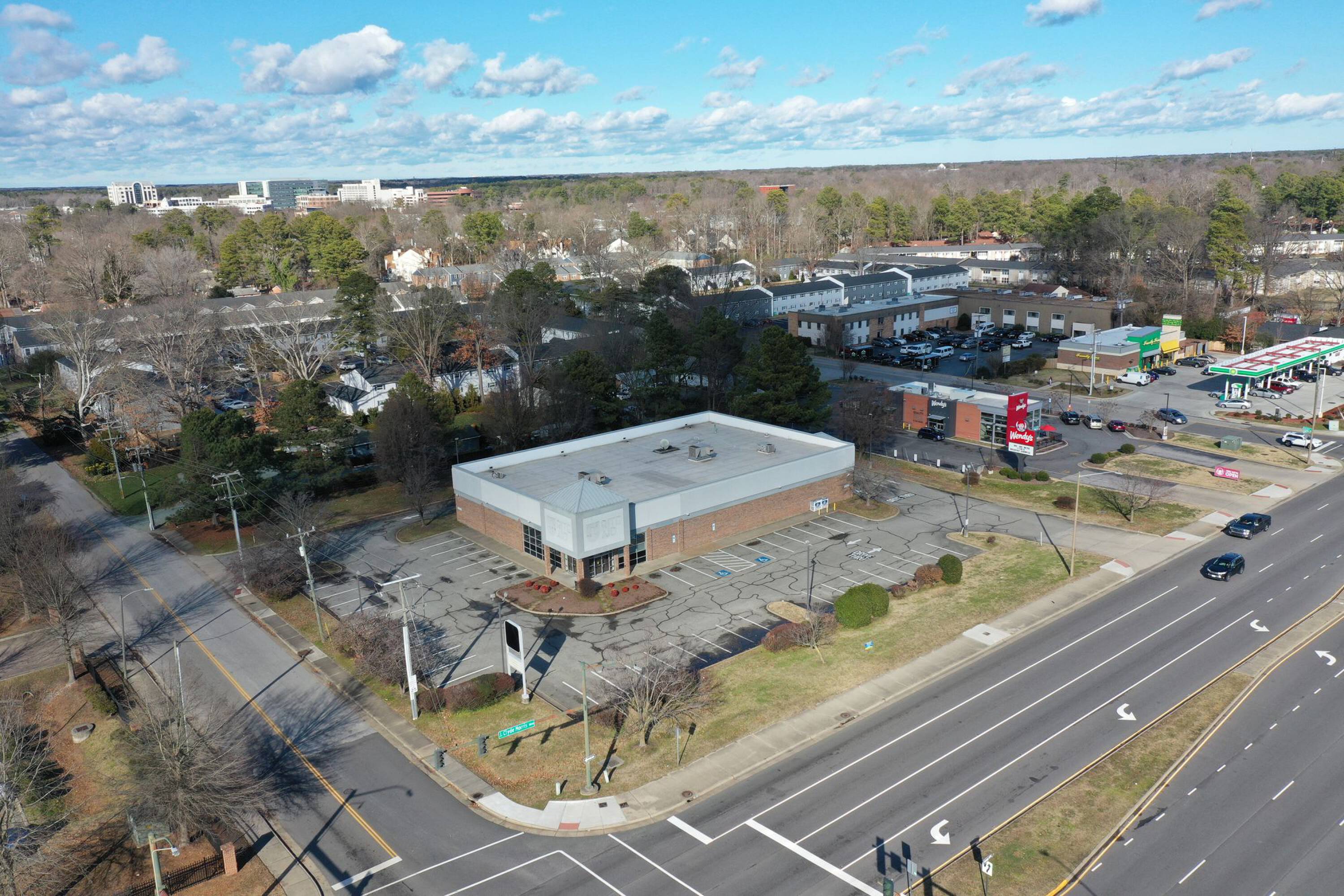 This former Rite Aid building is available for lease. The property is located at the signalized intersection of J Clyde Morris Boulevard and Dusk Court/Woods Road, situated between Interstate 64 and Jefferson Avenue. The location benefits from its position at a lit intersection near Jefferson Avenue.