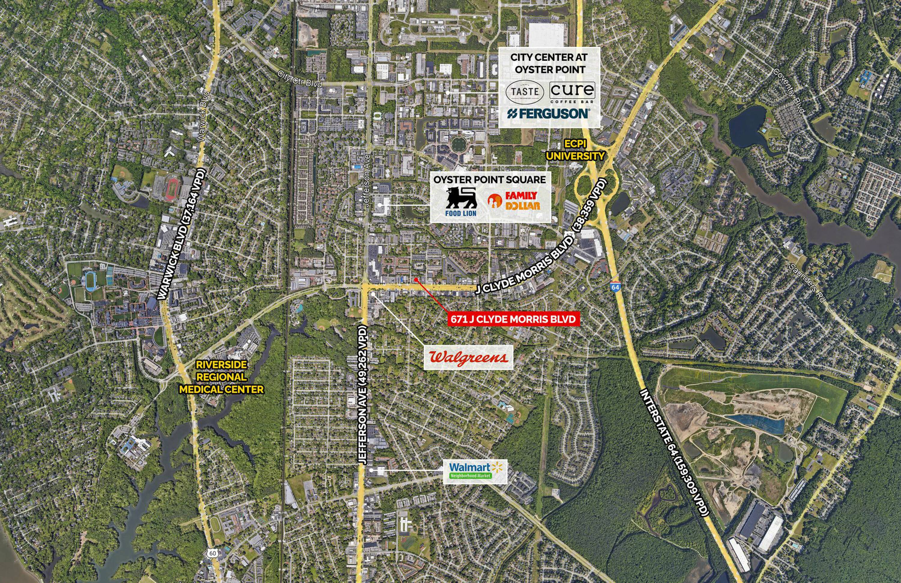 This property features: Signalized intersection location on J Clyde Morris Blvd.; High‑visibility location at the intersection of J Clyde Morris Blvd and Dusk Court/Woods Road.; Proximity to Interstate 64.