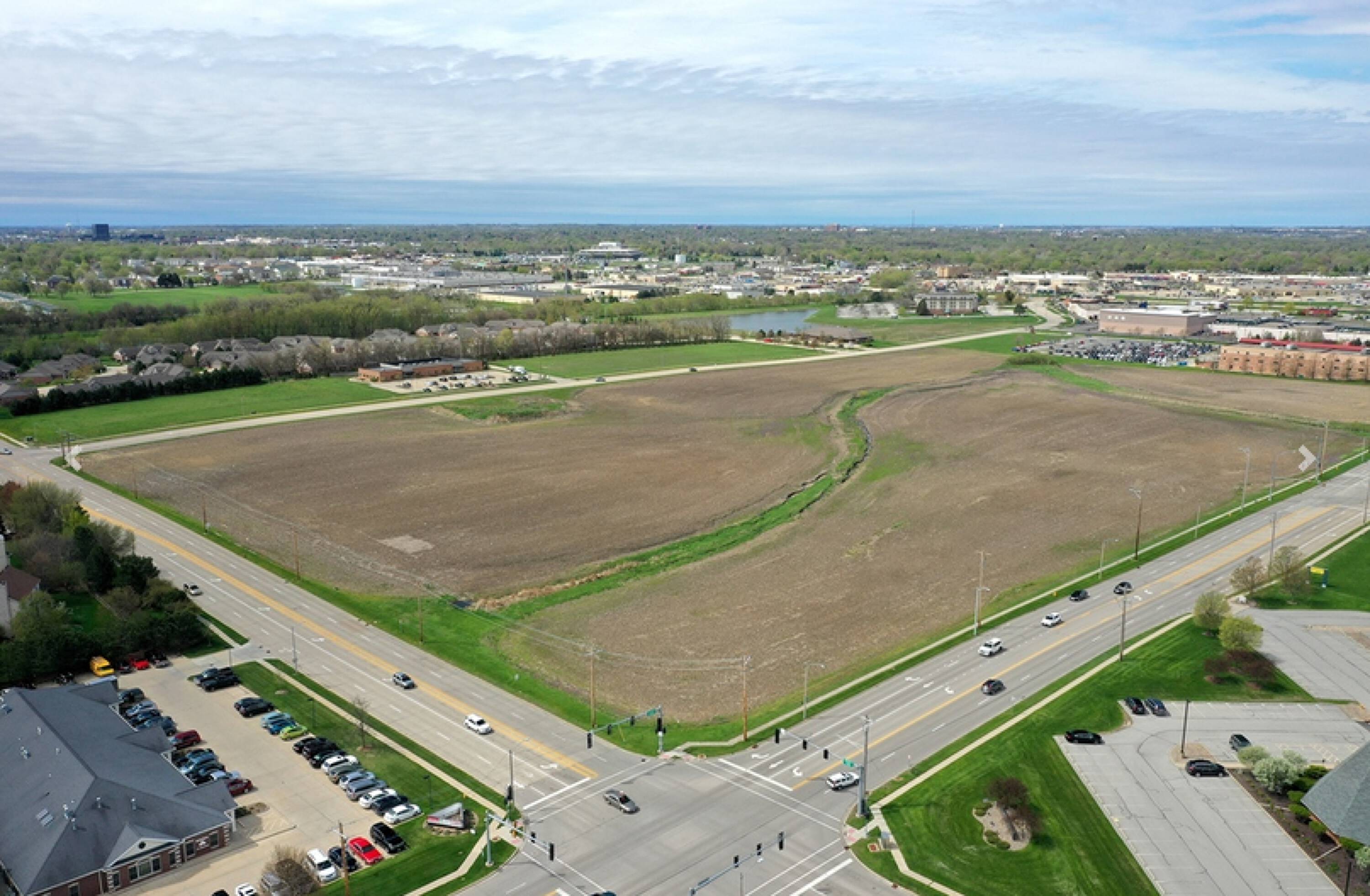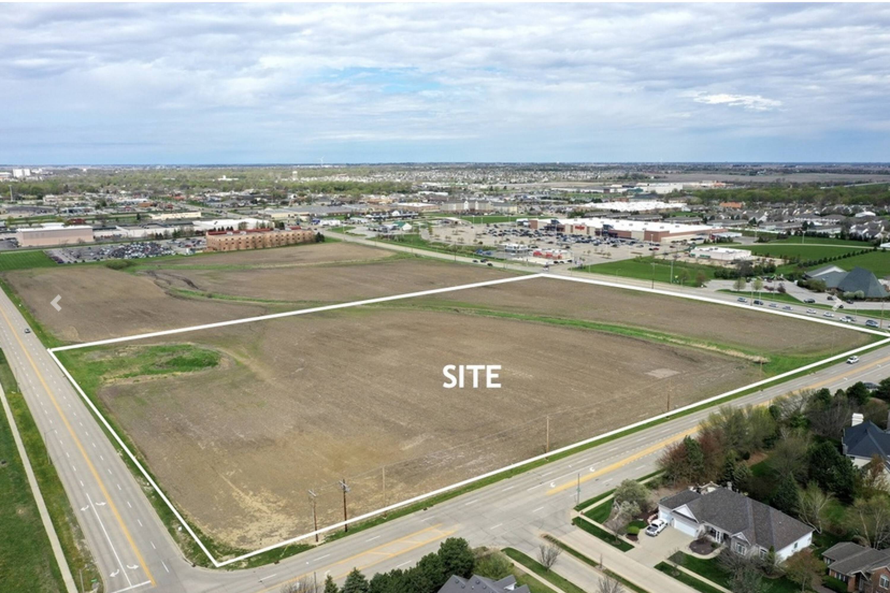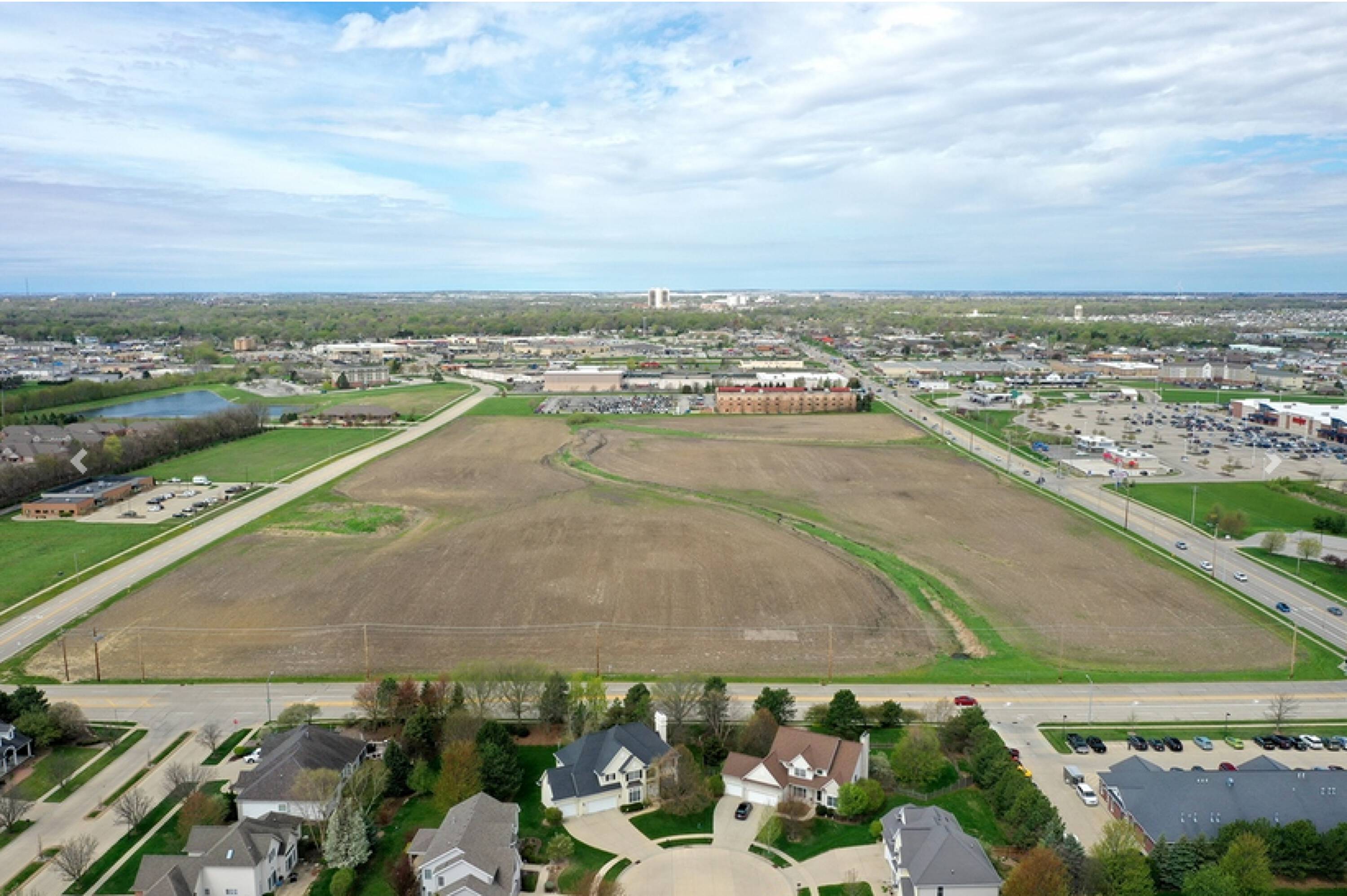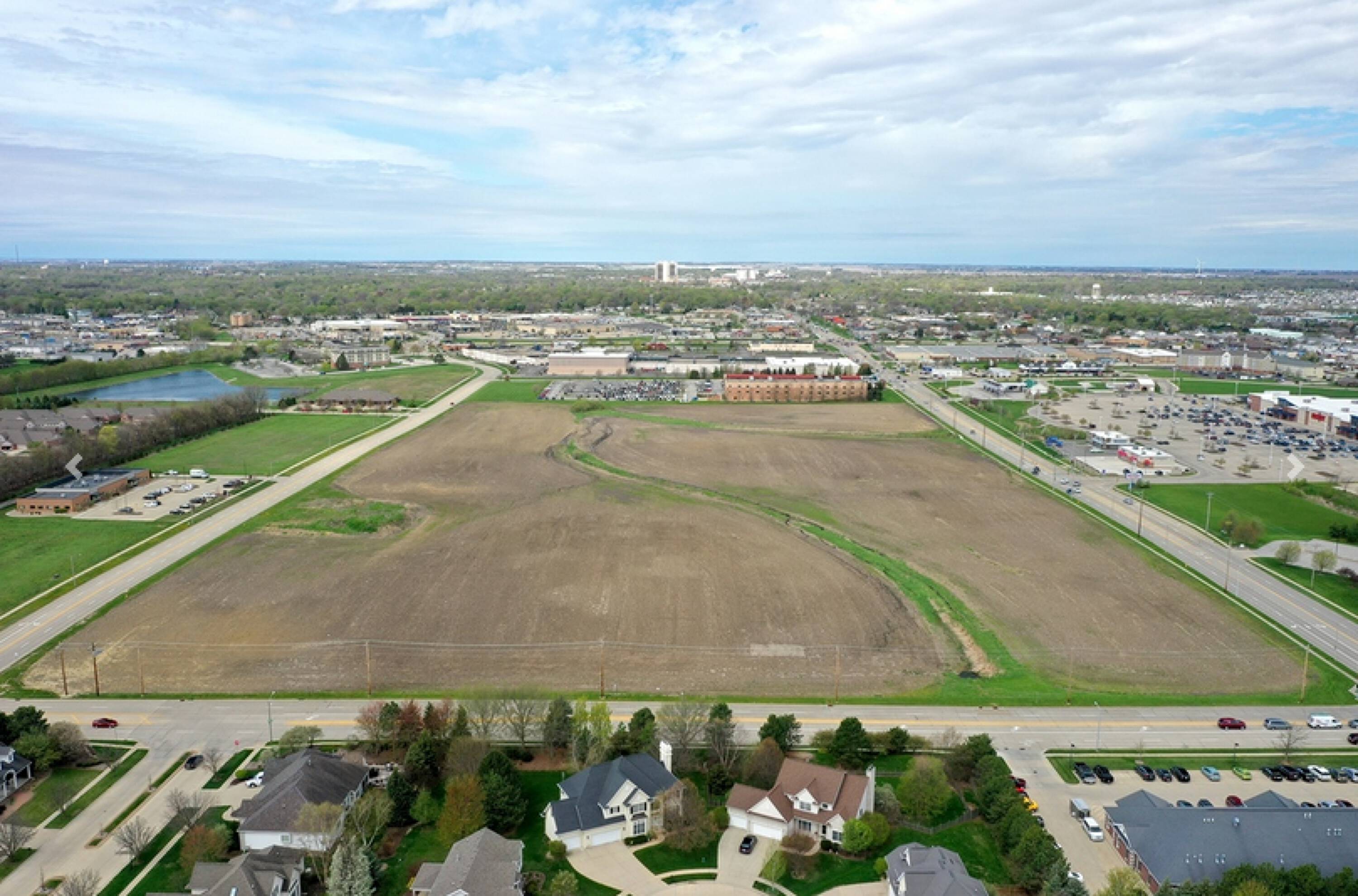 Vacant land surrounded by retail, office, and residential areas.