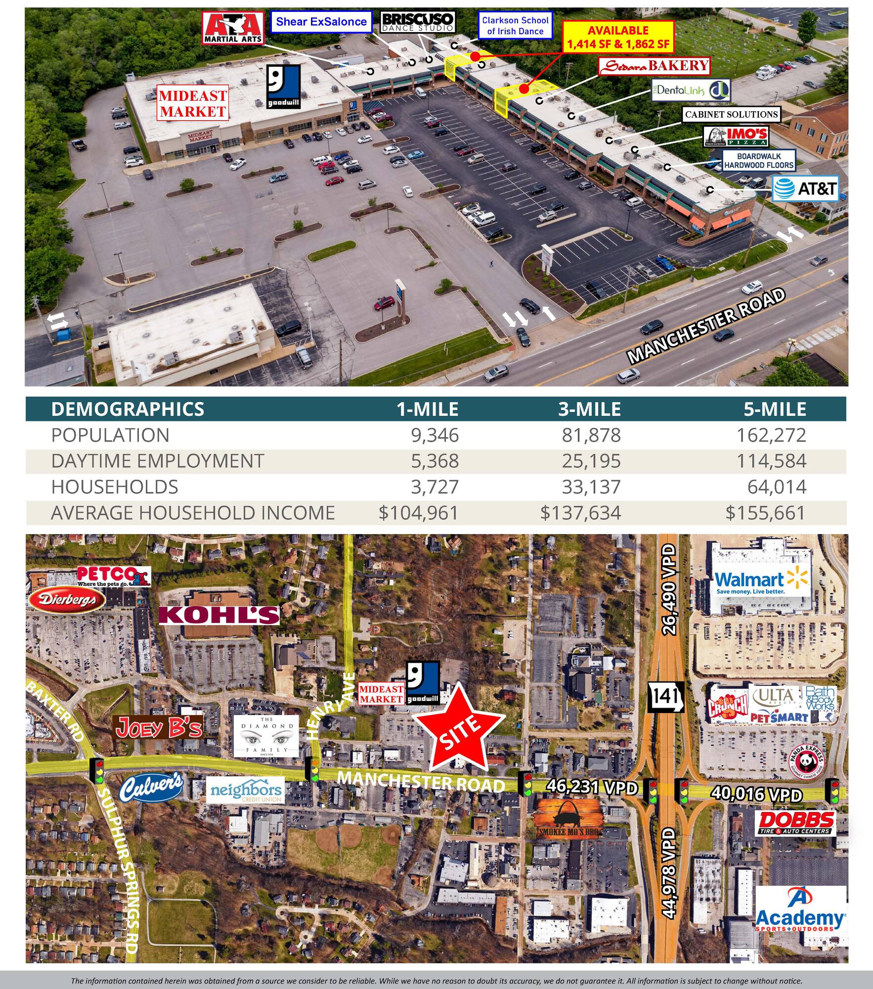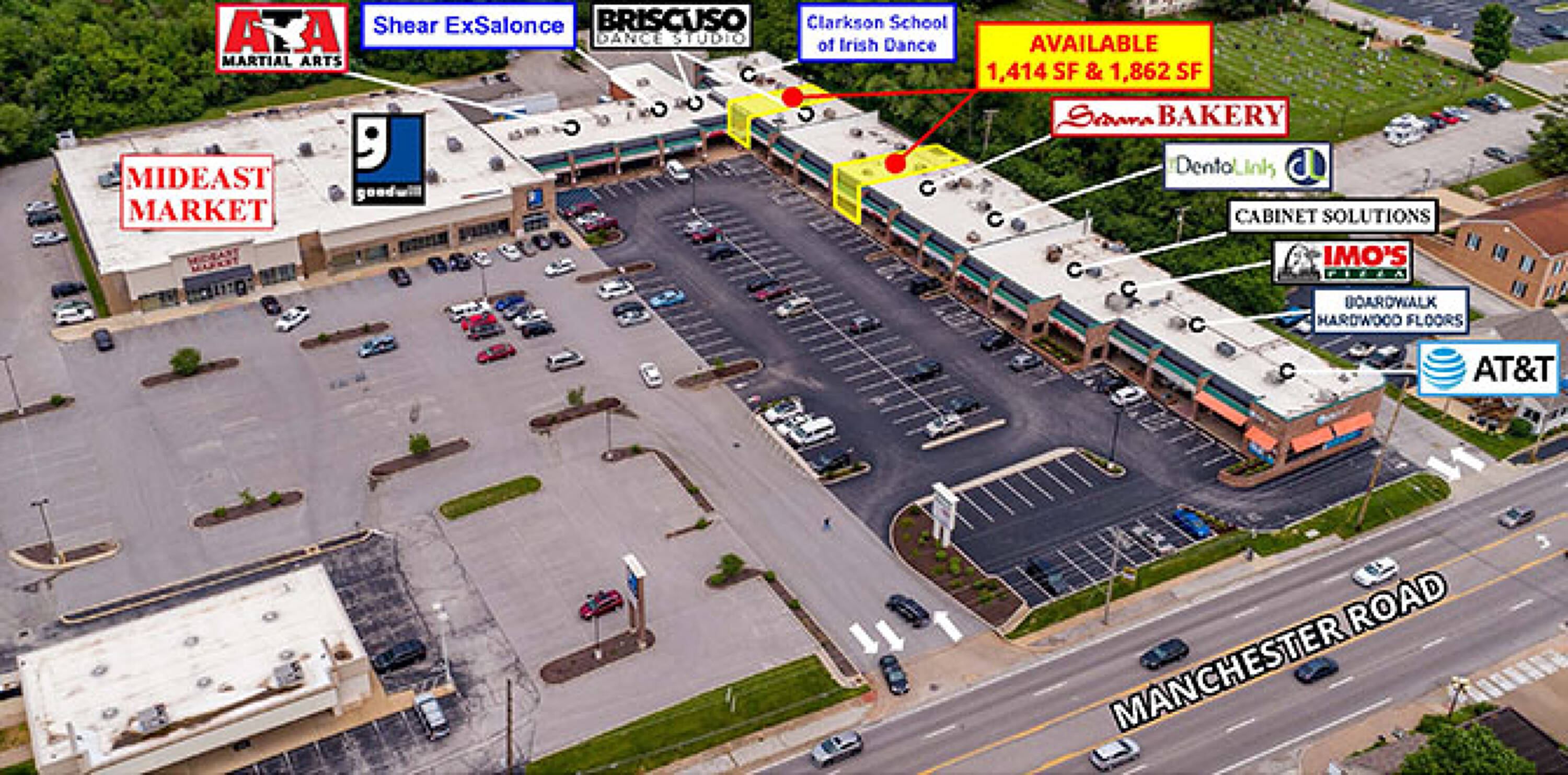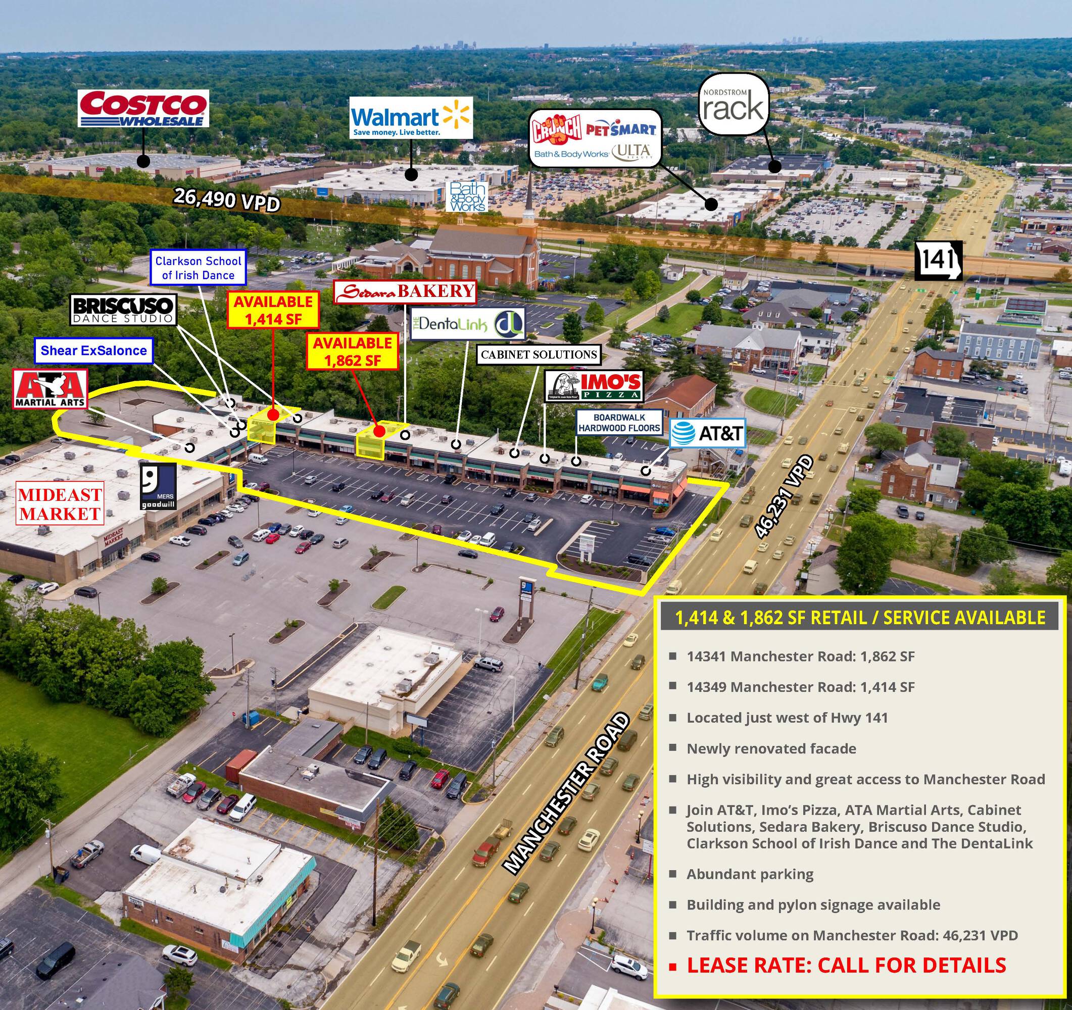 This retail space is located west of Hwy 141 and offers high visibility and great access to Manchester Road. The property features a newly renovated façade. Current tenants include AT&T, Imo's Pizza, ATA Martial Arts, Cabinet Solutions, Sedara Bakery, Briscuso Dance Studio, The Clarkson School of Irish Dance and The DentaLink. Abundant parking is available. Building and pylon signage are also available. The traffic volume on Manchester Road is 46,231 vehicles per day.