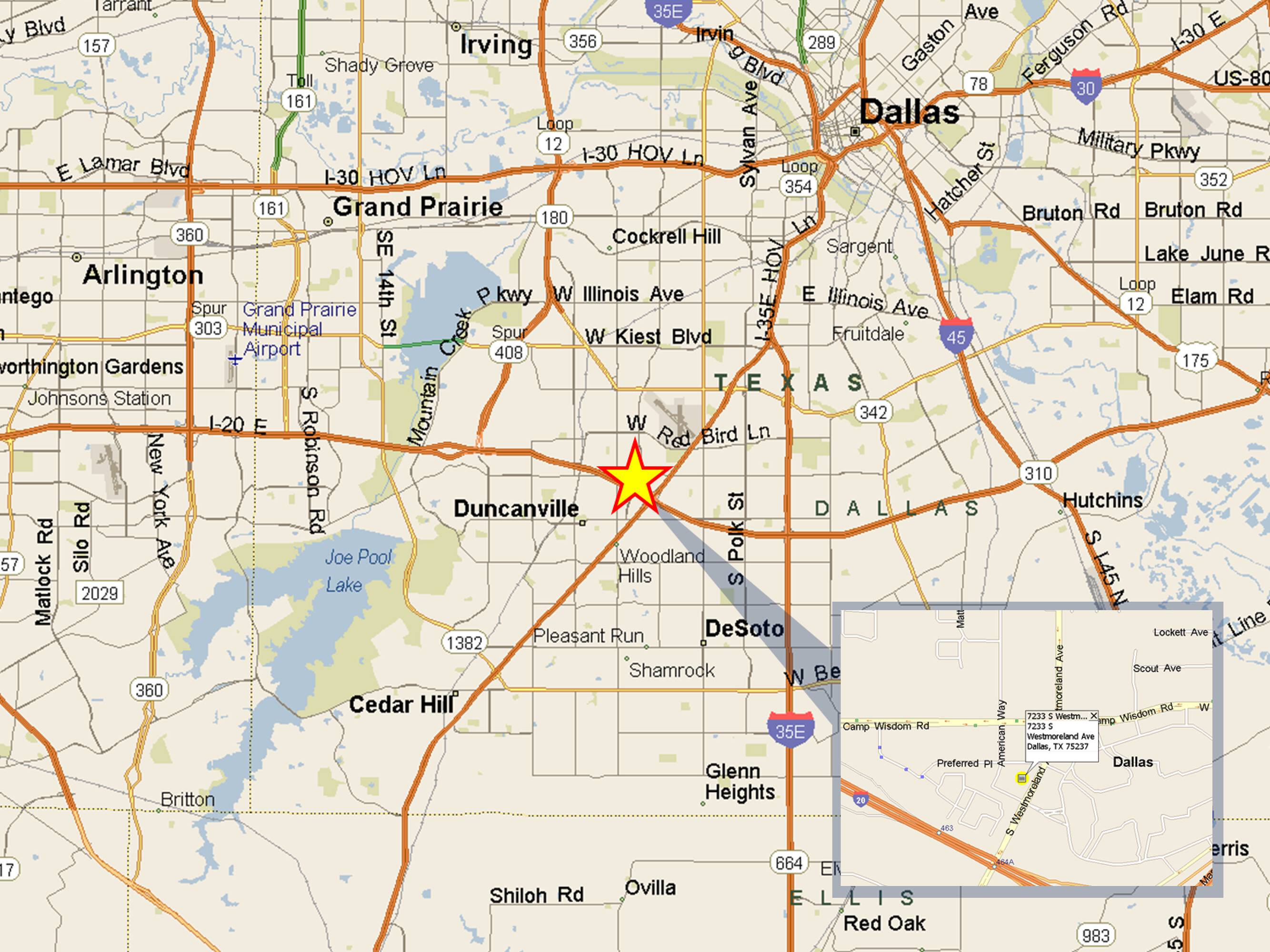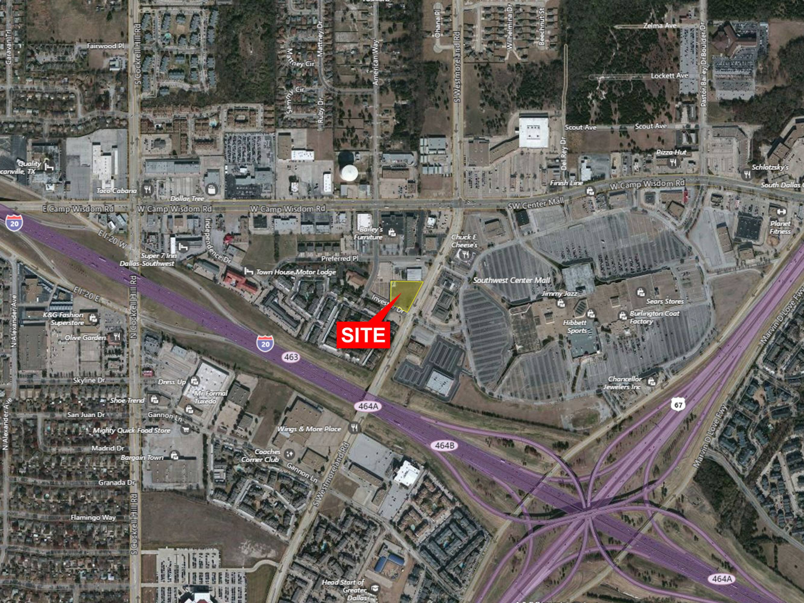 The property is located at 7233 S Westmoreland Rd, at the northwest corner of S Westmoreland Rd and Investor Dr, in Dallas, Texas 75237. It is situated one block from Interstate 20 and directly across the street from Southwest Center Mall.