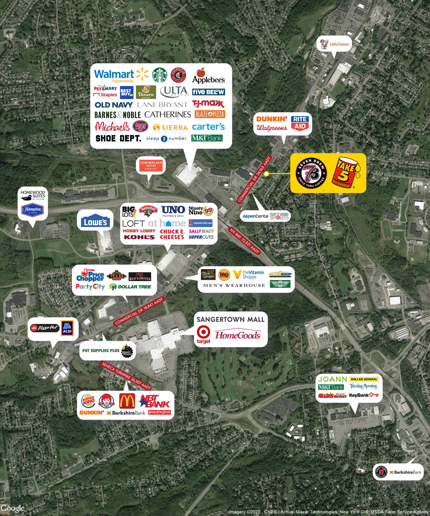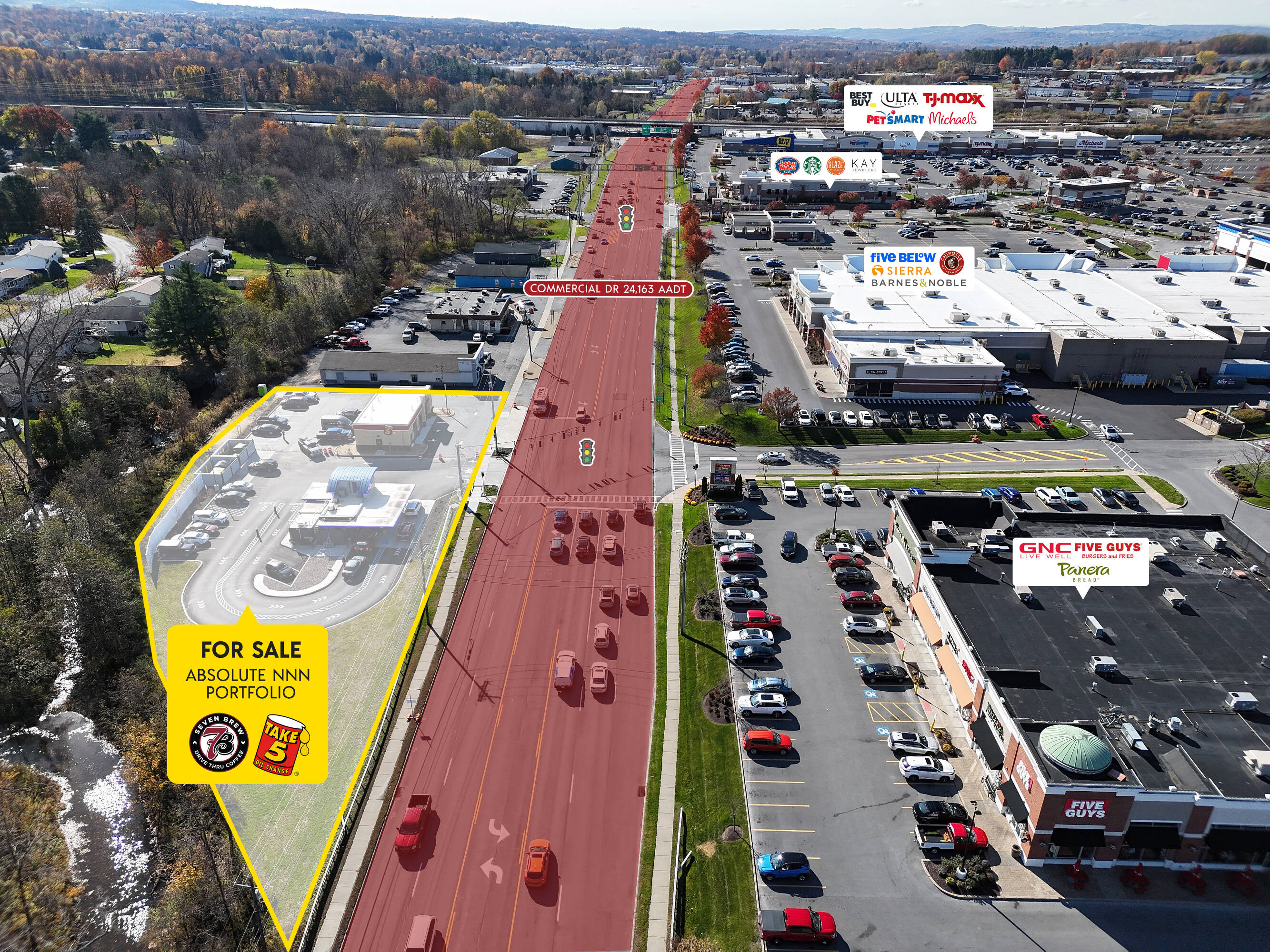 Two absolute NNN leased investment properties are available in New Hartford, NY, tenanted by 7 Brew Coffee and Take 5 Oil Change. 7 Brew has a new 10-year lease with four 5-year options, including 10% rental increases every 5 years. Take 5 Oil Change has a new 15-year lease with four 5-year options, also featuring 10% rental increases every 5 years. The leases are structured to grow Net Operating Income and hedge against inflation, with zero landlord responsibilities. The properties are located at the signalized entrance to New Hartford Consumer Square, a 500,000 square foot super regional power center anchored by Walmart. Other national tenants in the center include TJ Maxx, PetSmart, Barnes & Noble, Best Buy, Five Below, Sierra, Michaels, Chipotle, Starbucks, Applebee’s, and Jersey Mike’s. Situated in the New Hartford Commercial Drive retail corridor, the location serves a six-county region. Nearby national tenants include ALDI, Lowe’s, Kohls, At Home, Hobby Lobby, Hannaford grocery, Market 32 grocery, Party City, Planet Fitness, and Target. The surrounding area within a 5-mile radius has over 100,000 residents, with a median household income of $91,473. The site sees almost 25,000 vehicles a day.