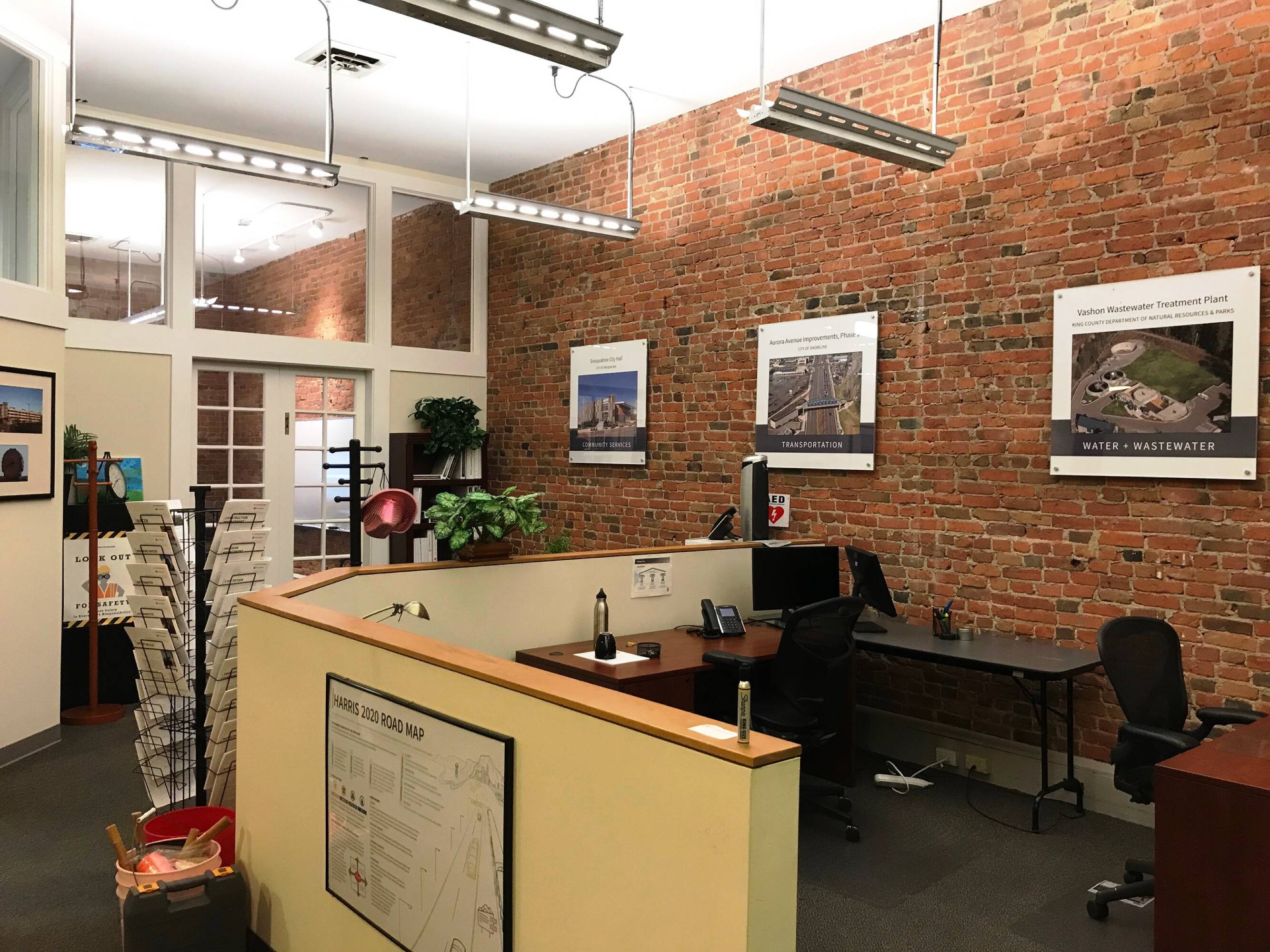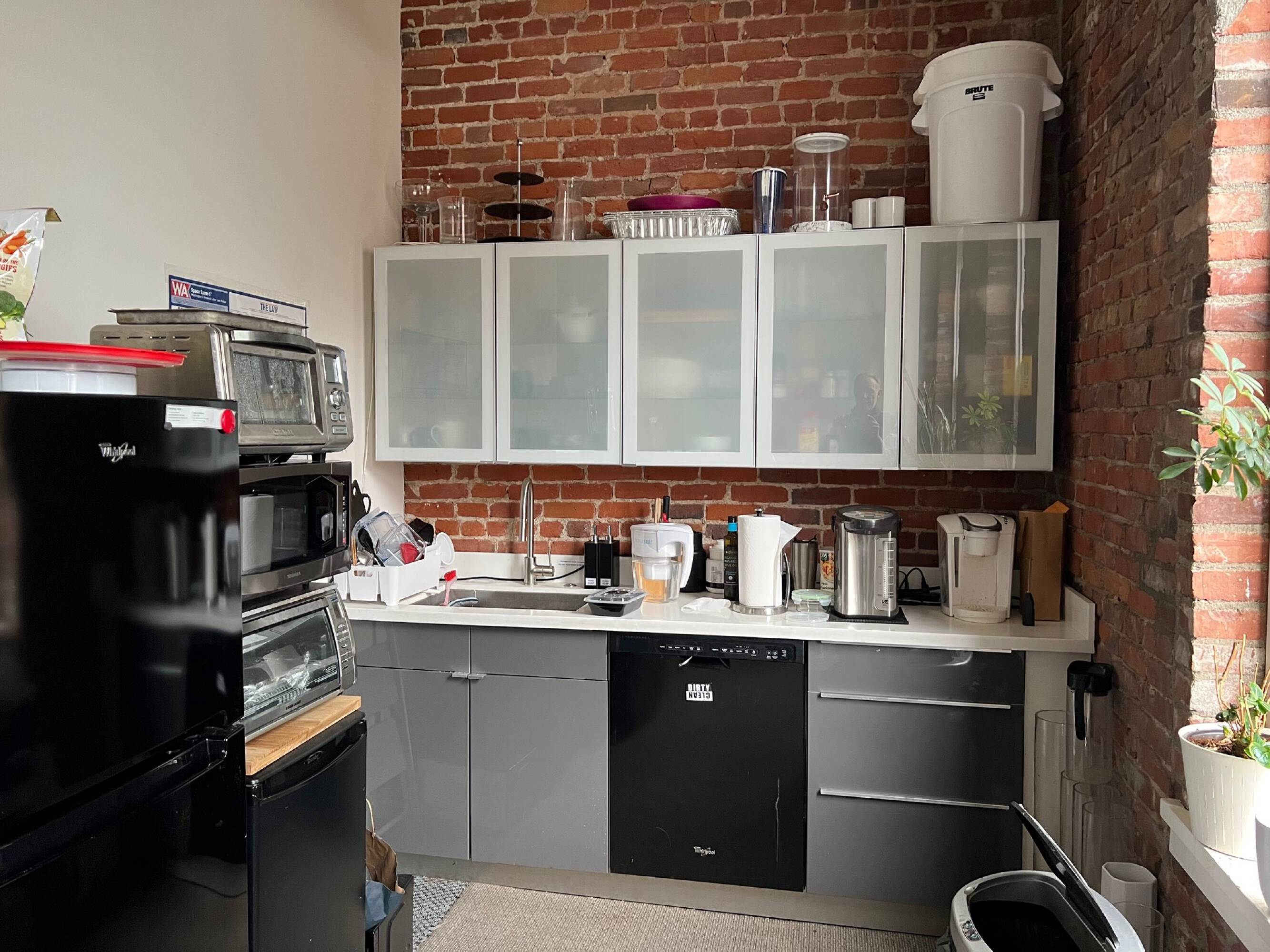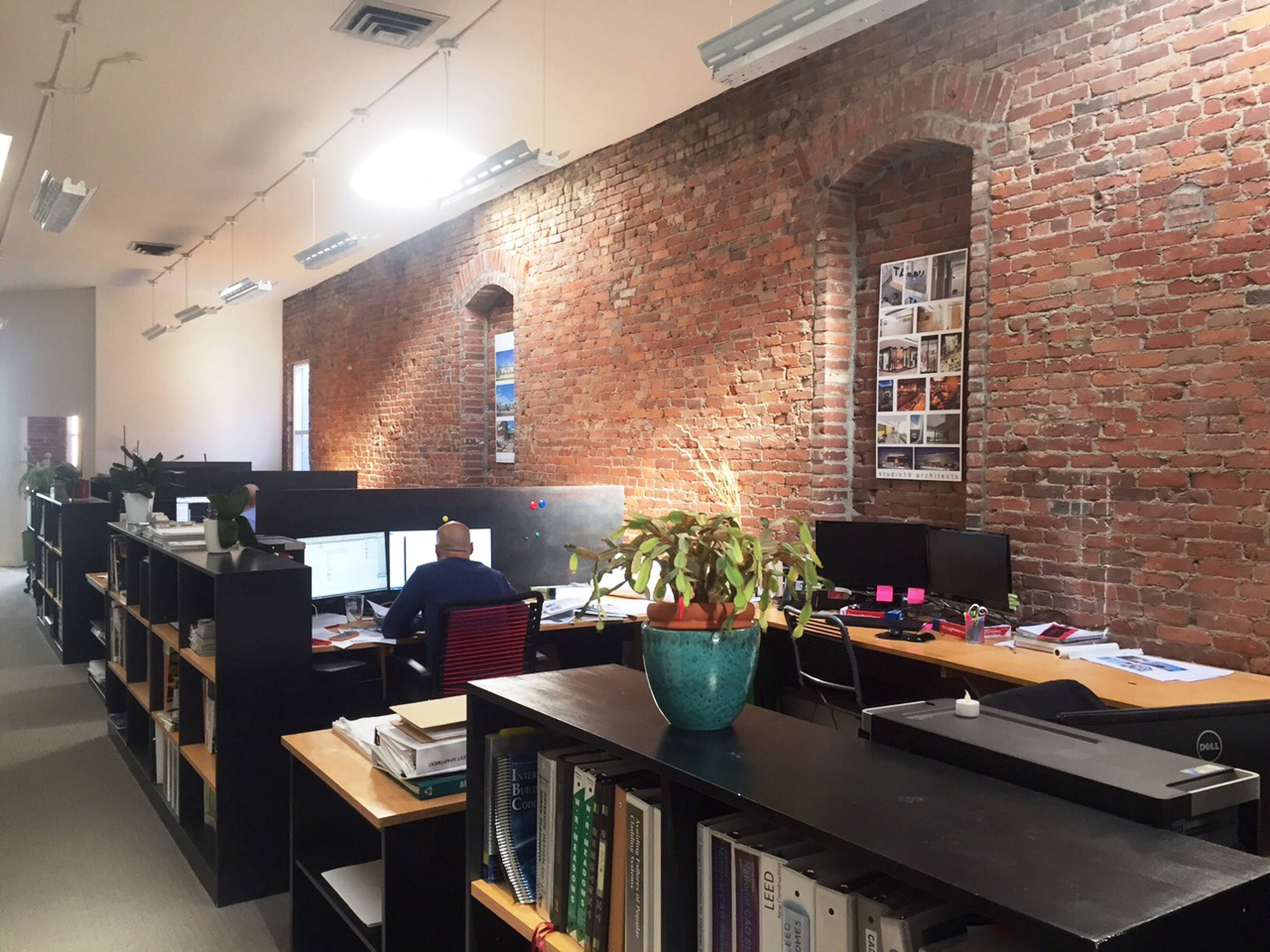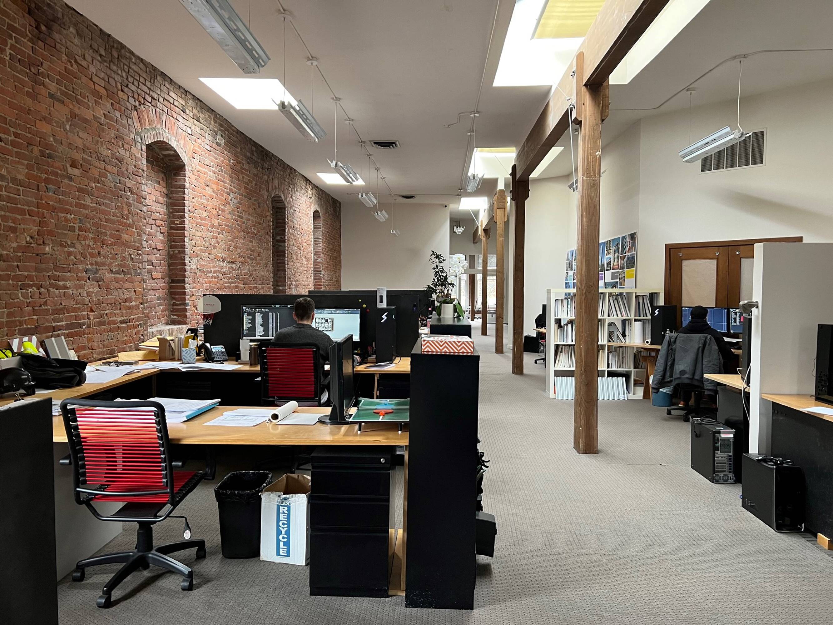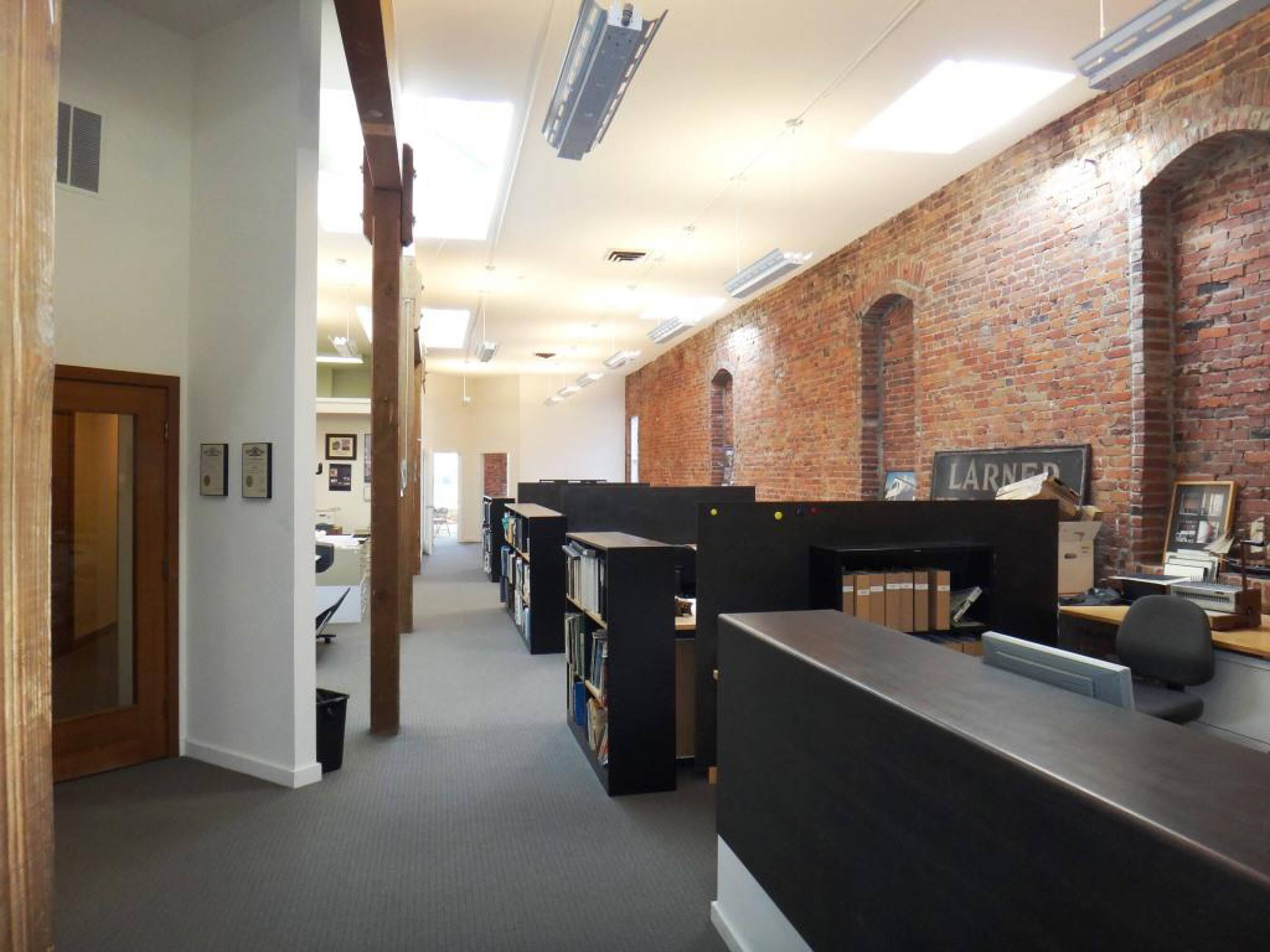 Office space for lease featuring high ceilings and brick walls.