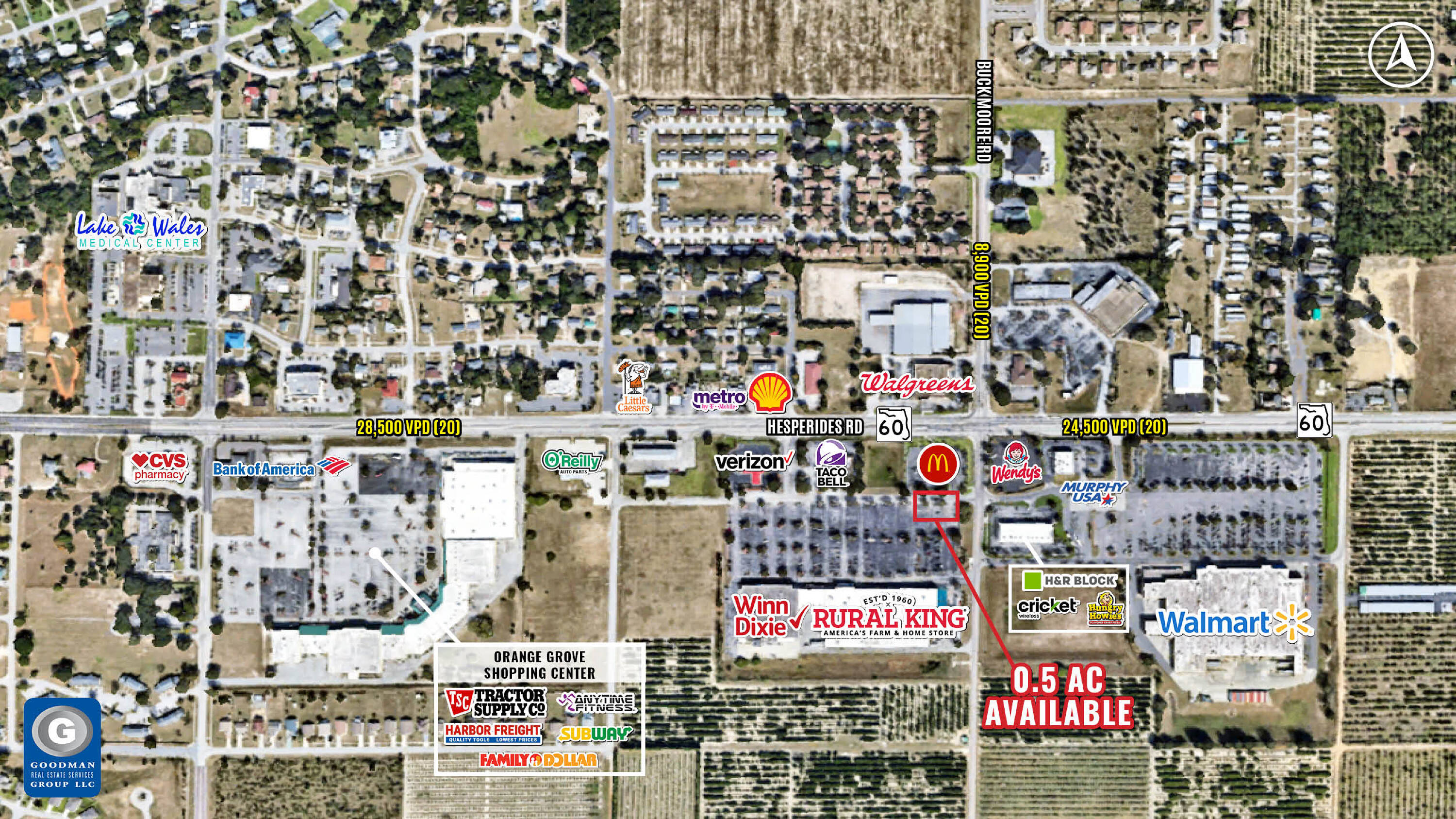 This 0.5-acre outlot is located in the East Gate shopping center. The location benefits from high traffic, with over 20,000 vehicles passing the site daily on State Road 60. The surrounding area has a population of over 185,000 within a 15-mile radius, with average household incomes above $60,000. The property is near Lake Wales Medical Center, which operates 160 beds and employs over 520 people. The shopping center includes Rural King and Winn-Dixie, and nearby retailers include Walmart, Wendy’s, and McDonald’s.
