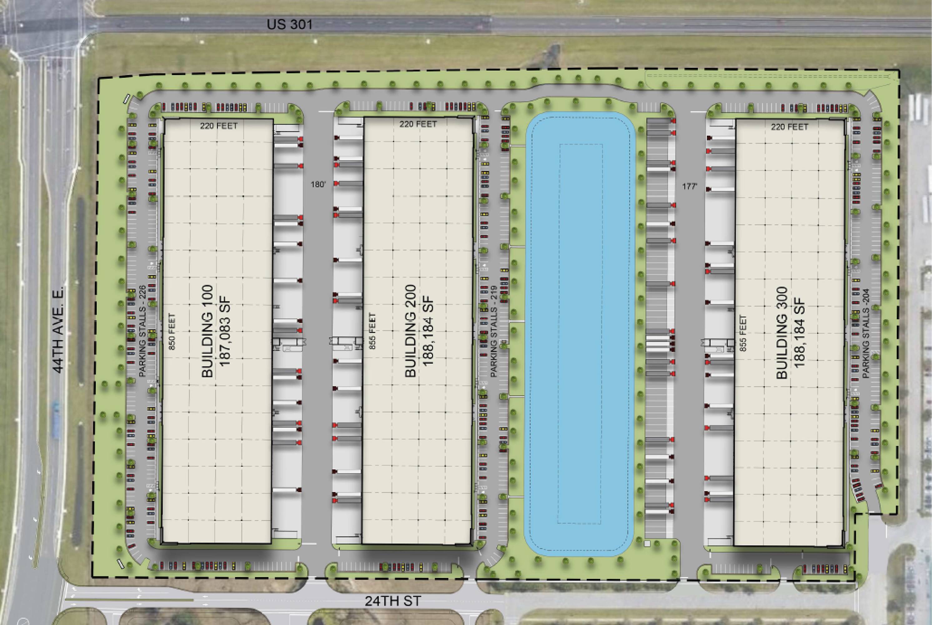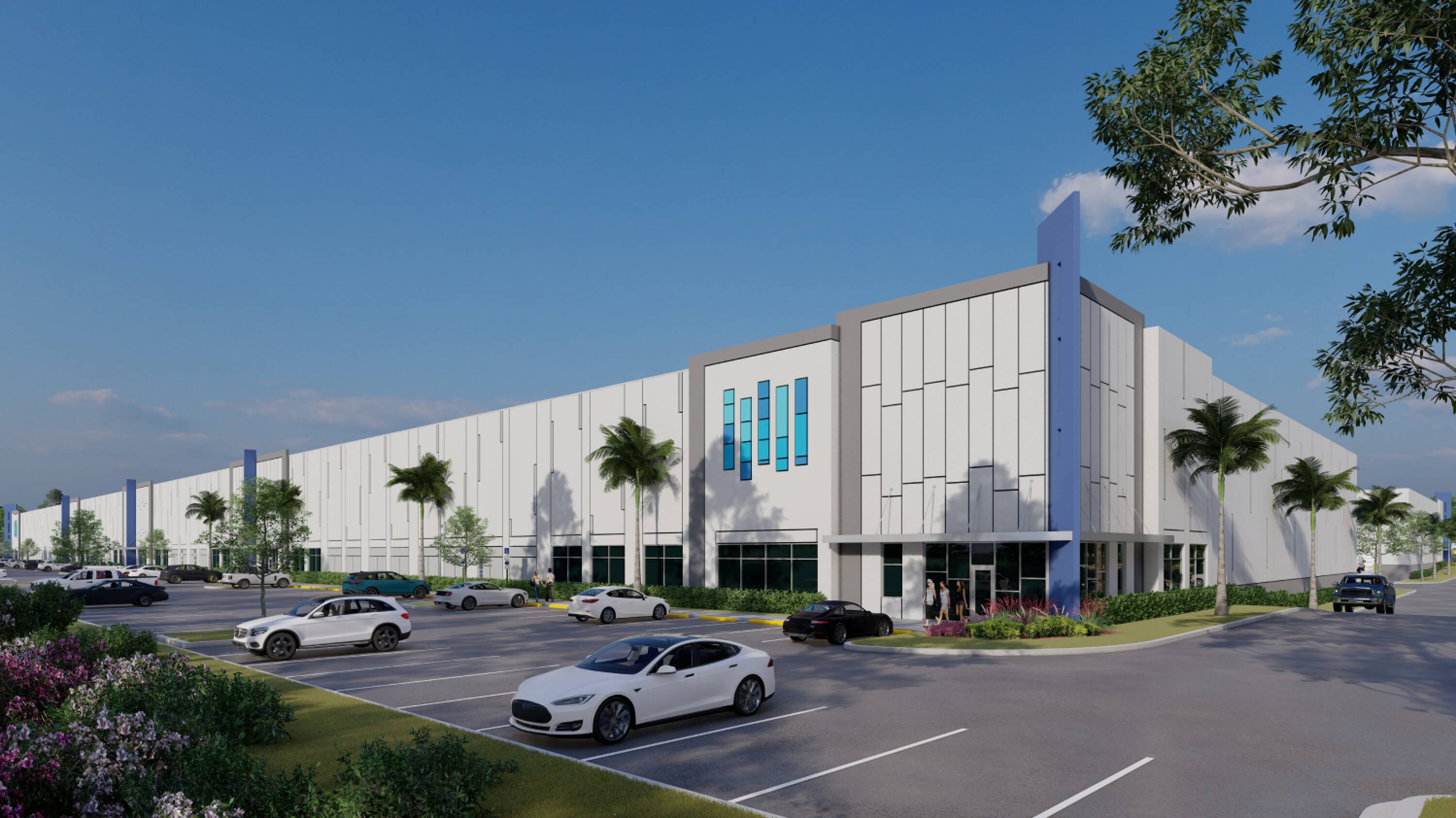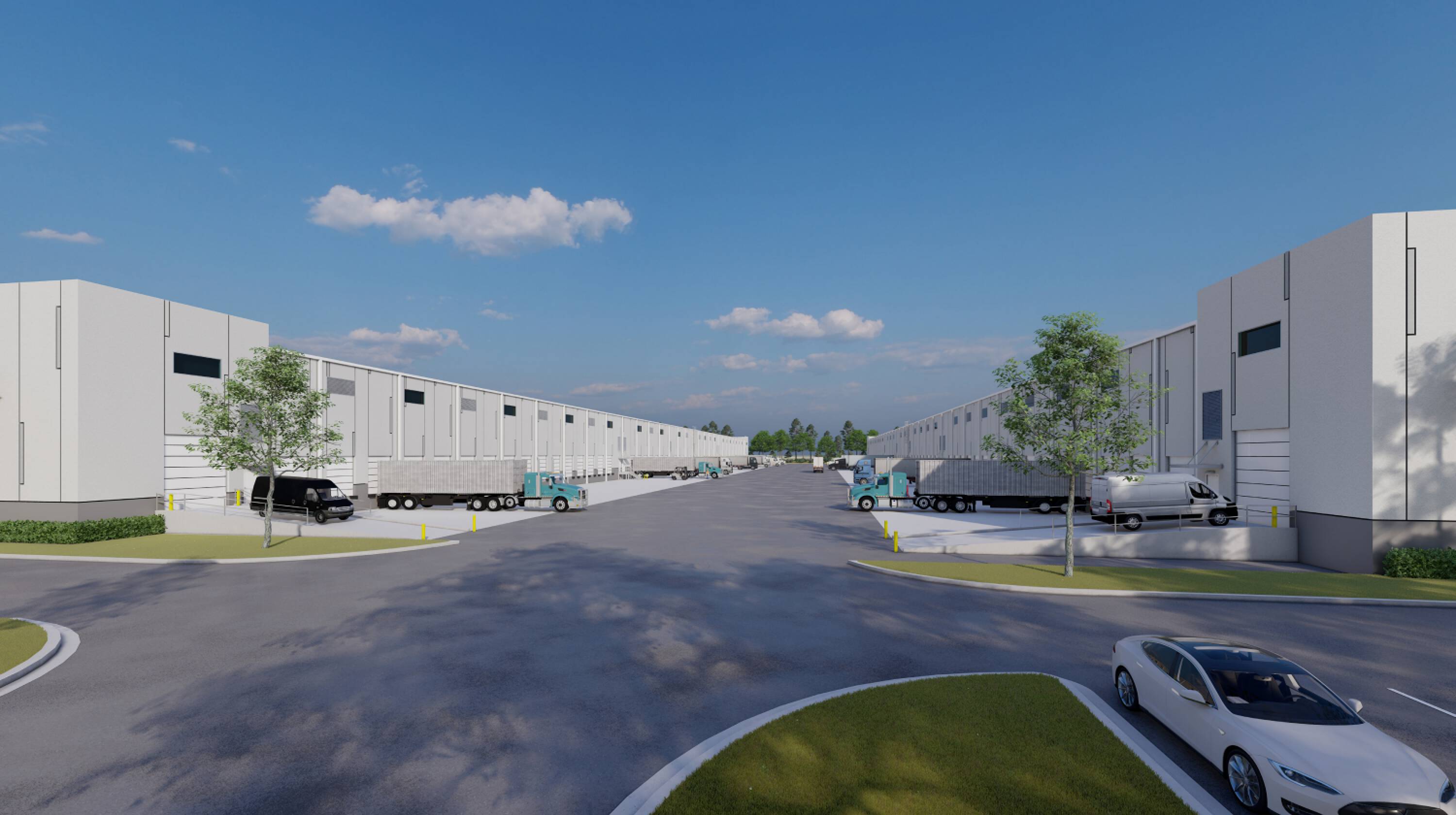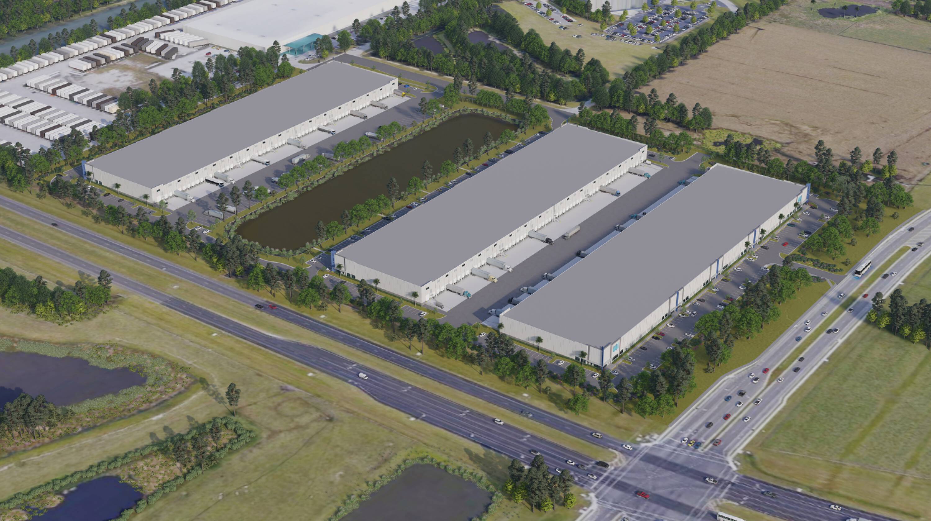 Class-A industrial park with ample parking and highway frontage.