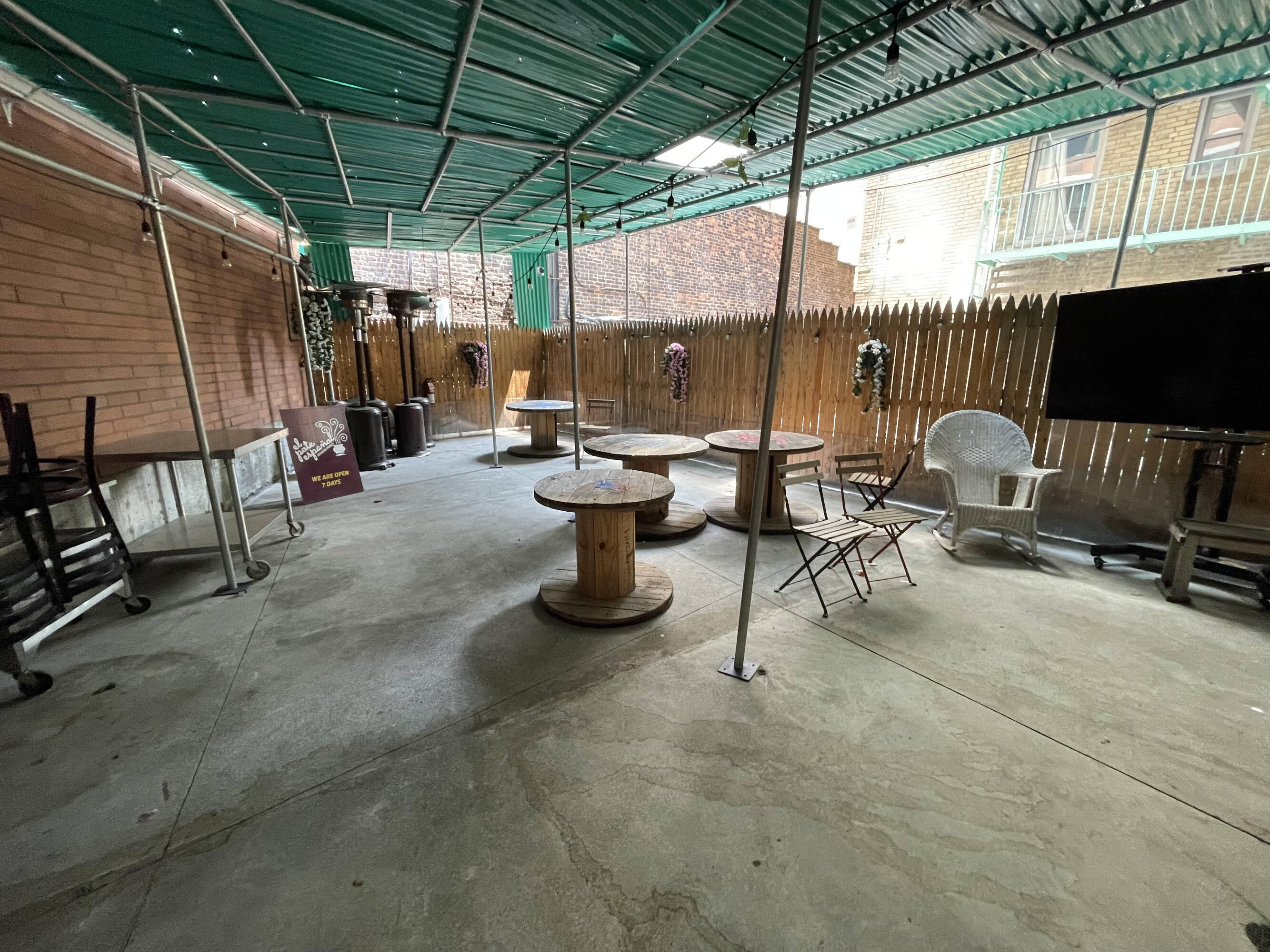 Retail space with basement and outdoor patio for rent.