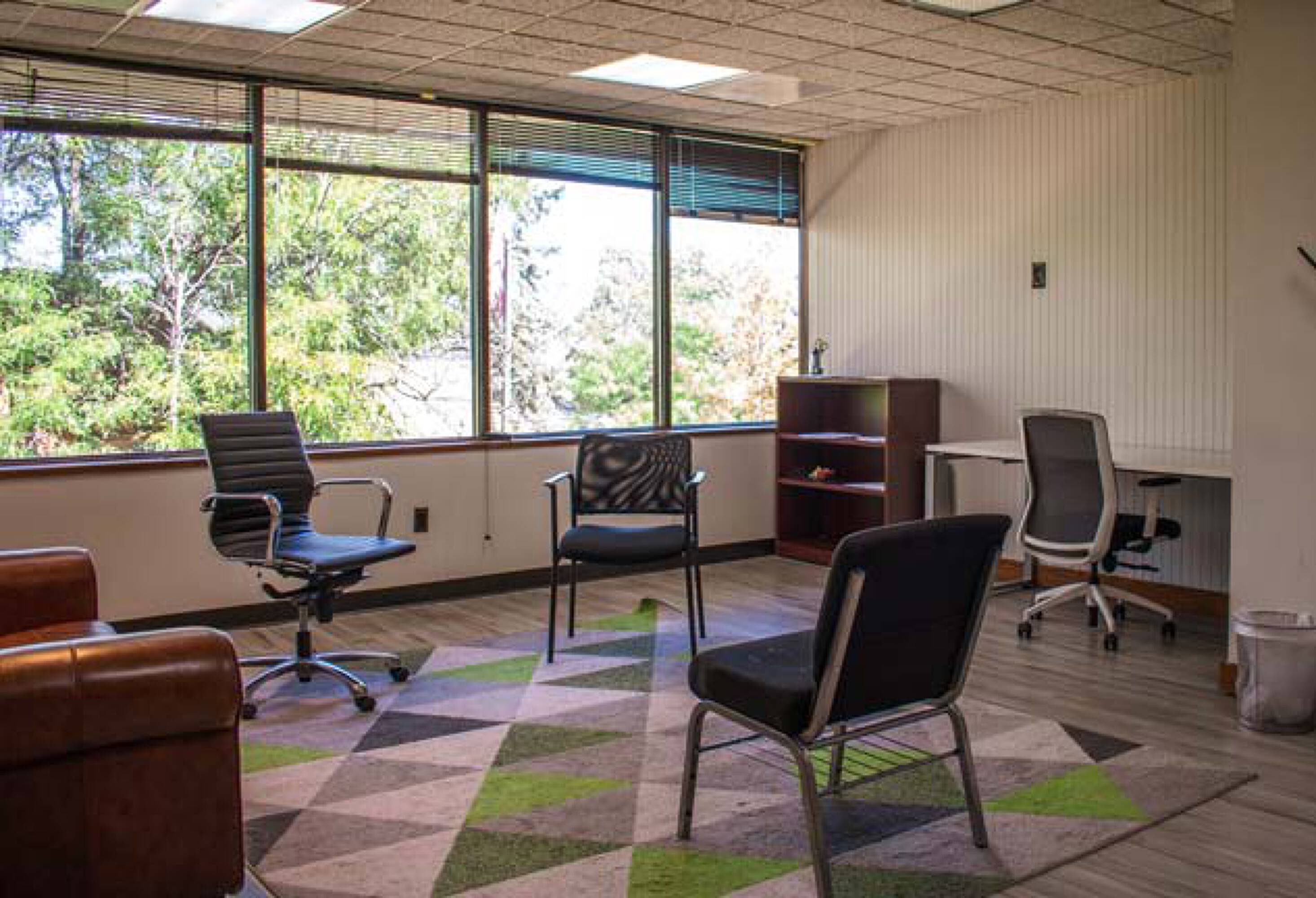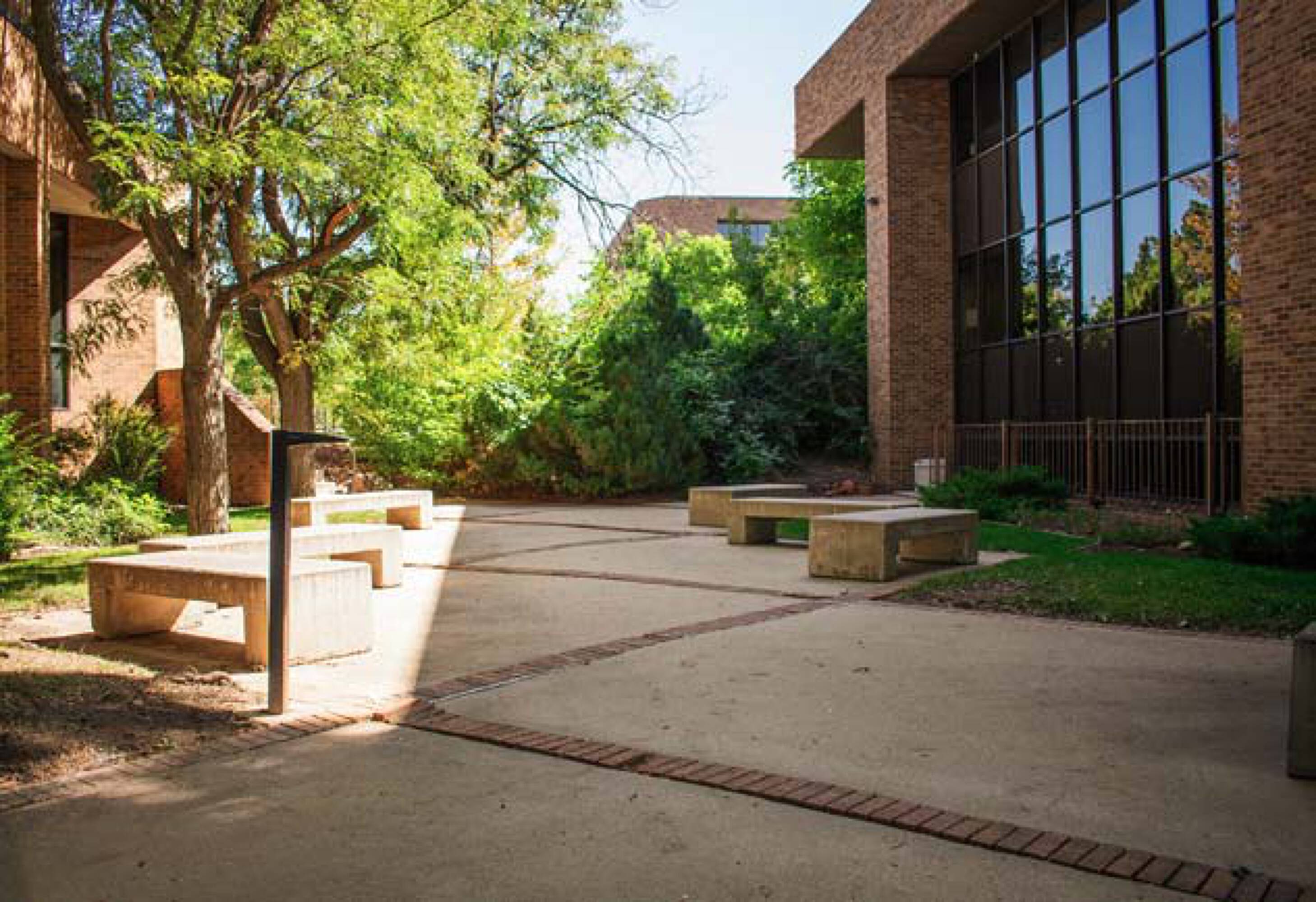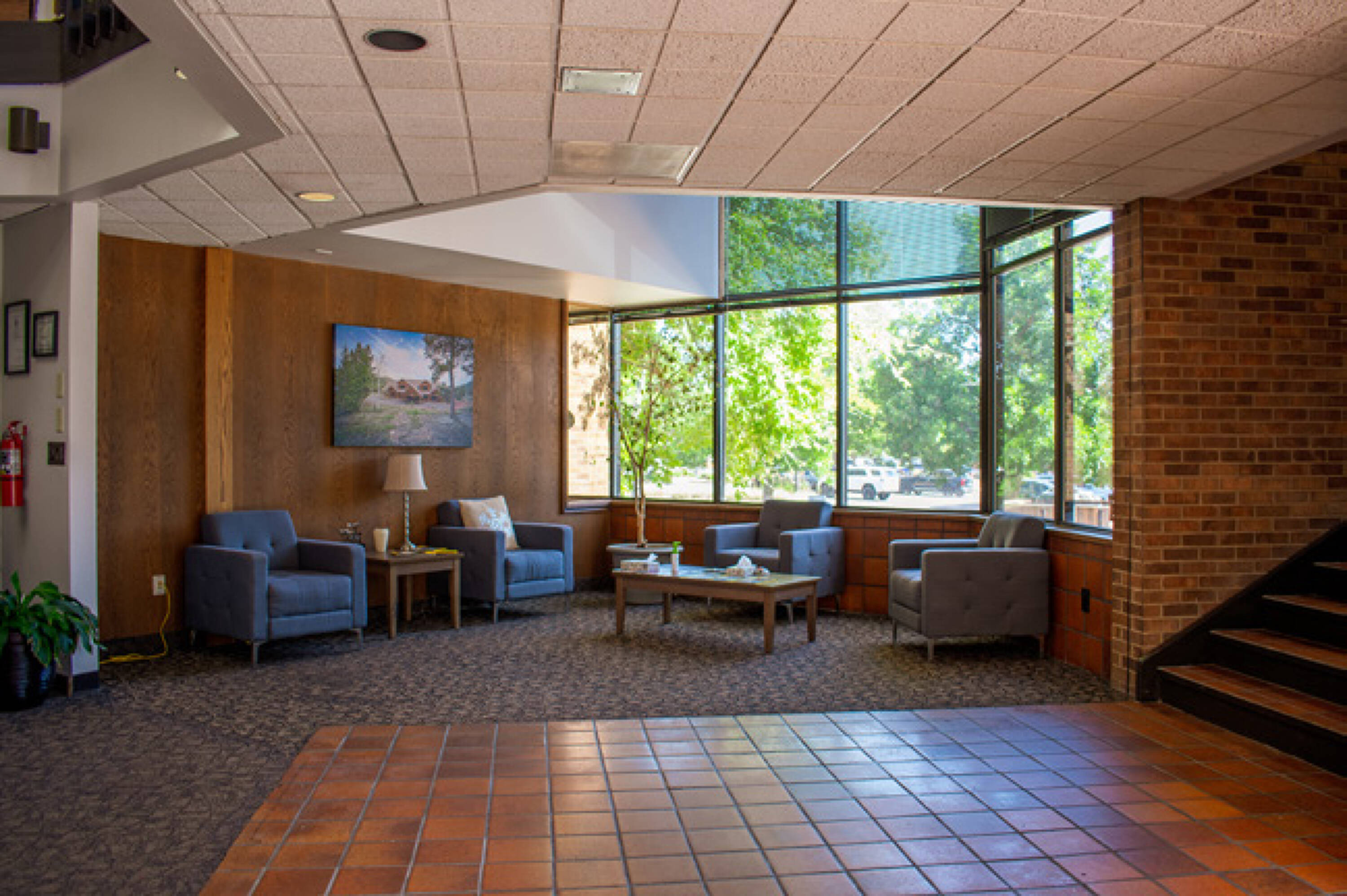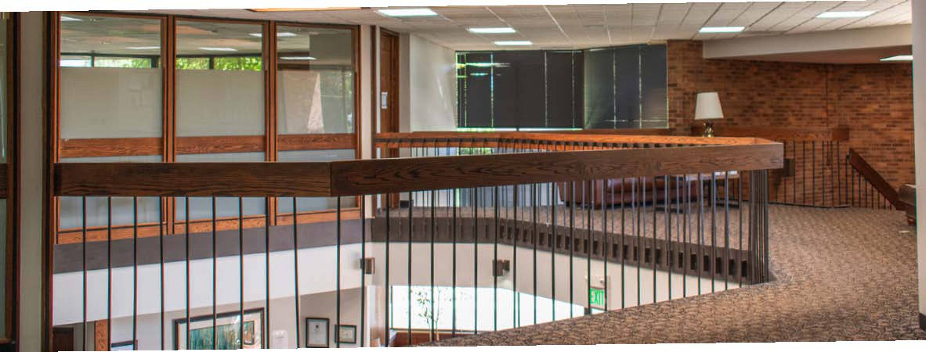 Office building with parking, signage, natural light, and outdoor space.