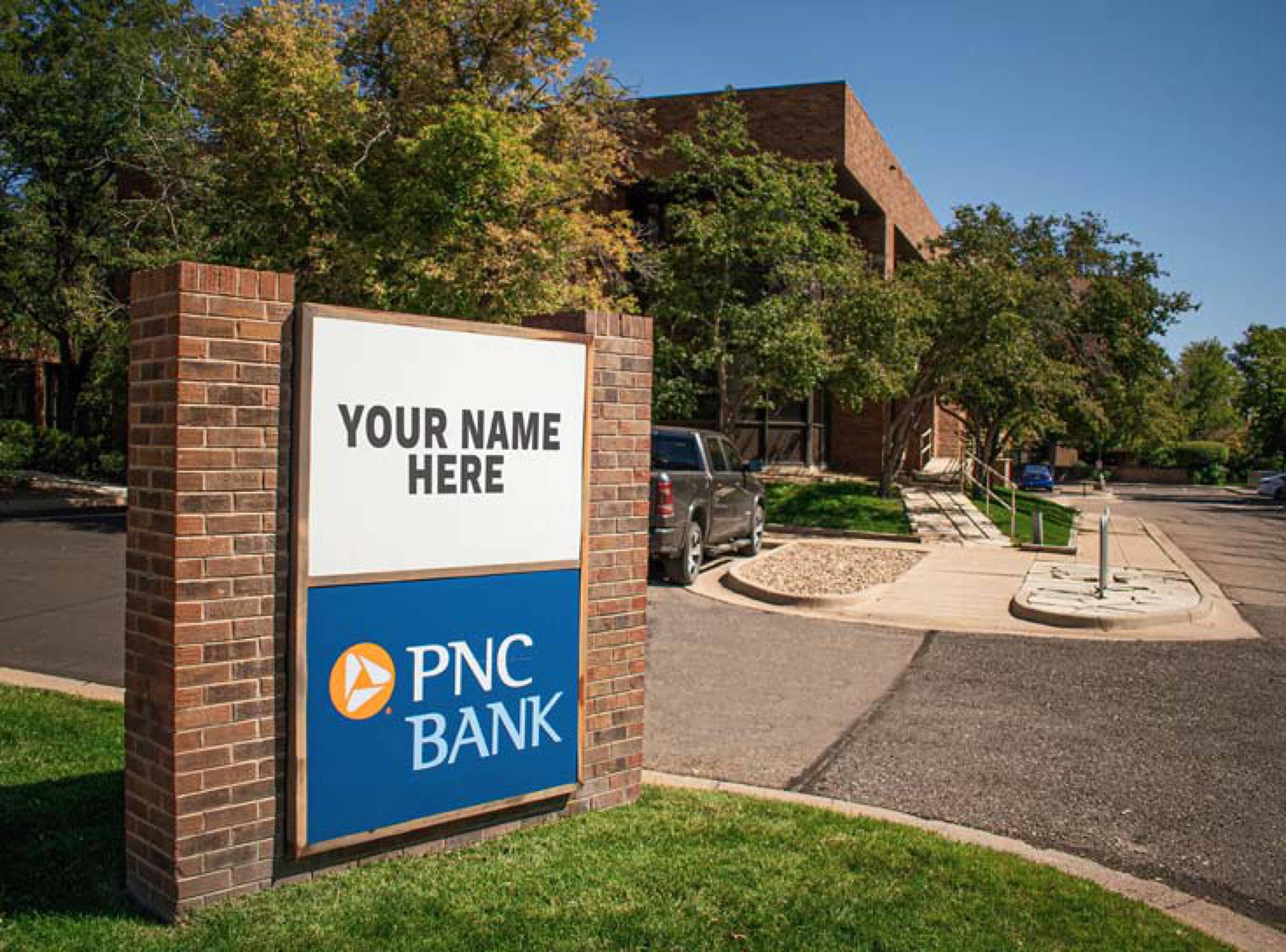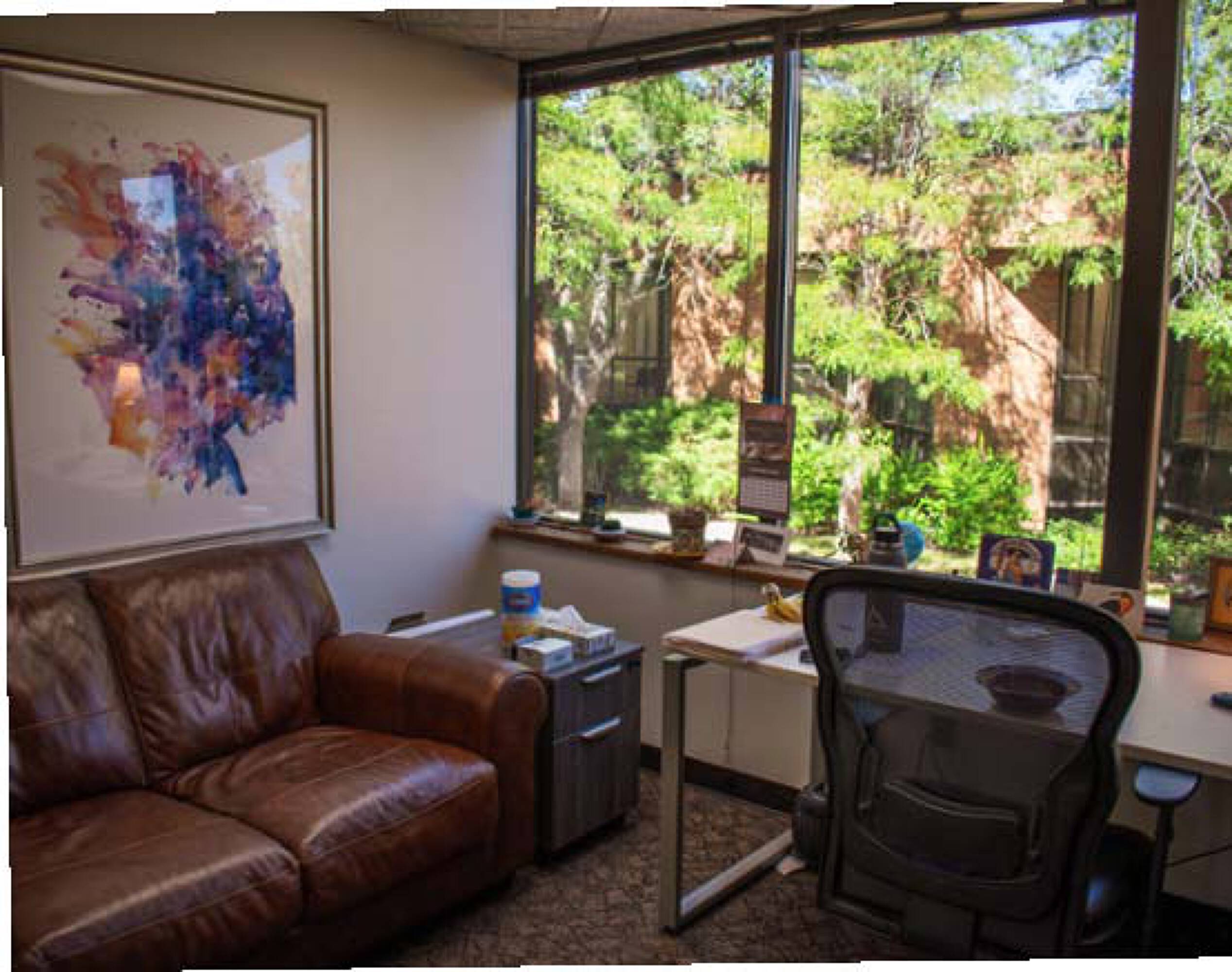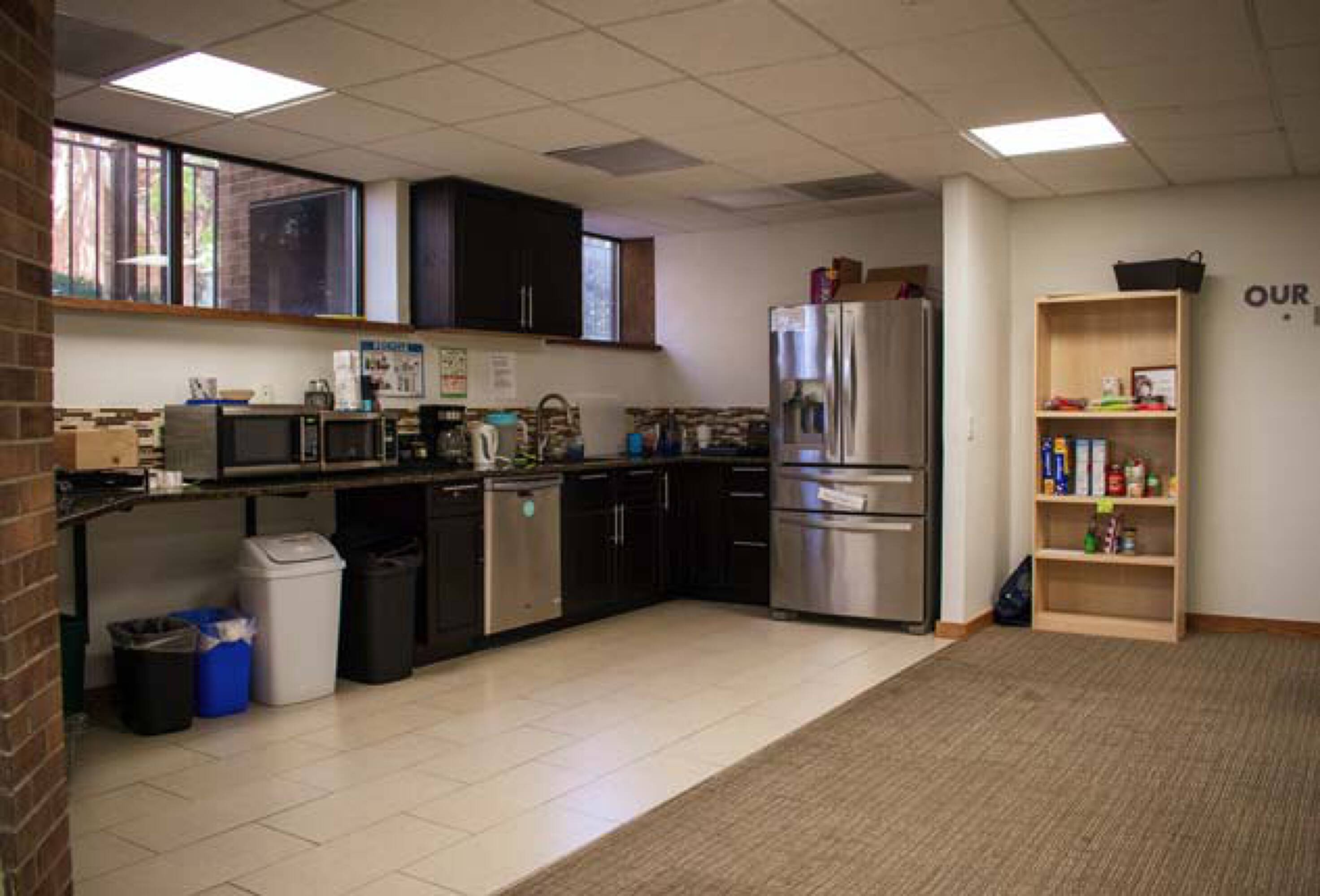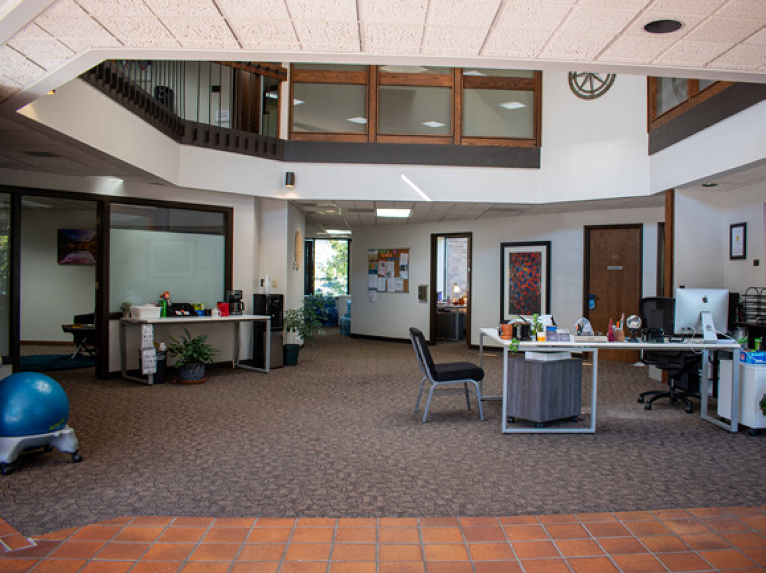 Office building with parking, signage, natural light, and outdoor space.