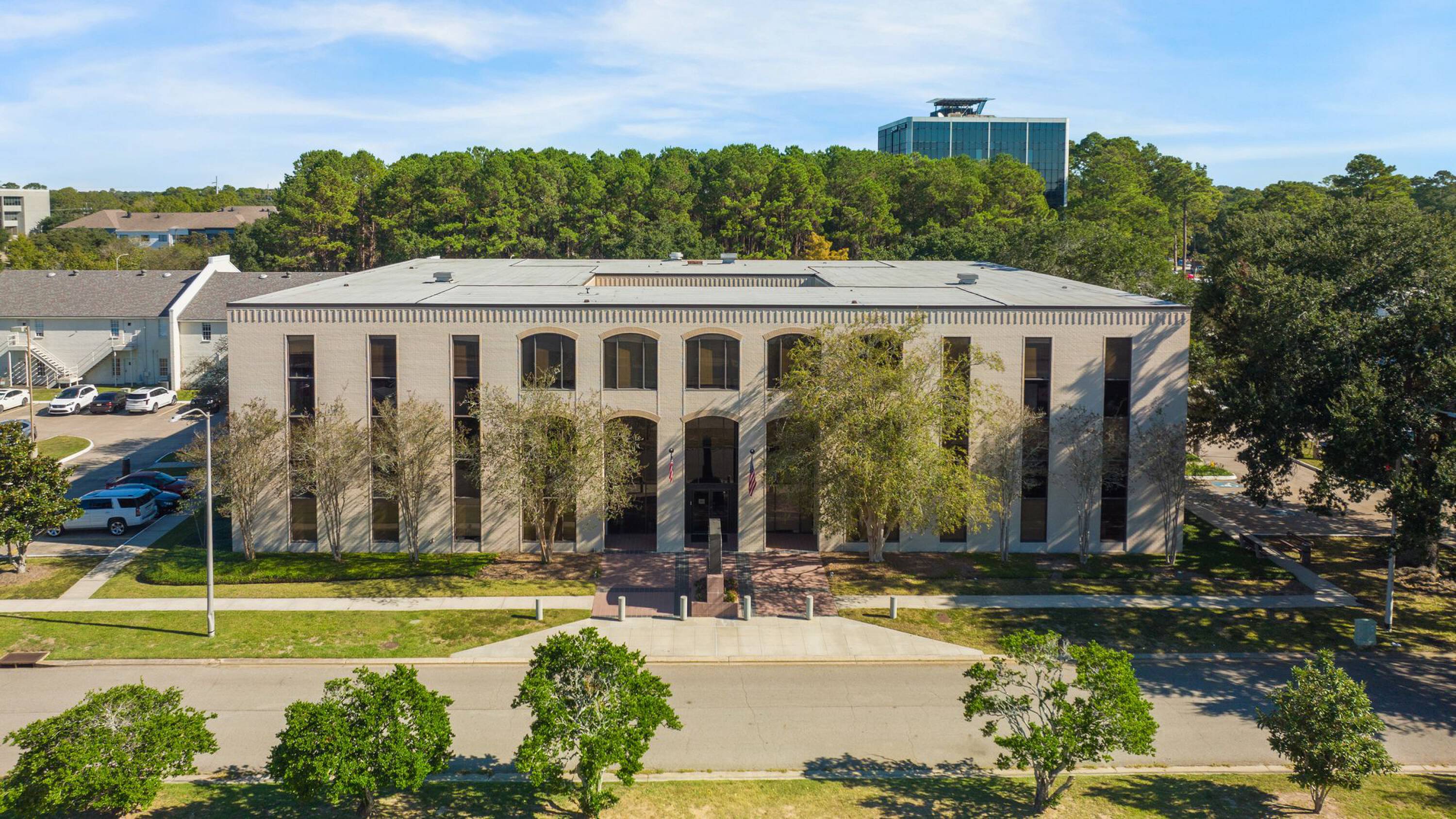 Office building with ample parking and interior courtyard.