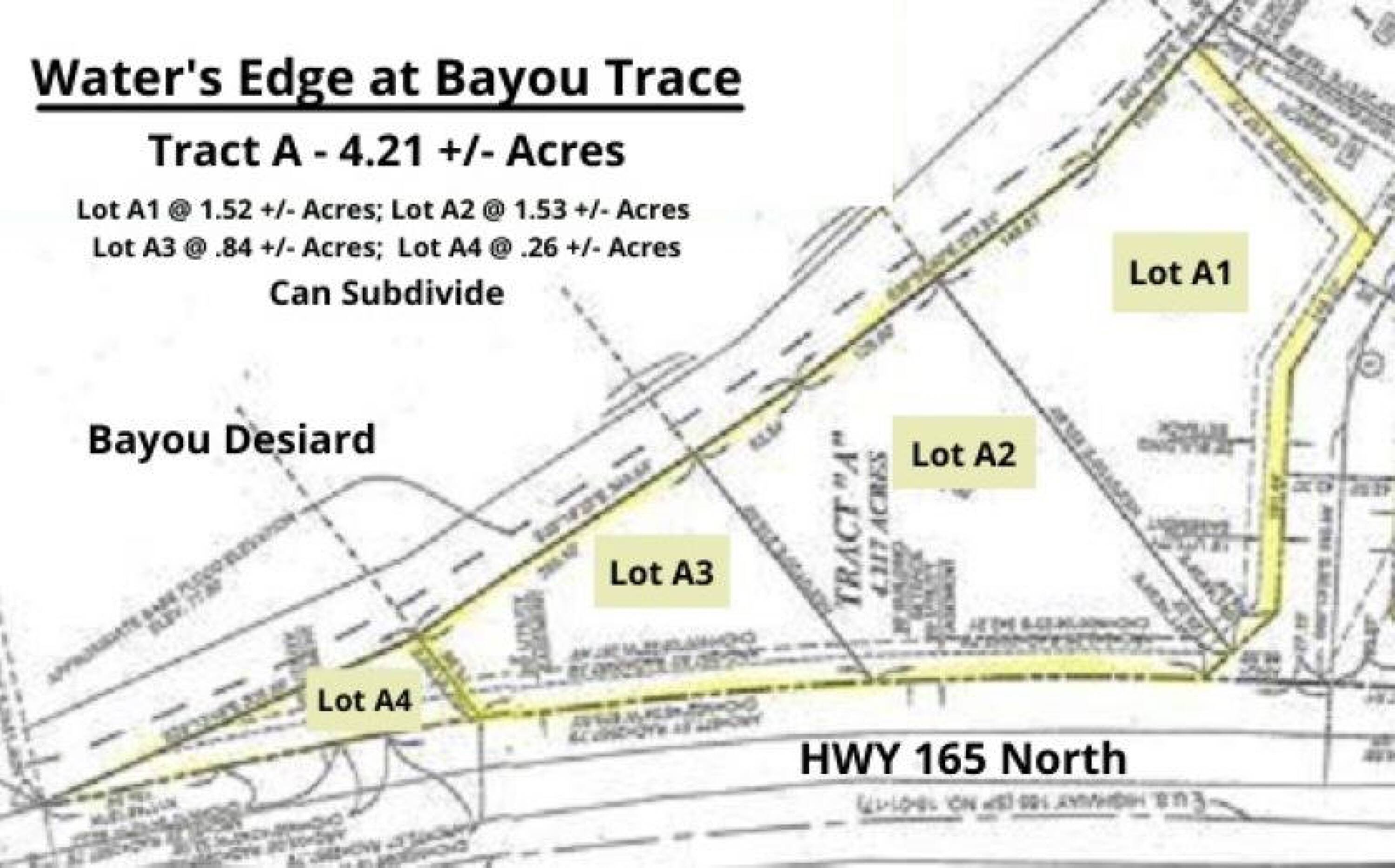 Located at water's edge at Bayou Trace, Tract A offers subdivided bayou-front commercial lots for sale. The total area of Tract A is approximately 4.161 acres. The available lots include: Lot A-1 at 1.524 acres, Lot A-2 at 1.537 acres, Lot A-3 at 0.84 acres, and Lot A-4 at 0.26 acres. Infrastructure is in place, including water, sewage, electricity, paved streets, drainage, and a survey. The owner reserves the right to approve the buyer and business.