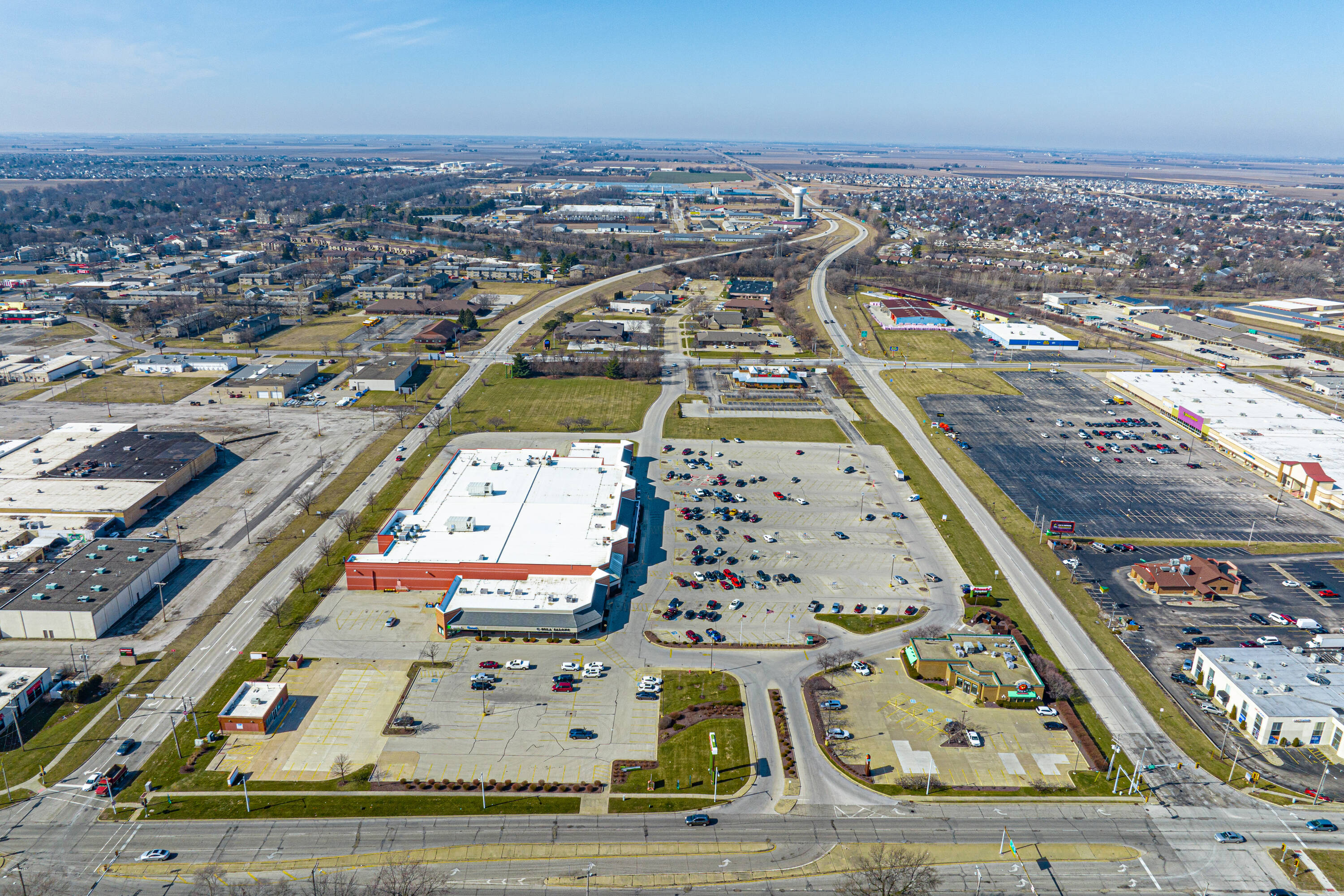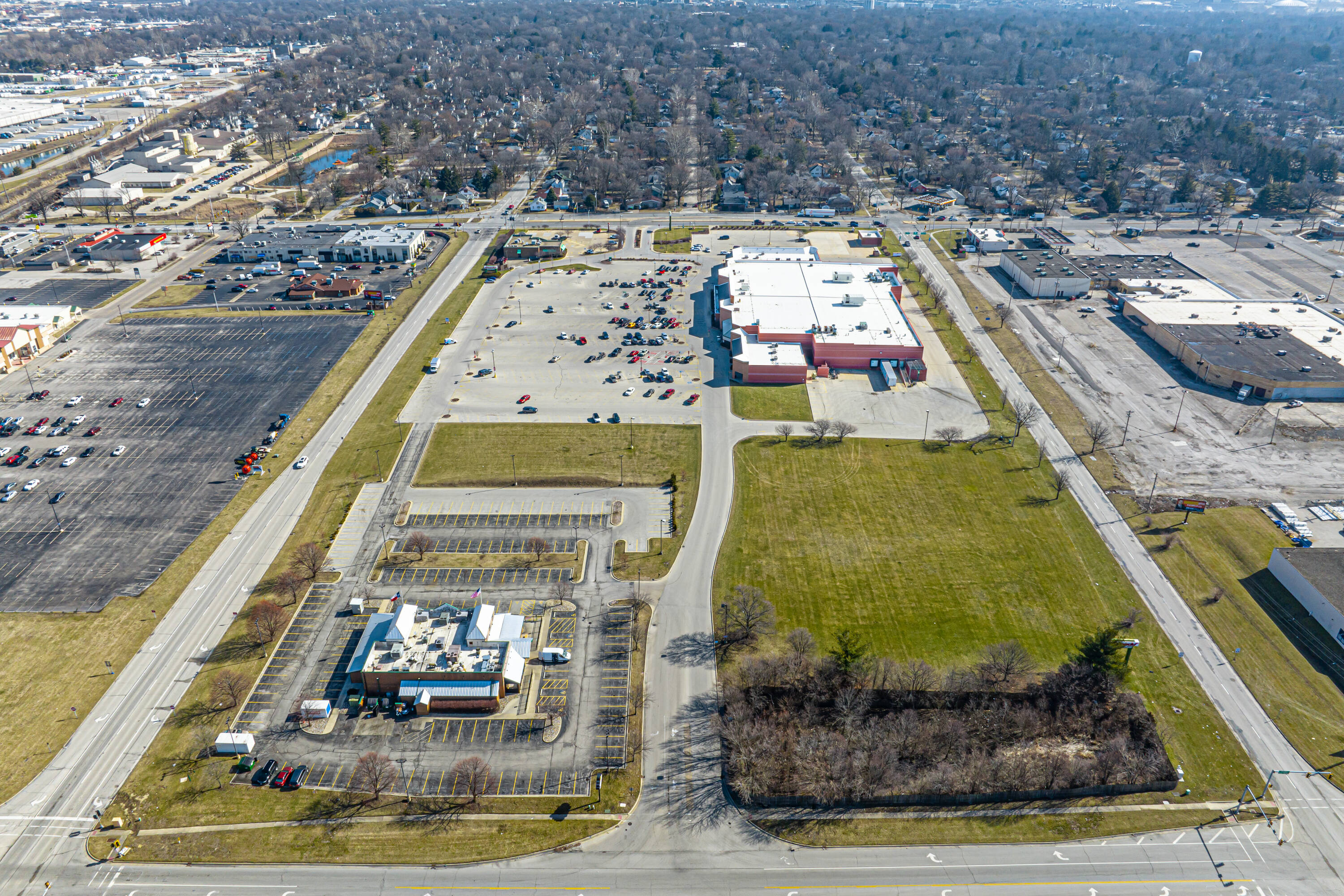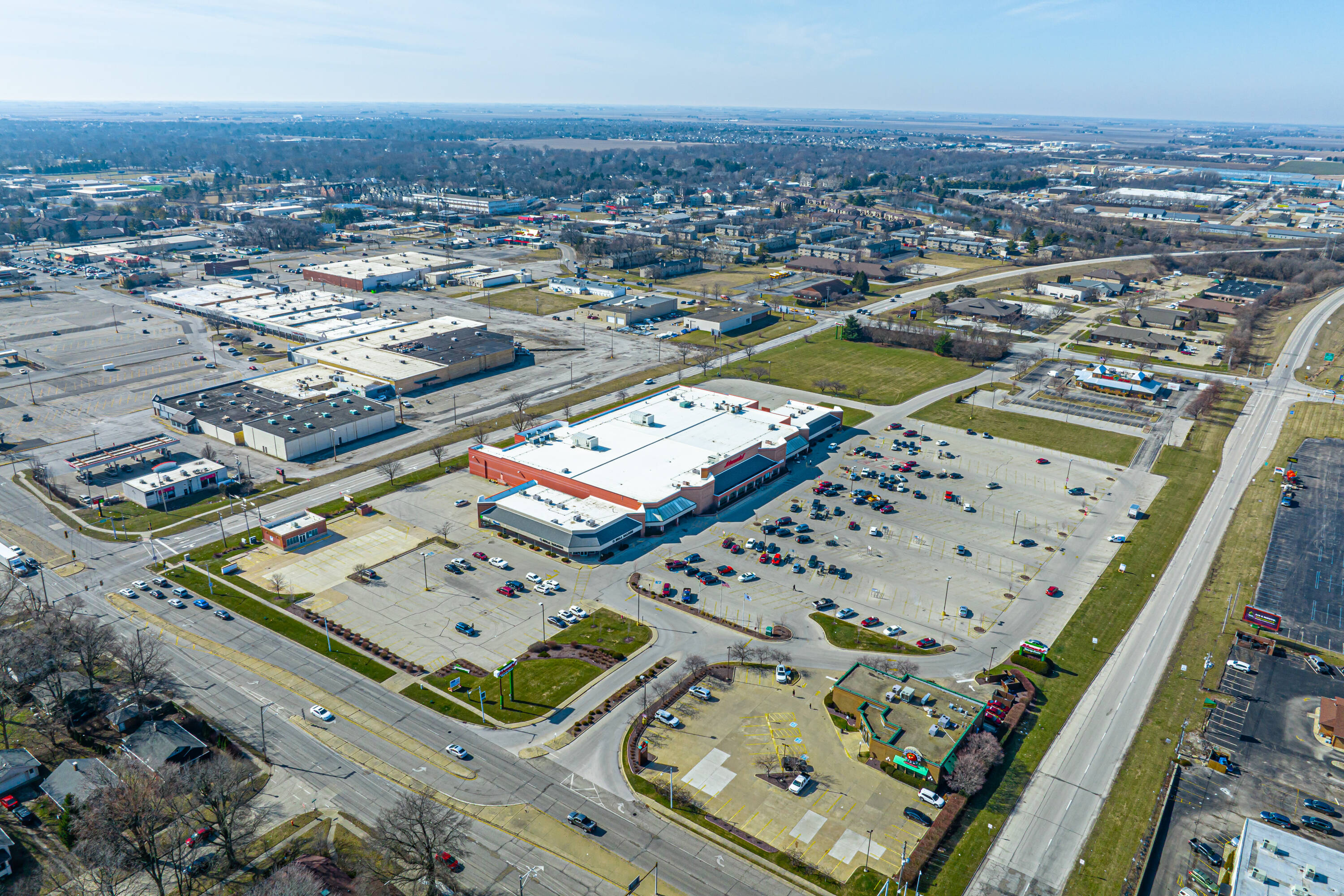 Shopping center space anchored by Schnucks, near university.