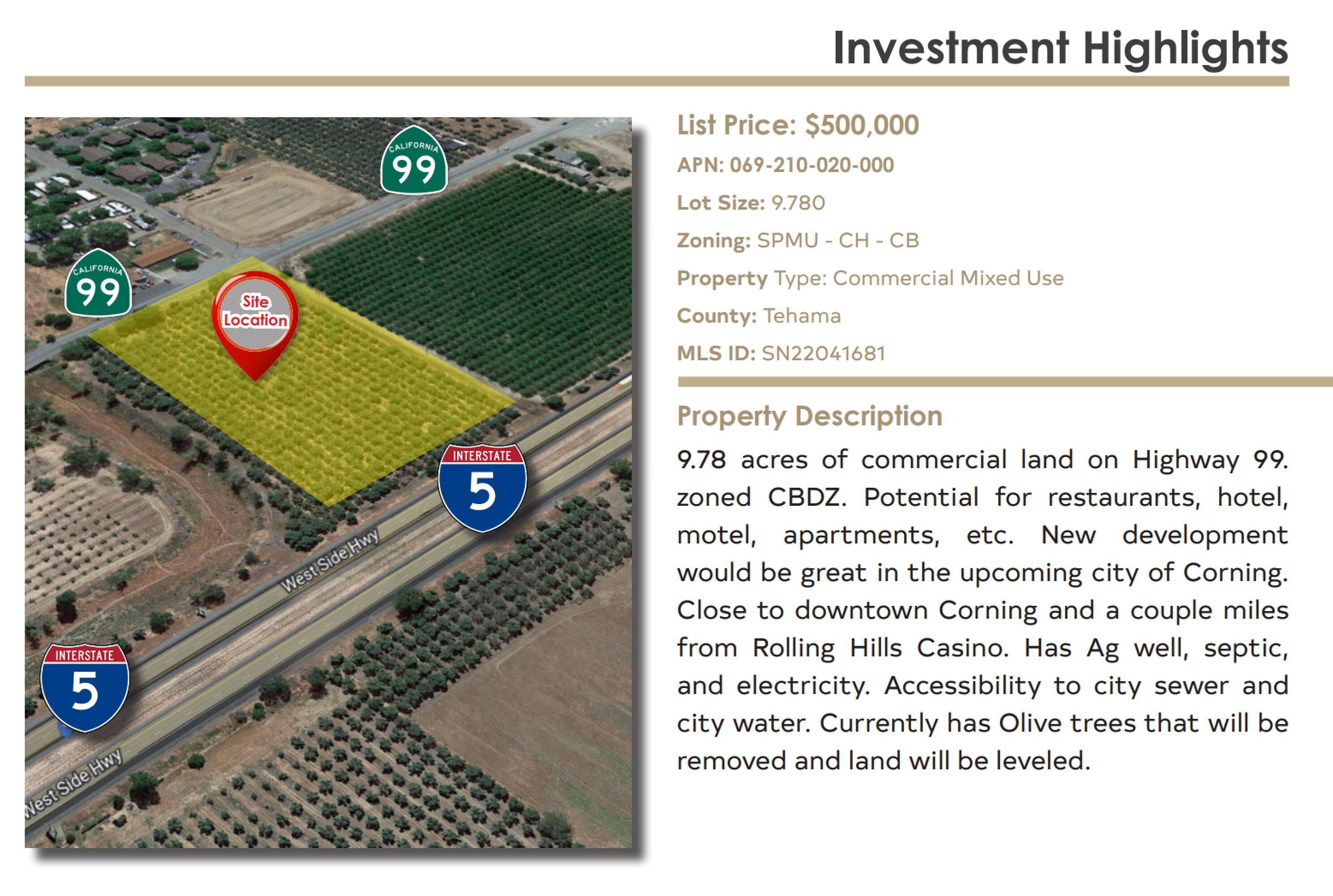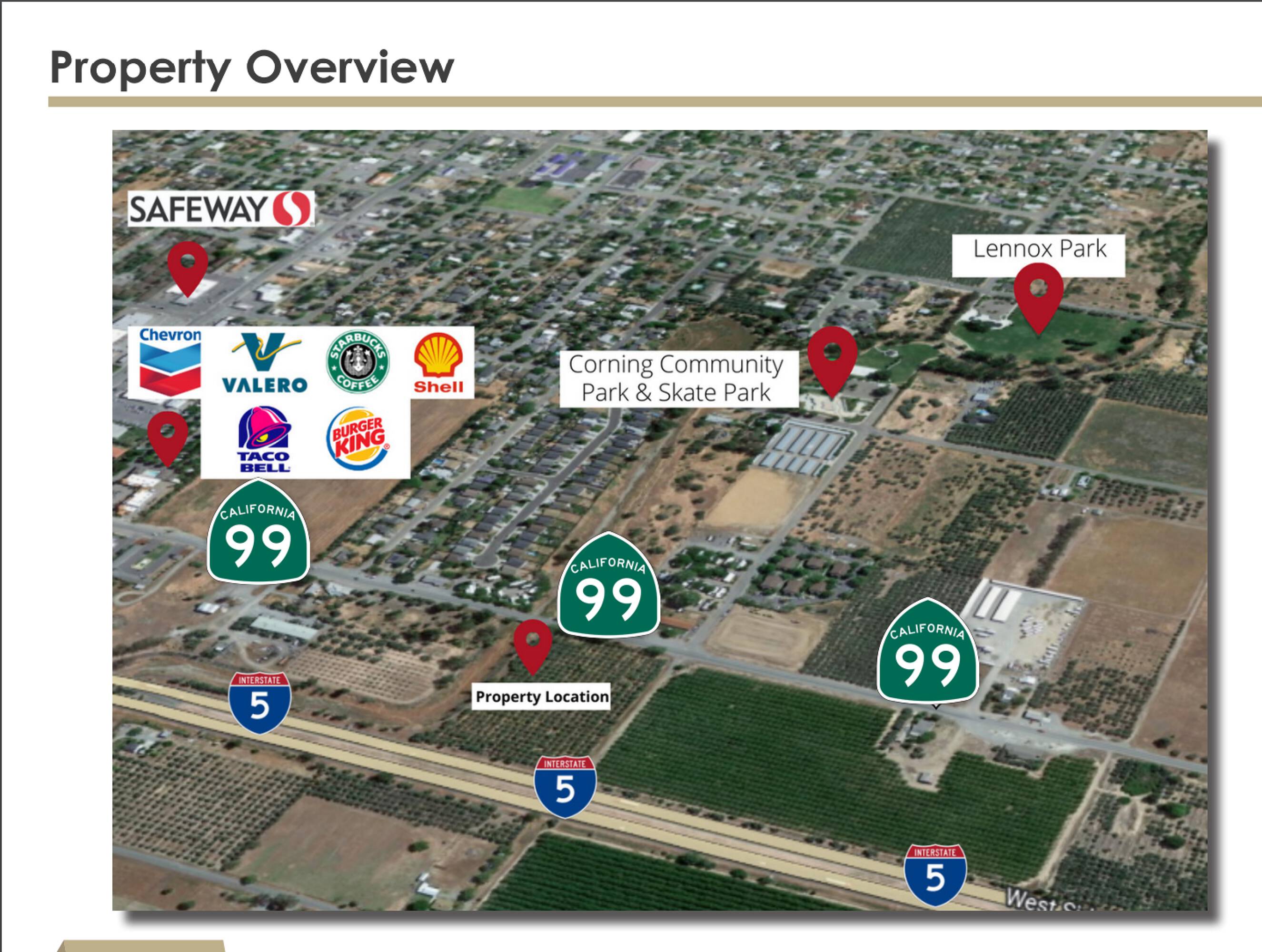 The property is located at Highway 99 Corning, CA.