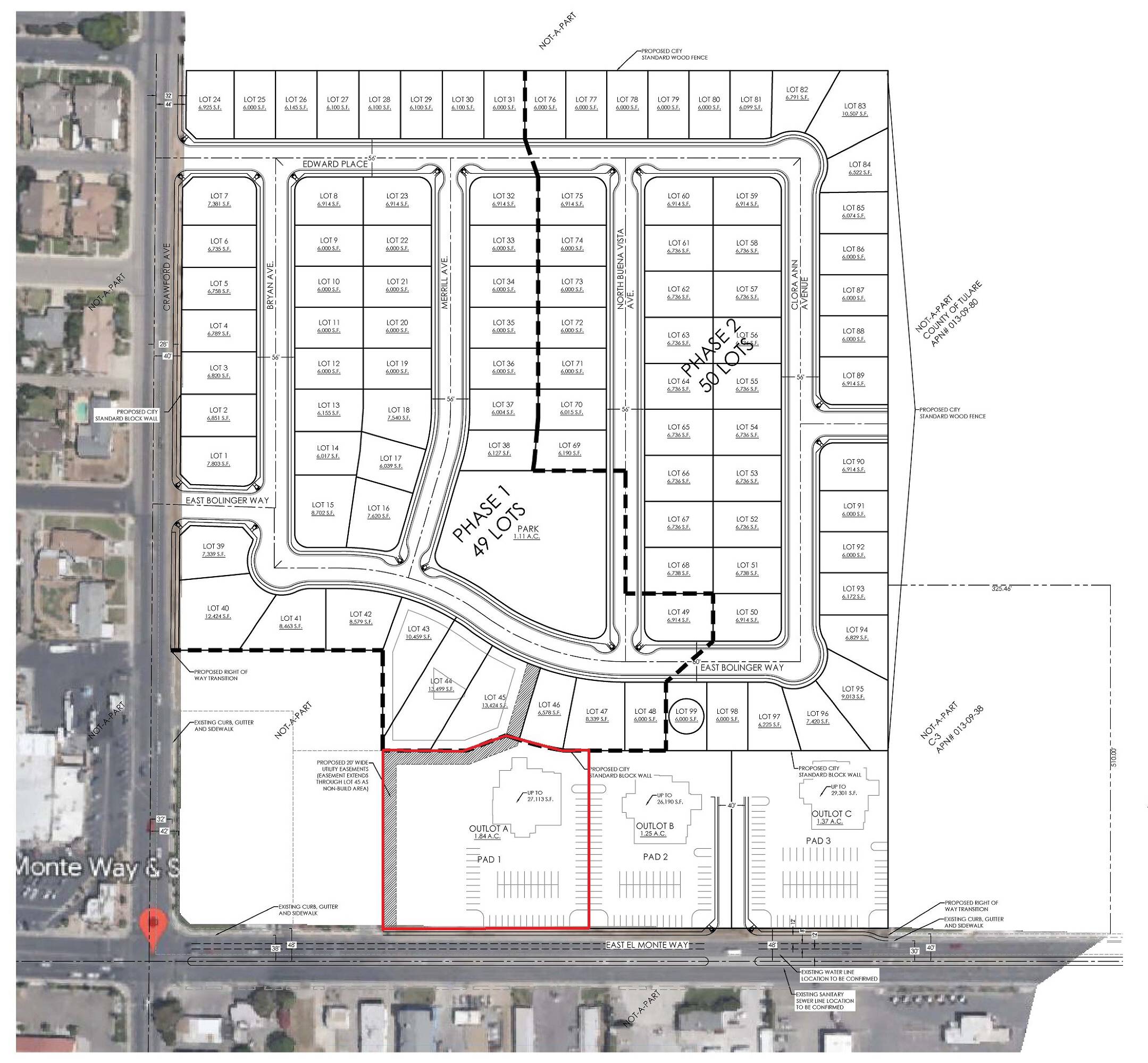 A 1.84-acre commercial parcel is available for sale on E. El Monte Way in Dinuba, California. The zoning is C-3, which allows for a variety of commercial uses. The parcel is located next to an existing McDonald's and Auto Zone. The surrounding area includes a planned residential development consisting of 99 single-family homes.