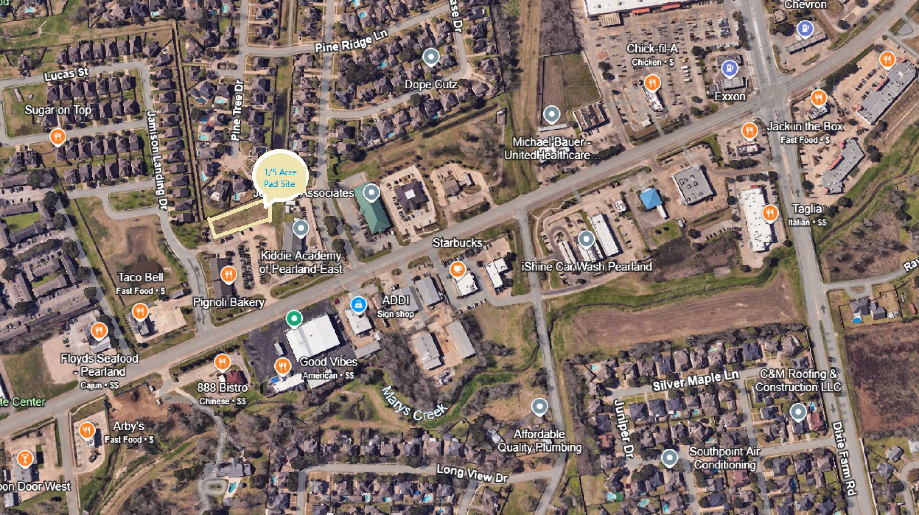 This 0.5-acre pad site is located in the Pine Hollow Plaza on the east side of Pearland, near Friendswood, on Broadway (FM 518). Zoned for General Commercial use, the site is platted and includes off-site detention. It is suitable for a retail strip, office building, or special purpose building. The property offers easy access to I-45, facilitating convenient transportation and connectivity.