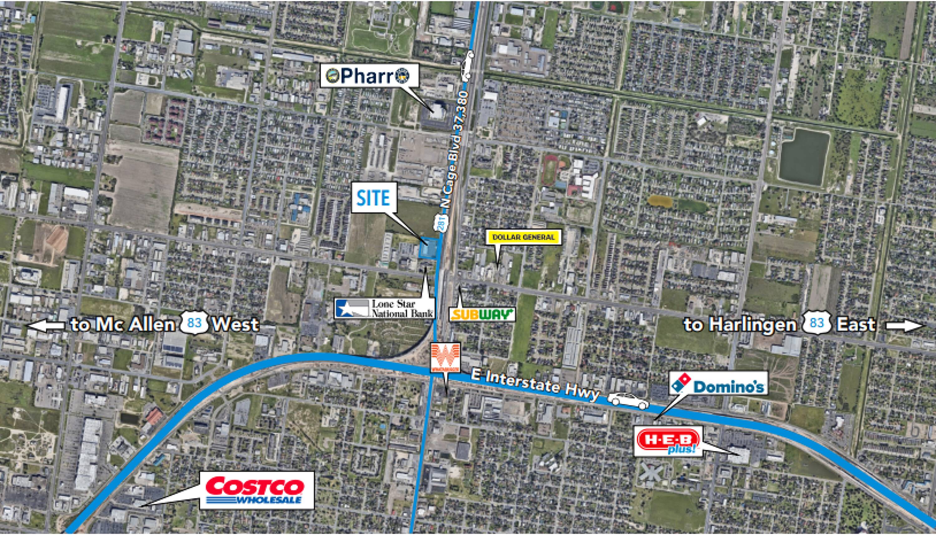 This property features: Prime location at the crossroads of McAllen, Pharr, and Edinburg.; High visibility on N Cage Blvd.; Robust traffic count of 37,800.