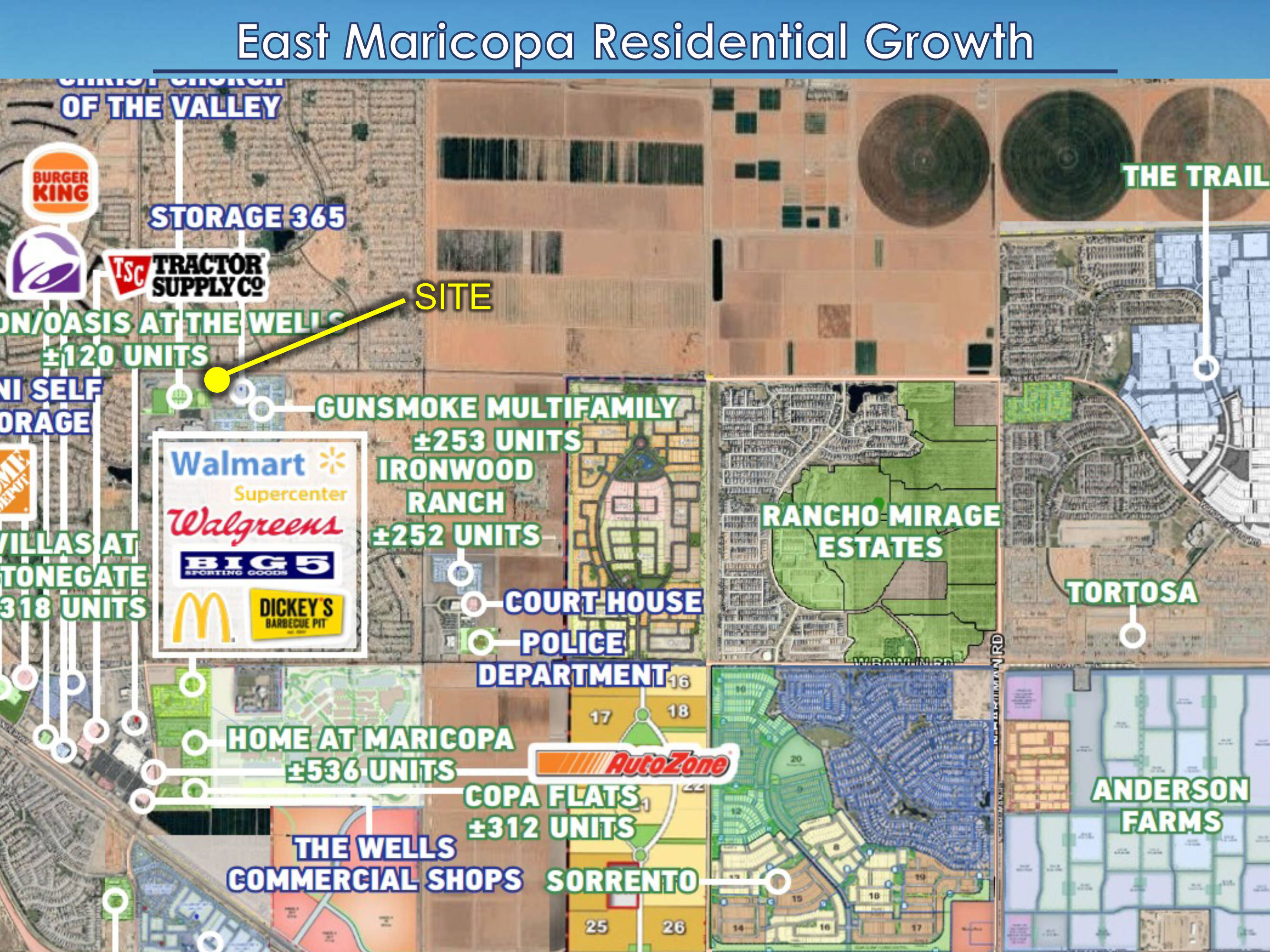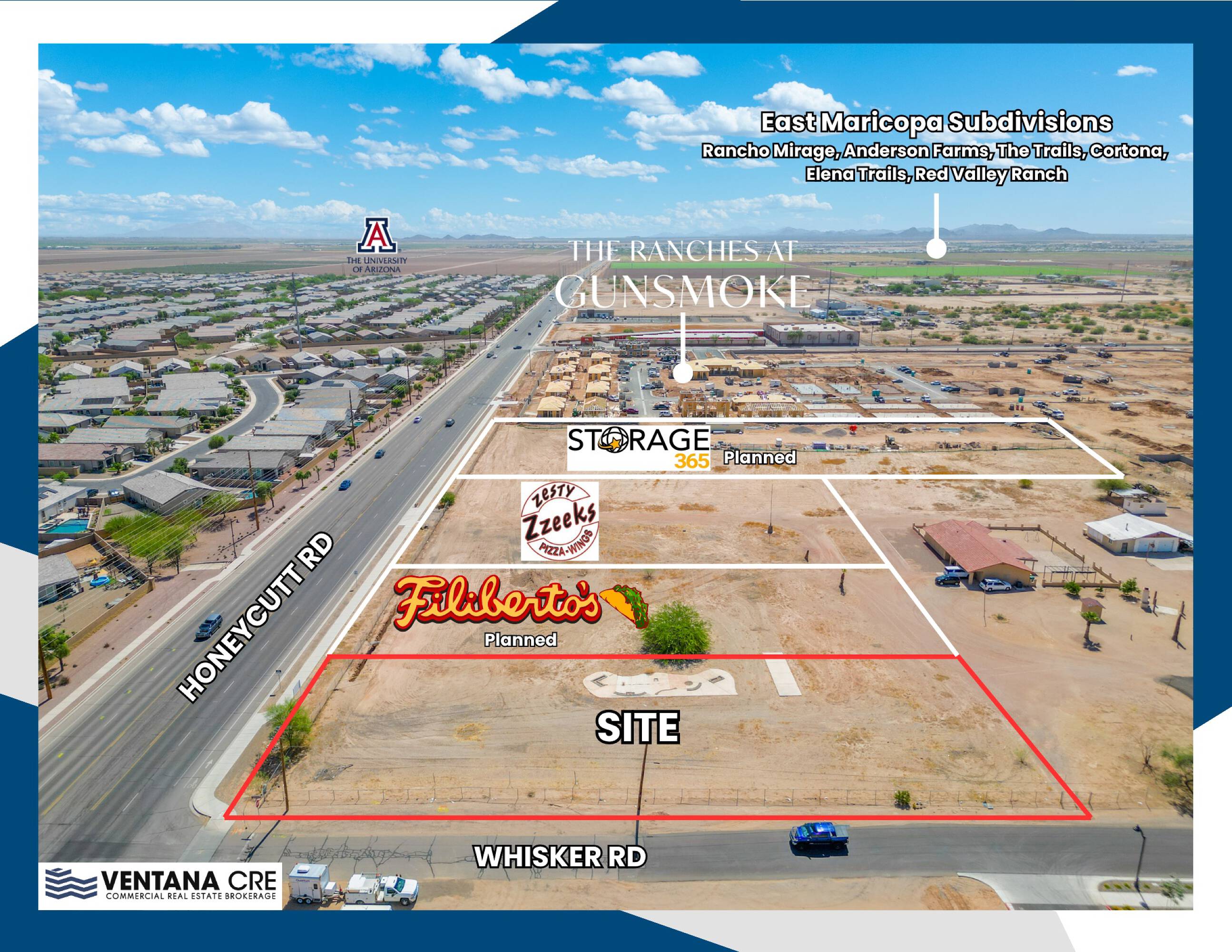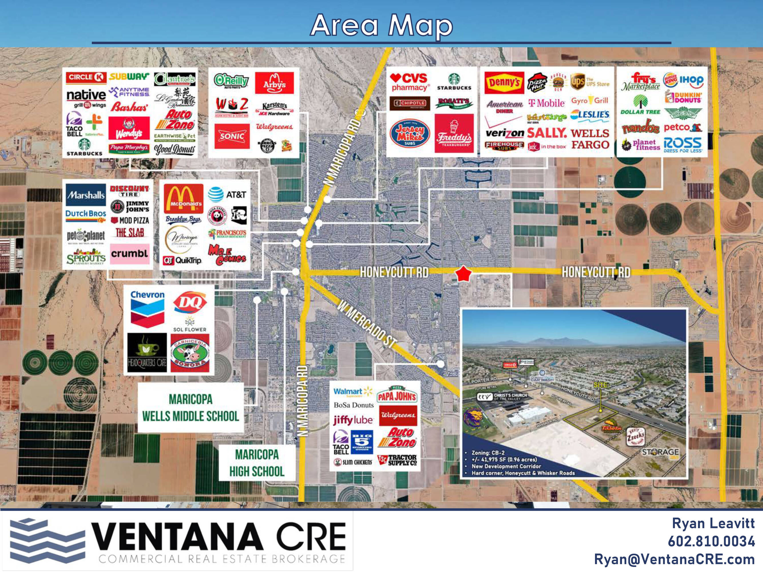 This 0.98-acre commercial land is located at the E/SEC of Honeycutt Rd and Porter Rd in Maricopa’s Seven Ranches District. The CB-2 zoning allows for a range of commercial and retail uses, including quick-service restaurants, retail, and automotive services. The property benefits from visibility along Honeycutt Rd. The location is within a rapidly expanding district. The surrounding population within a 3-mile radius is over 166,000 residents, with a median household income exceeding $86,000. The site is near planned residential developments and community anchors such as Ranches at Gunsmoke Apartments (253 units), CCV Church, and Sequoia Academy (900+ students).