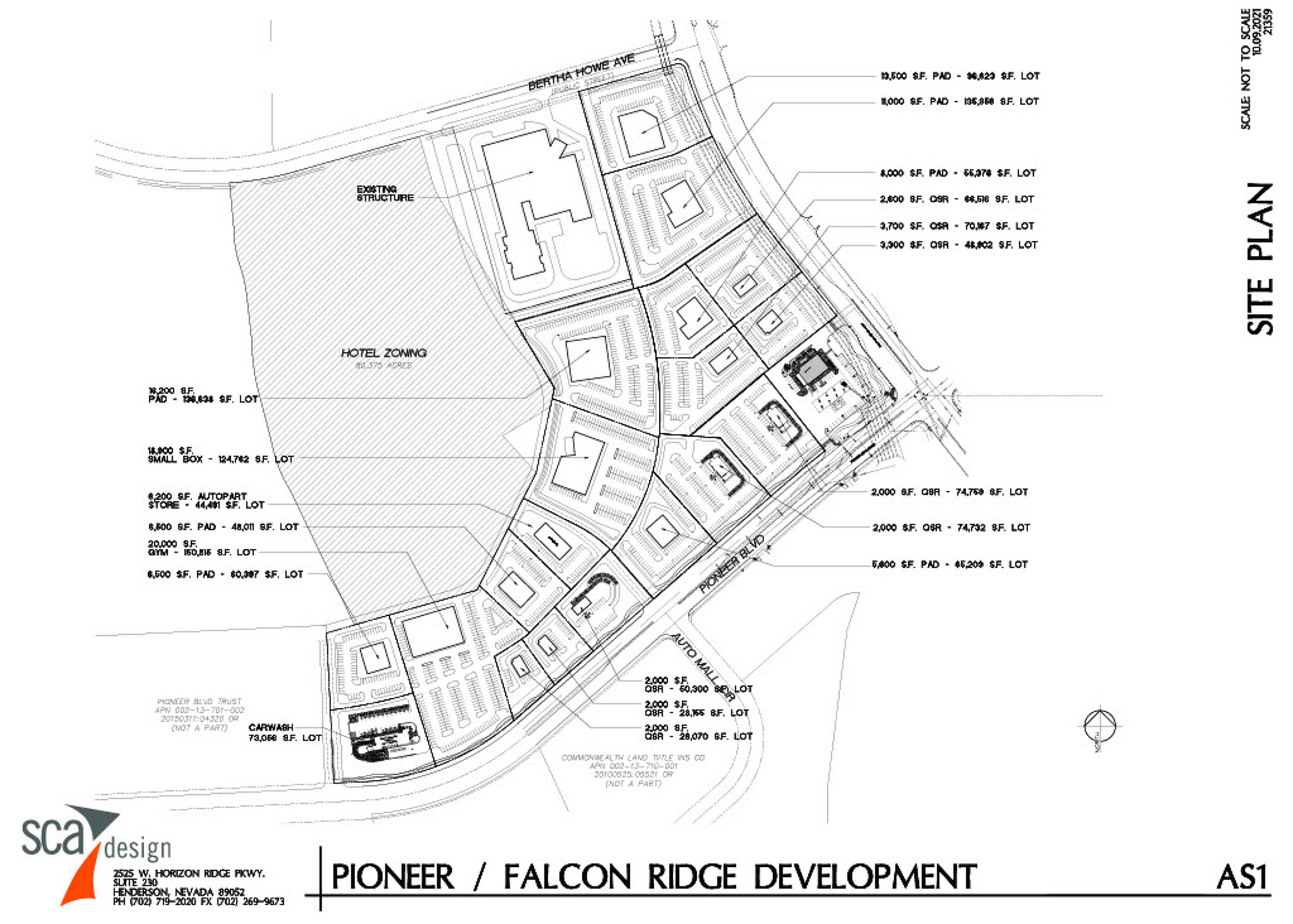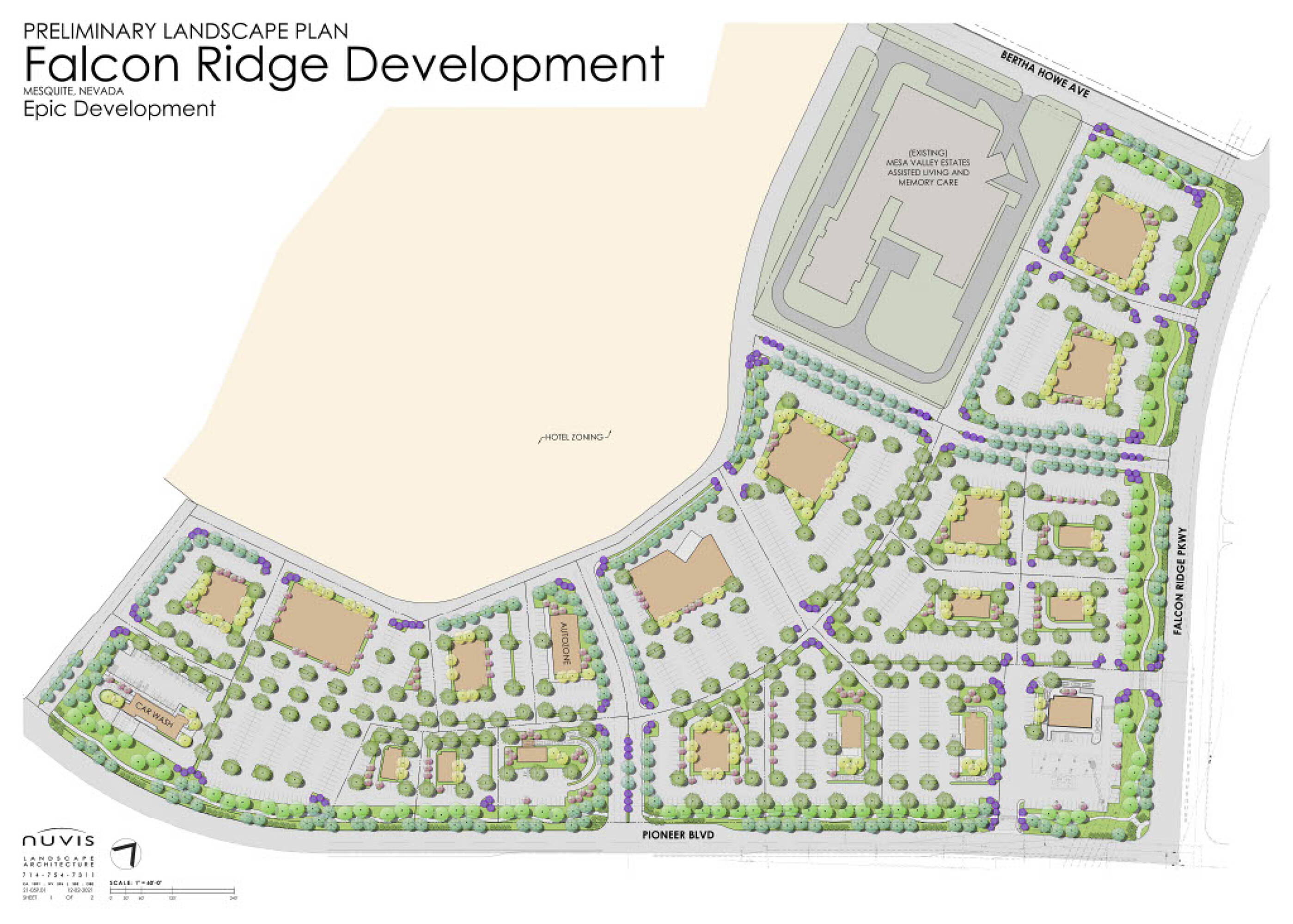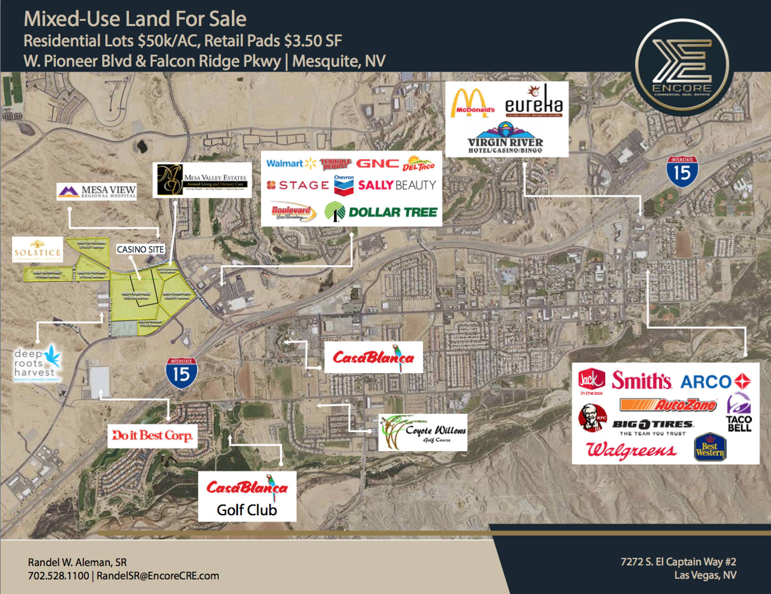 This property features: Strategic location off I‑15 on Falcon Ridge Pkwy and W Pioneer Blvd in Mesquite, Nevada.; Multiple zoning designations (HT, MF‑4, CR‑2) allowing for Commercial, Retail, Mixed Use, Hospitality, Resort Casino, and Single‑Family Development.; Includes a lease‑option for a 25‑acre hotel‑casino site paying $180,000 per year with an option to purchase for $10M.
