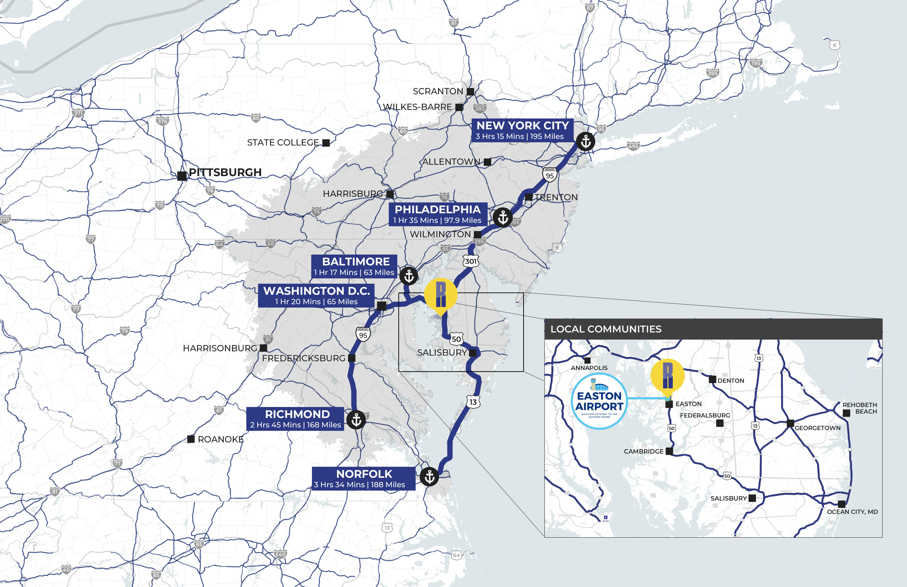 Located in Easton, Maryland, off Route 50 on Airport Road, the property at 28958 I Way Ct offers 53,752 square feet of warehouse/industrial space. The space includes all public utilities, high-speed internet, and 440V electric. The building features a 1,267 square foot 'bump out' on opposite sides, designed to accommodate office needs. Each 'bump out' includes two restrooms and a concrete mezzanine above for storage, accessible by staircase.