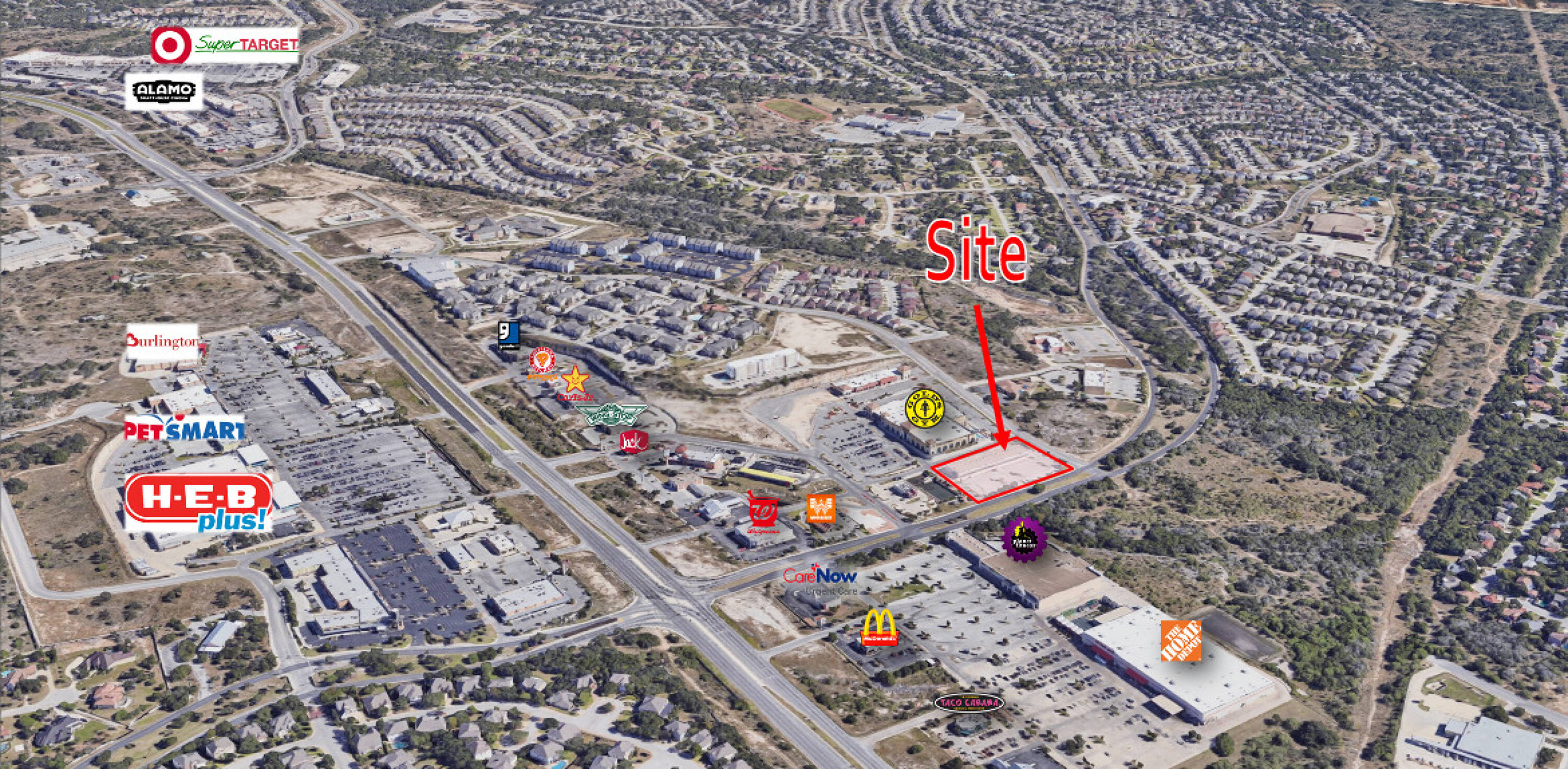This property features: Located in the Northeast quadrant of Highway‑281 & Evans Road; Across from HEB; Address: 2339 Evans Road