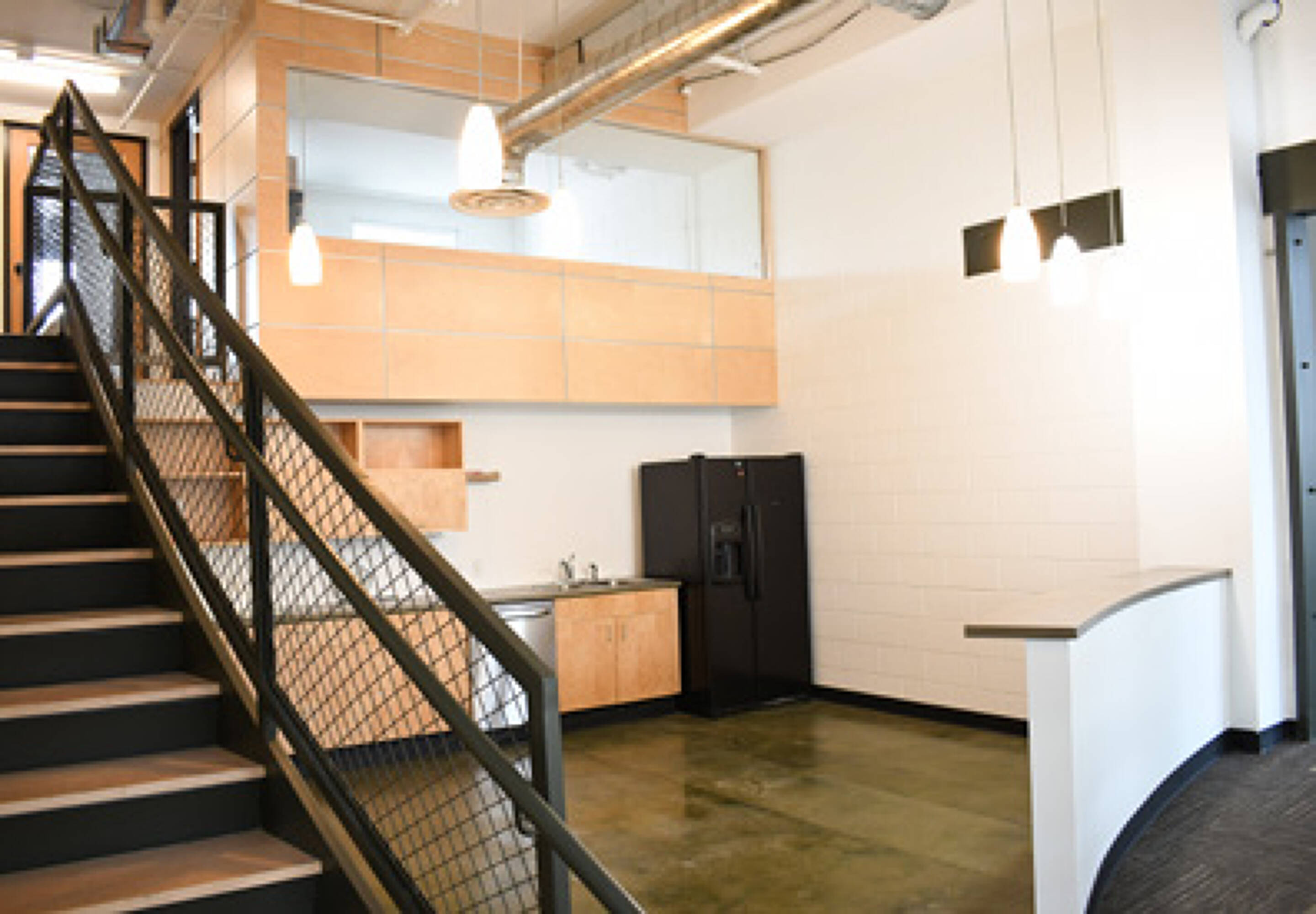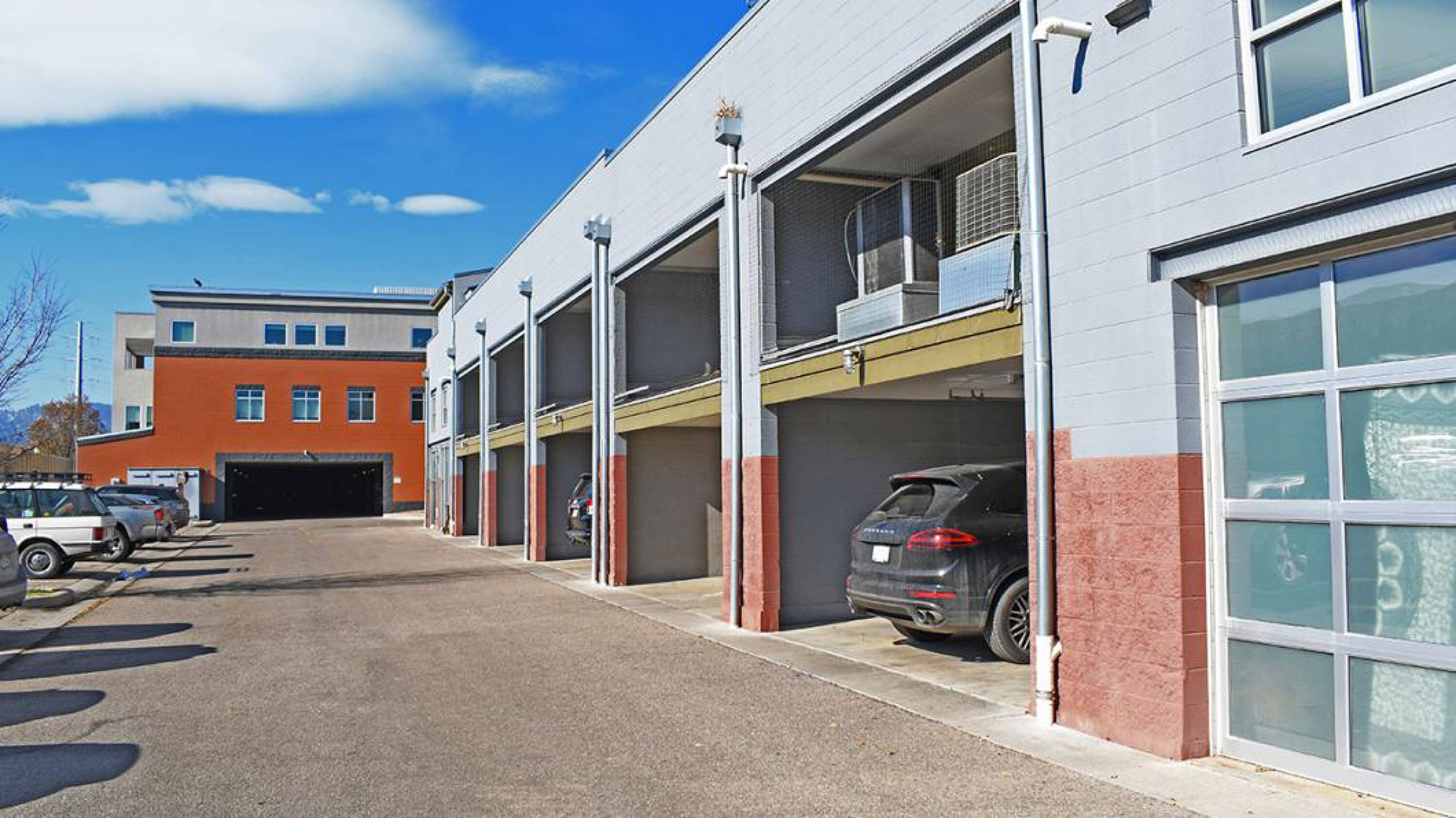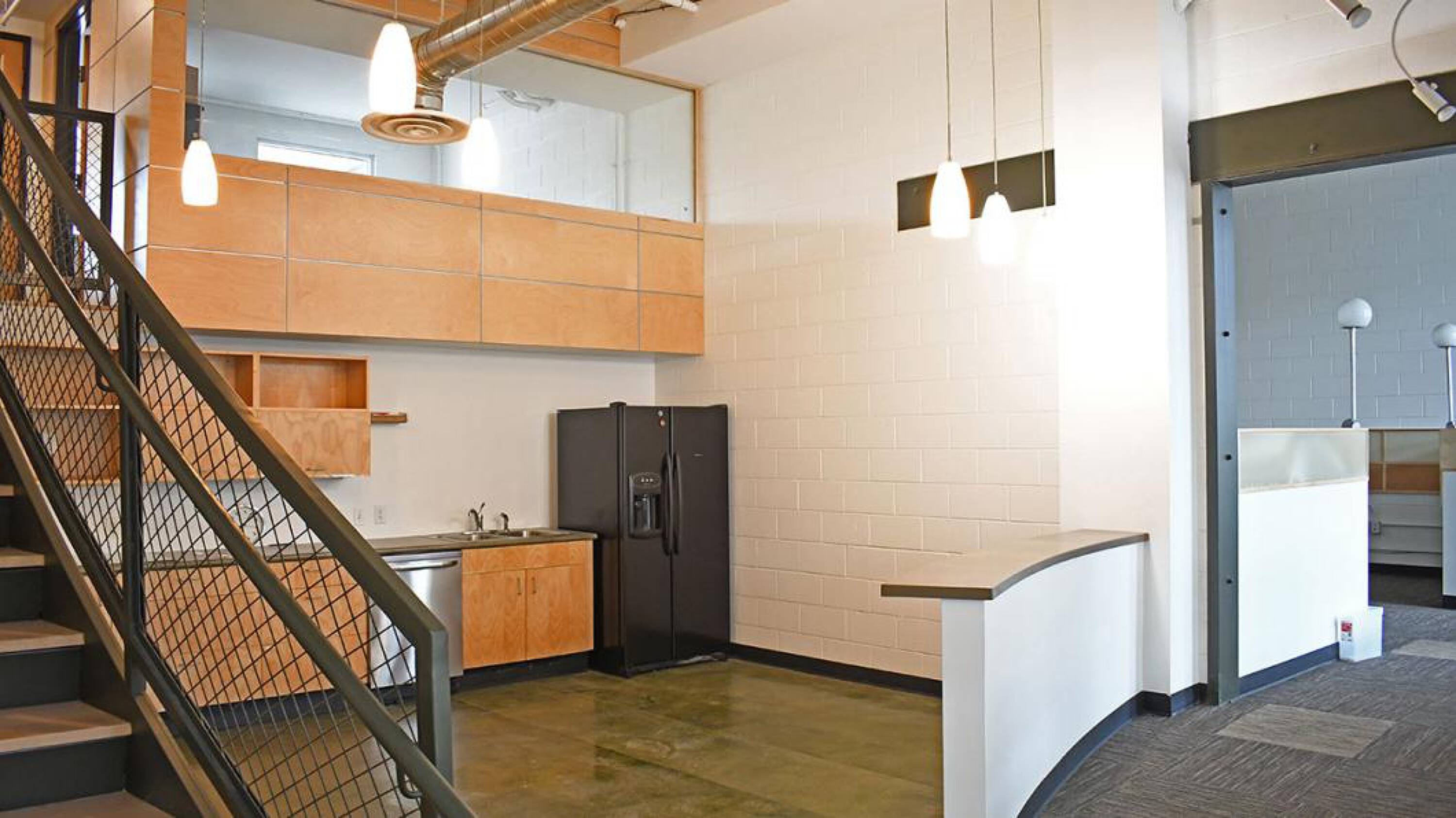 This property features: Spacious creative office space with open work areas and private offices.; Abundant natural light from large pane windows.; Unique indoor‑outdoor atmosphere created by an overhead garage door.