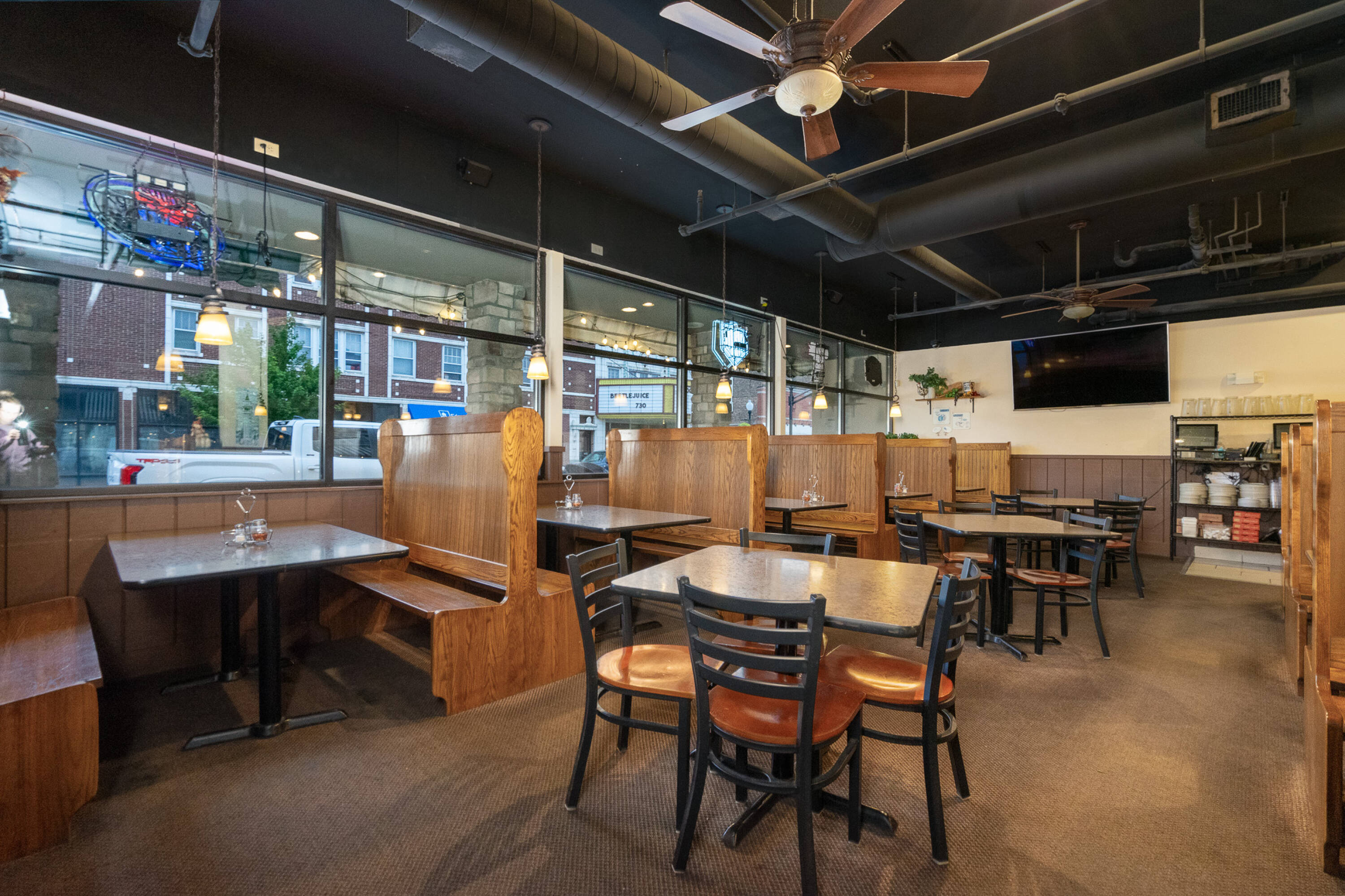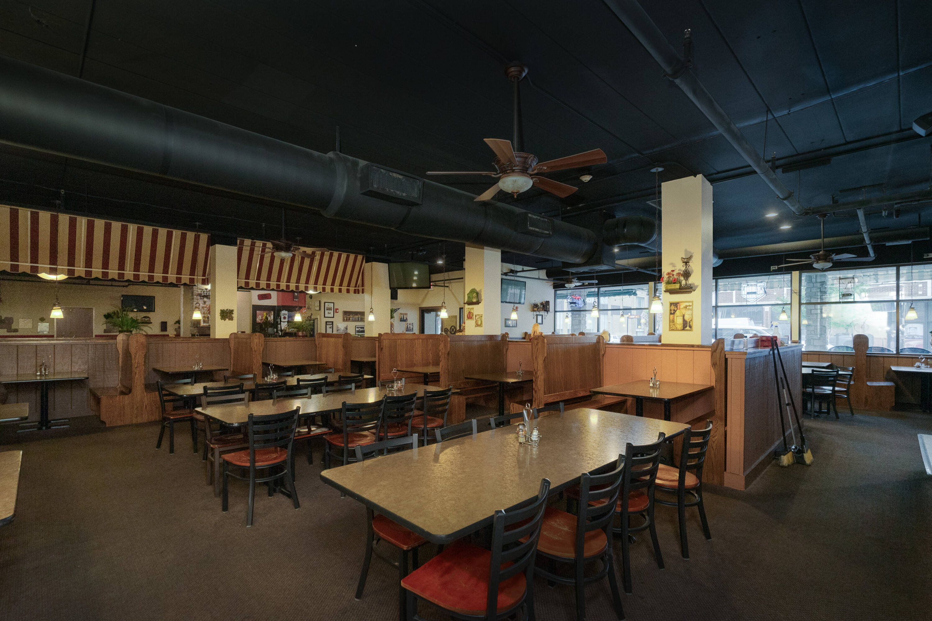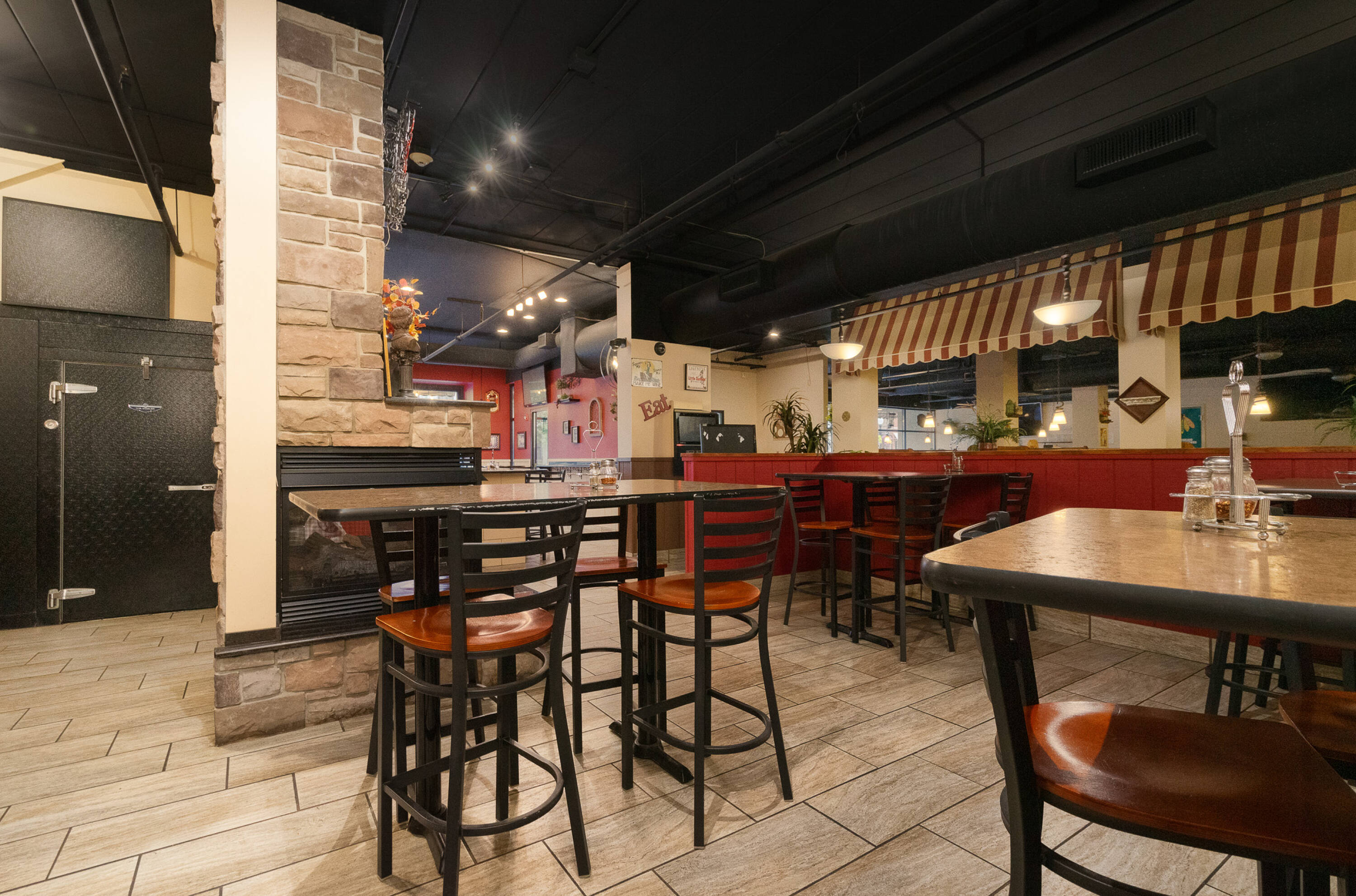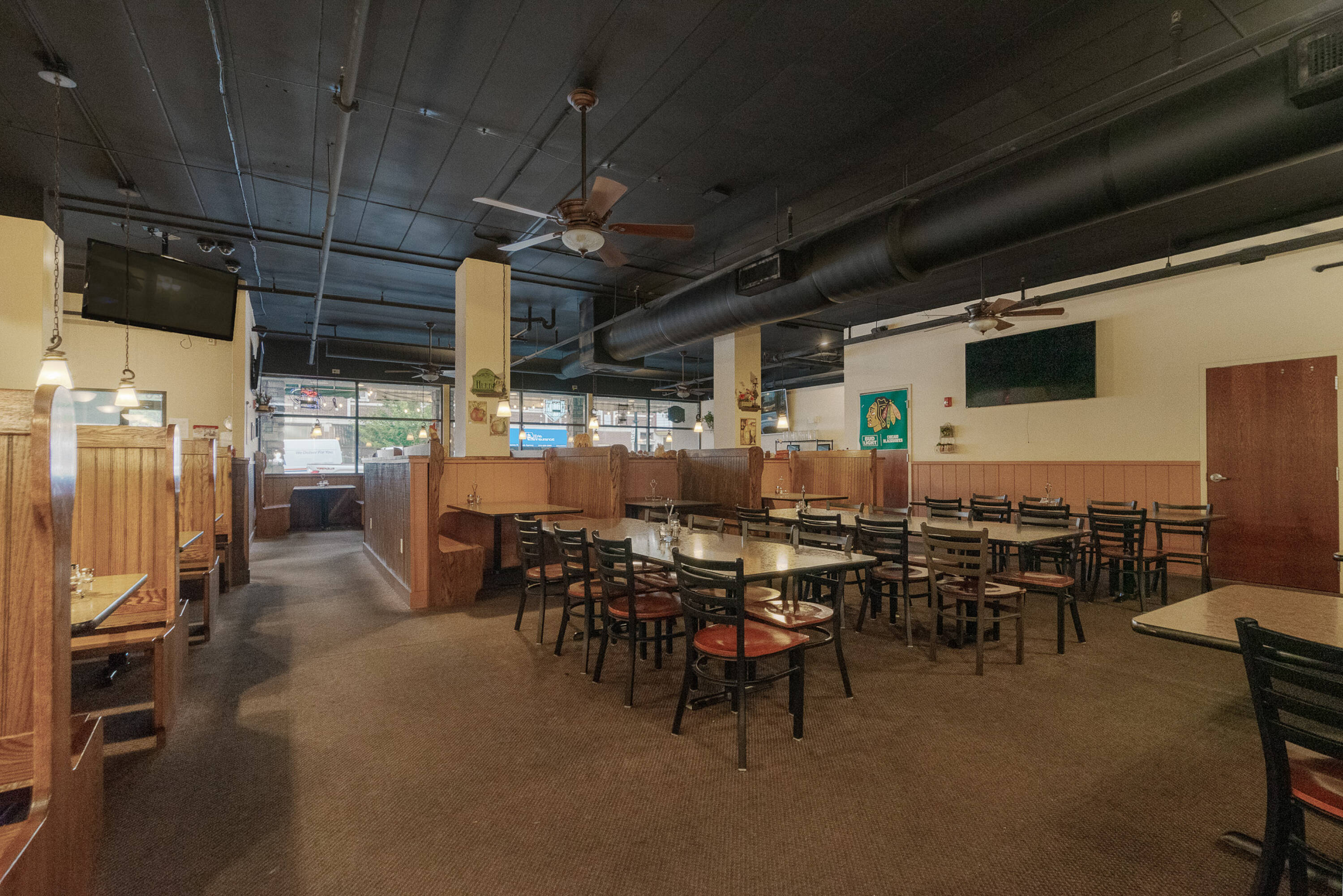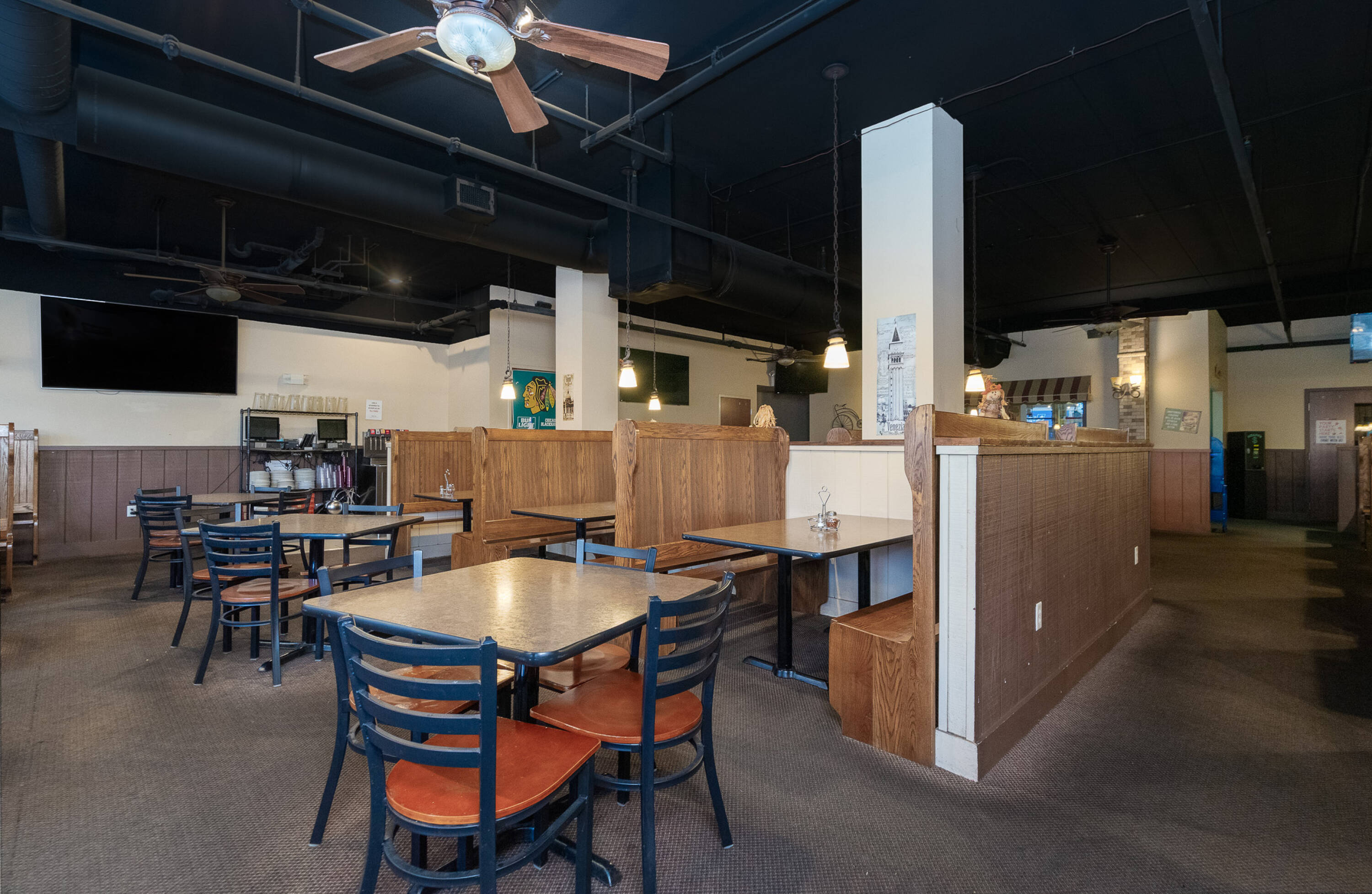 Spacious restaurant with party room, bar, and office space.