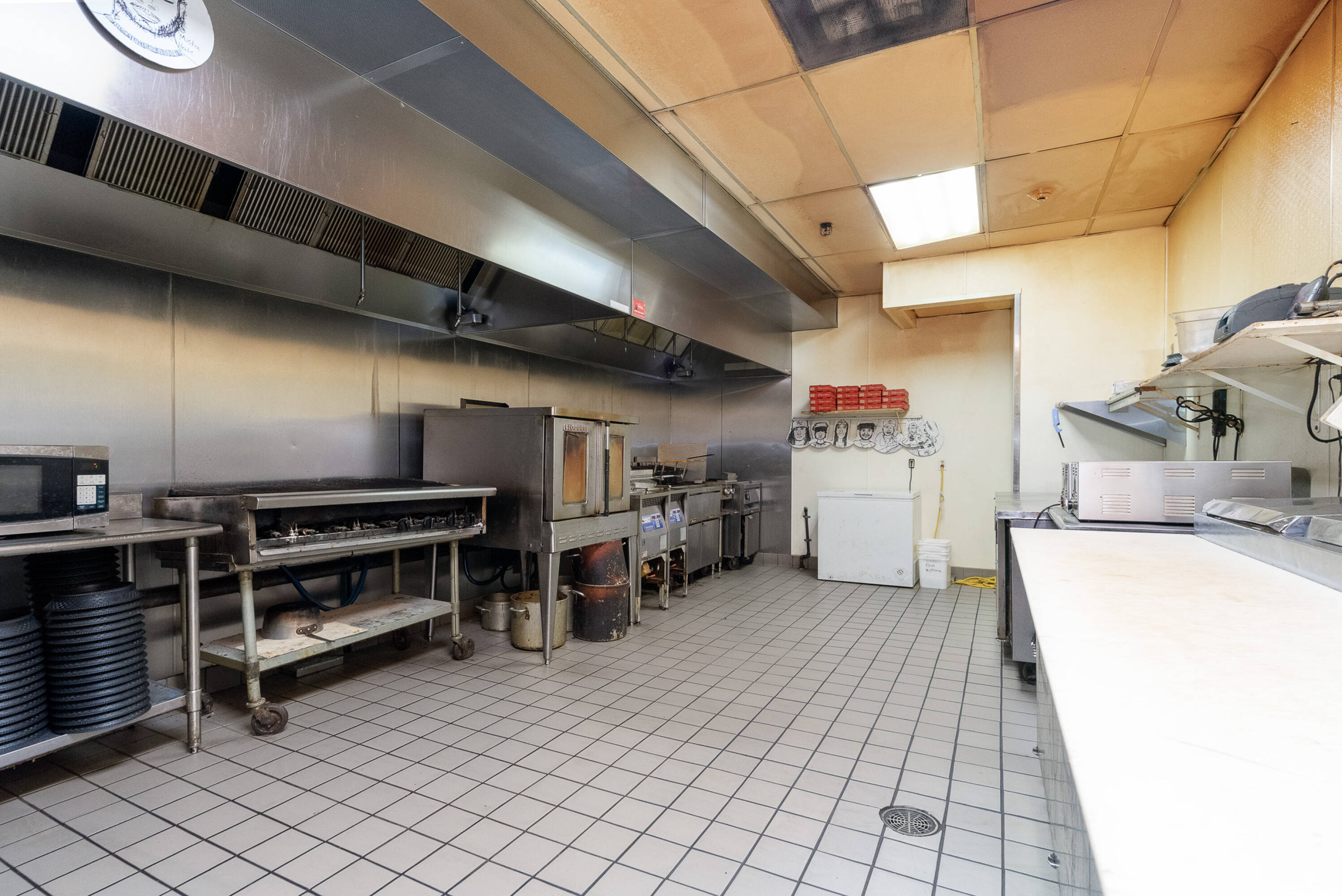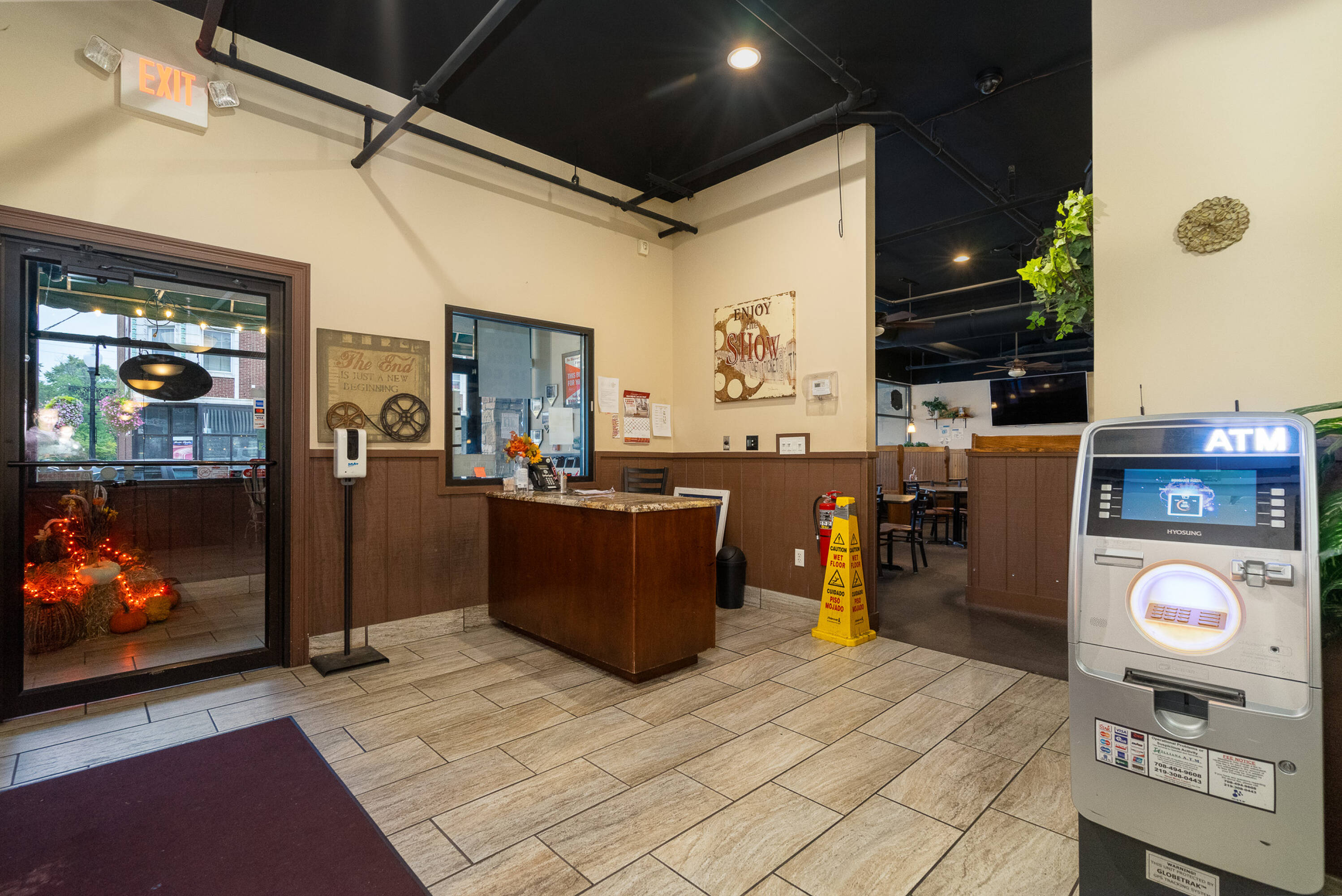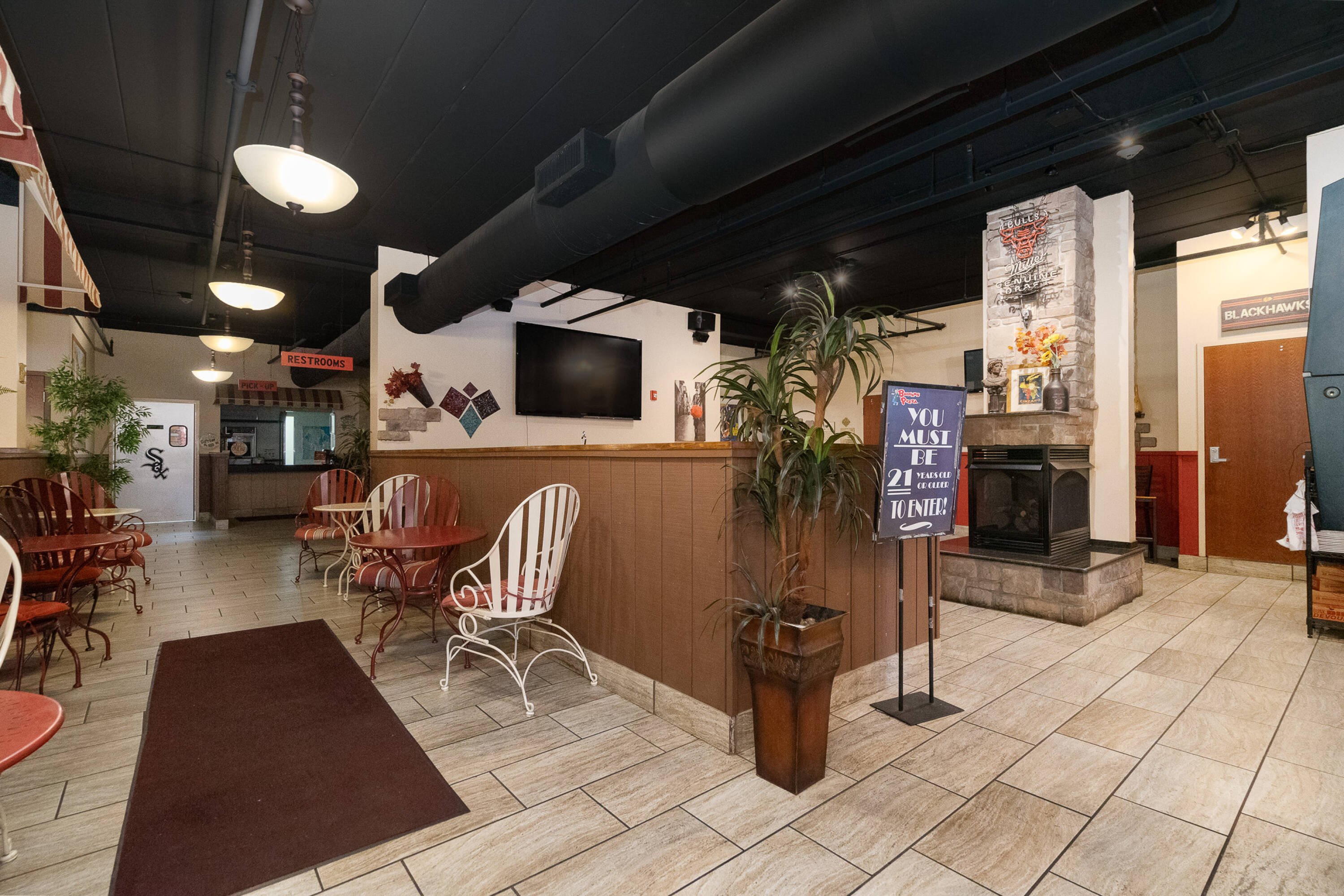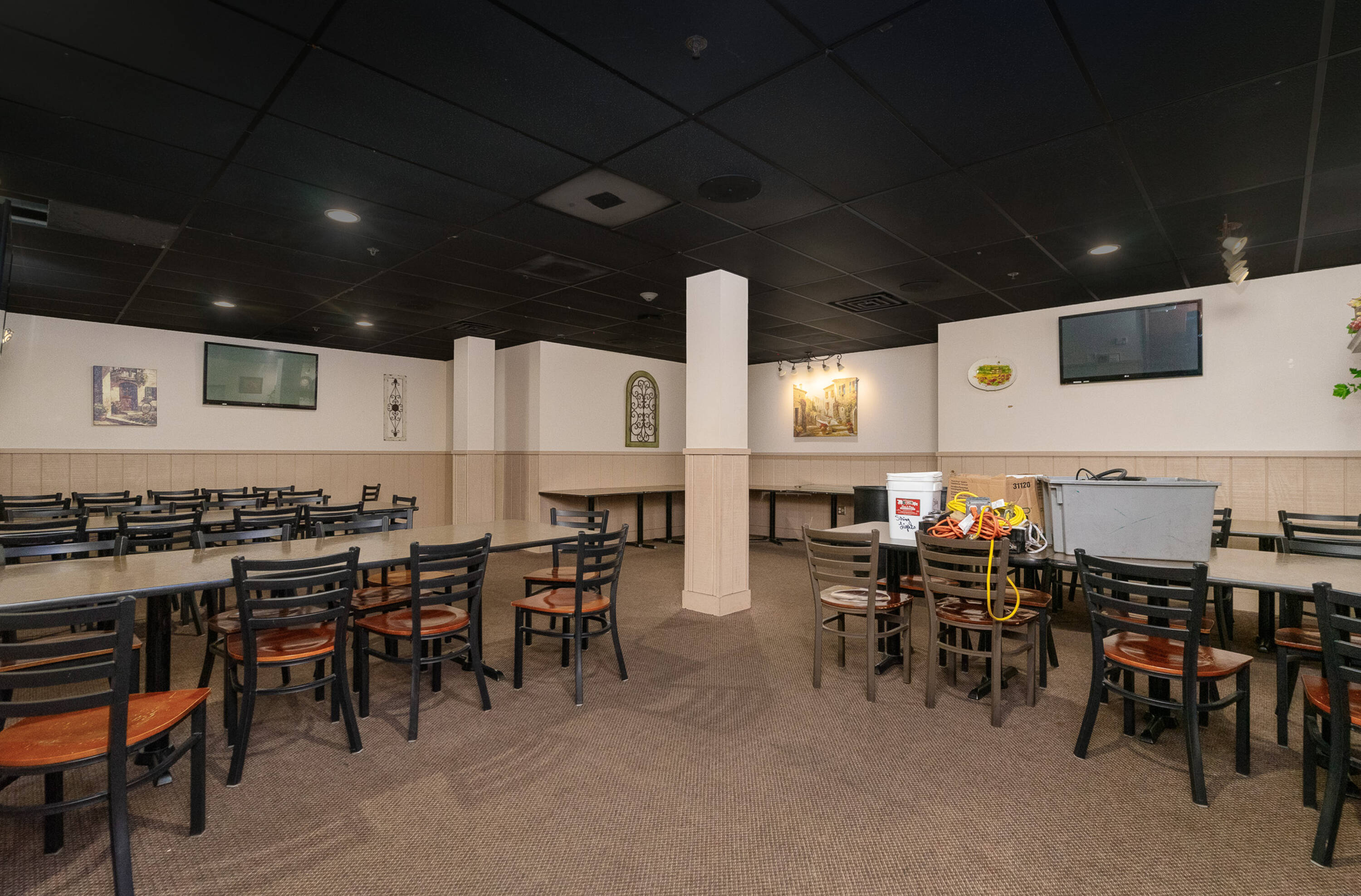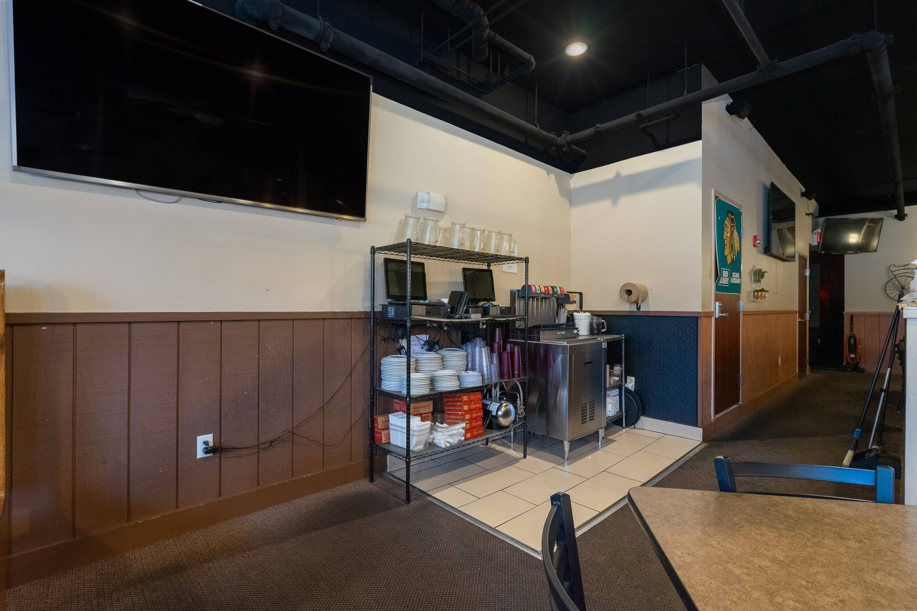 Spacious restaurant with party room, bar, and office space.
